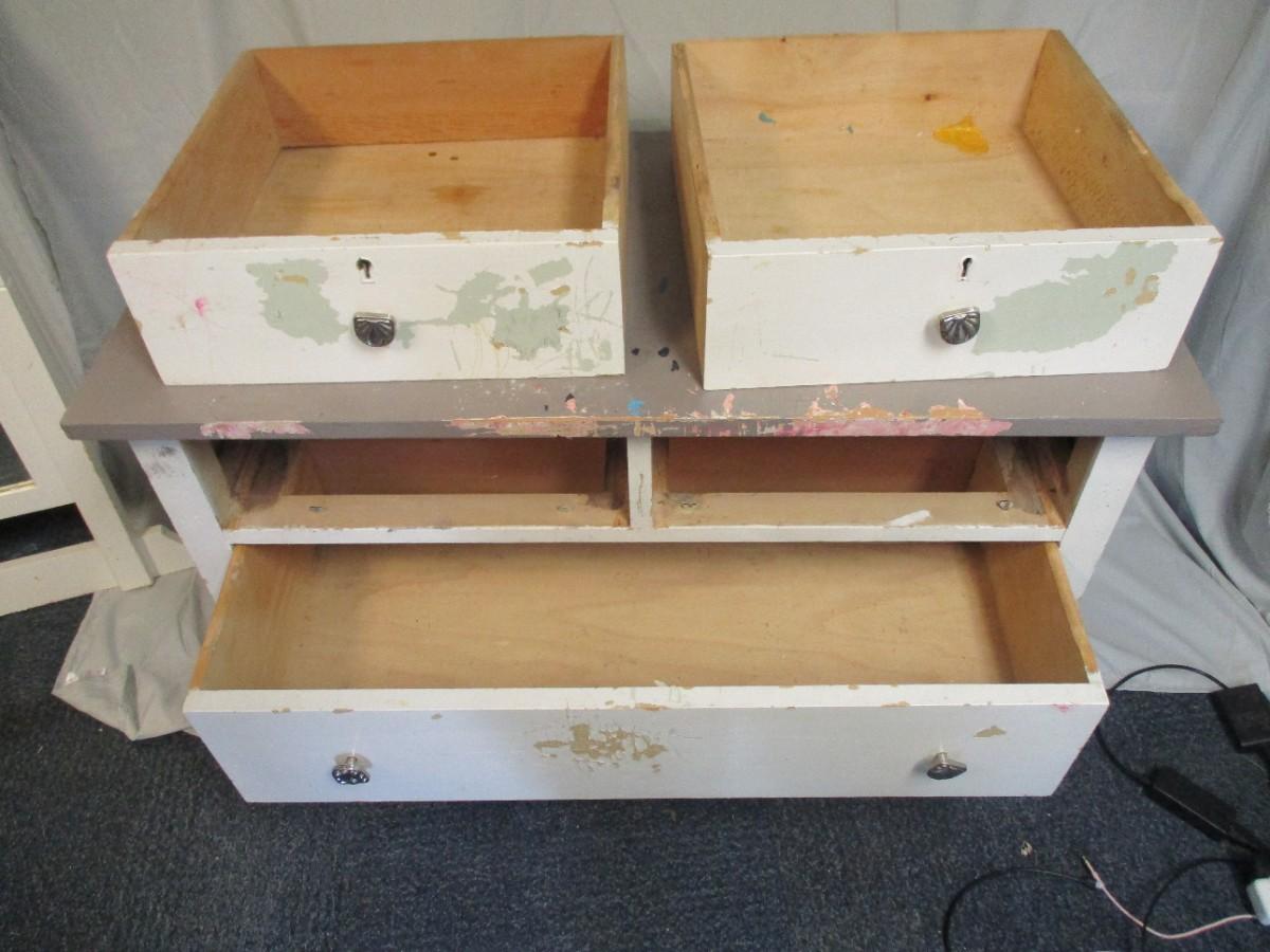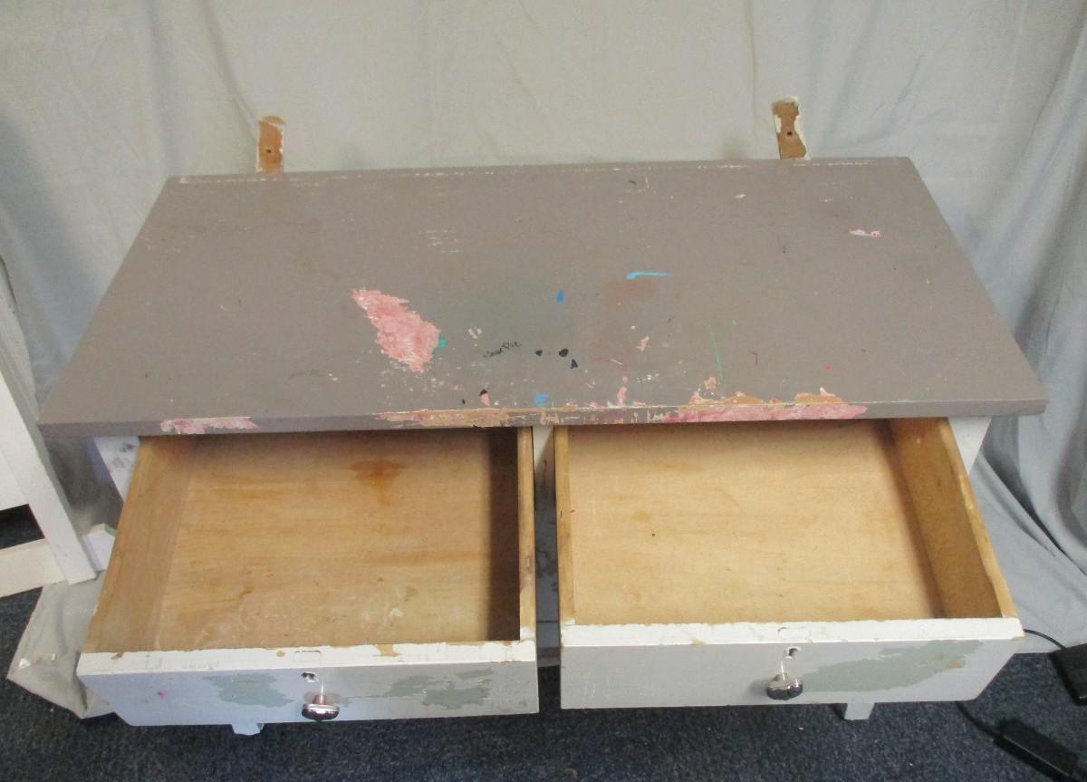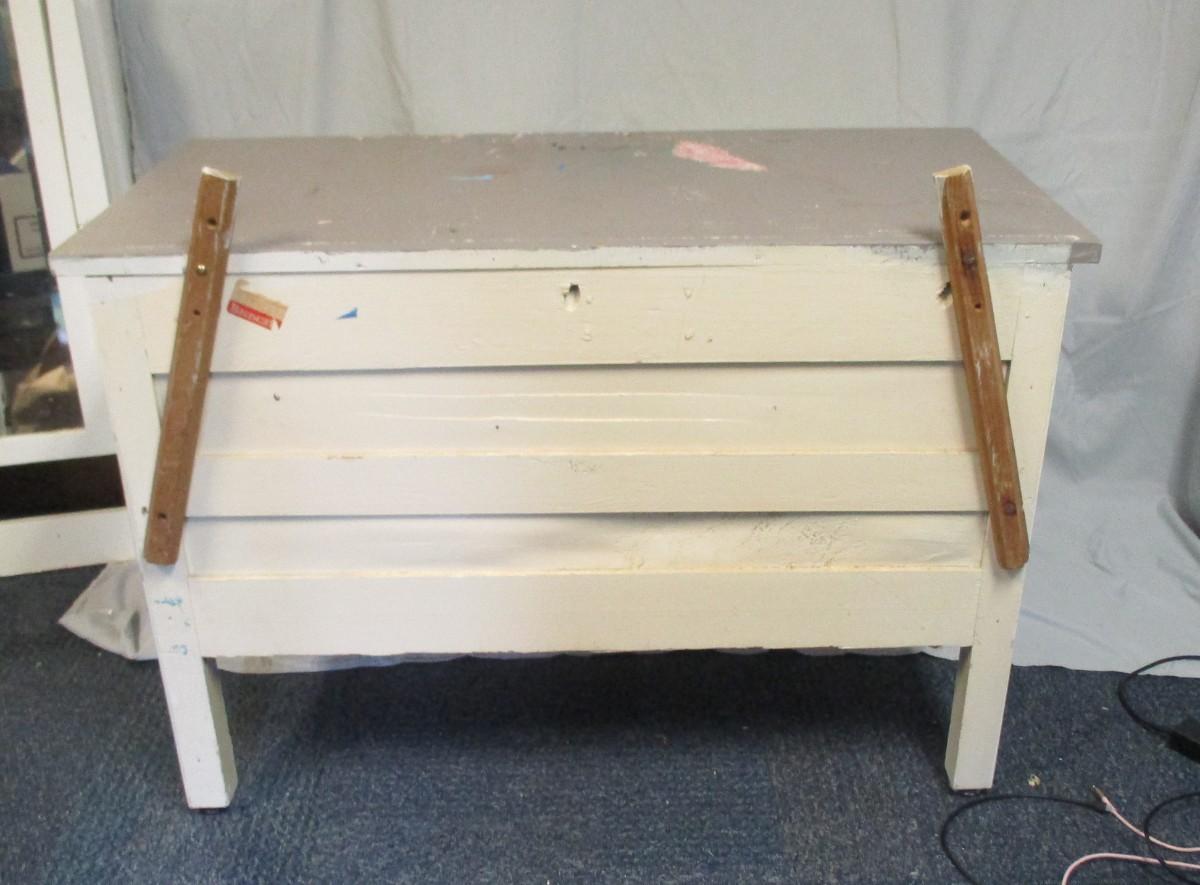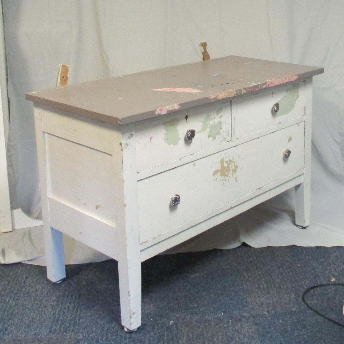 This is a solid wood dresser with a swing mirror that is in great structural condition, but needs some cosmetic love. I believe that it was done with a latex based paint. The dresser is 25" tal and the mirror adds another 40" to the height. It is 18" deep and about 37" wide. This could be a stunning piece with a little bit of cosmetic love!