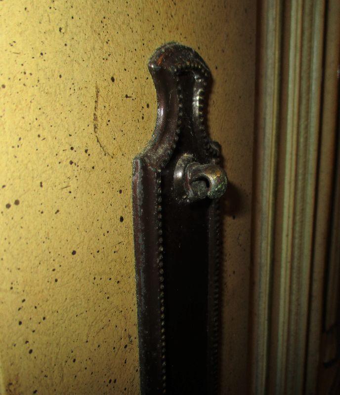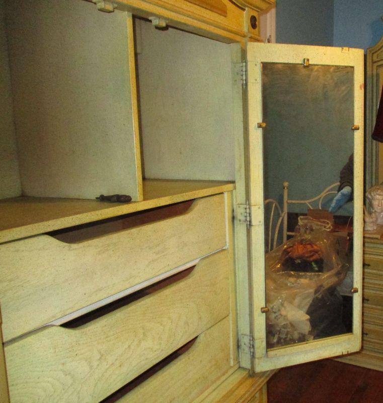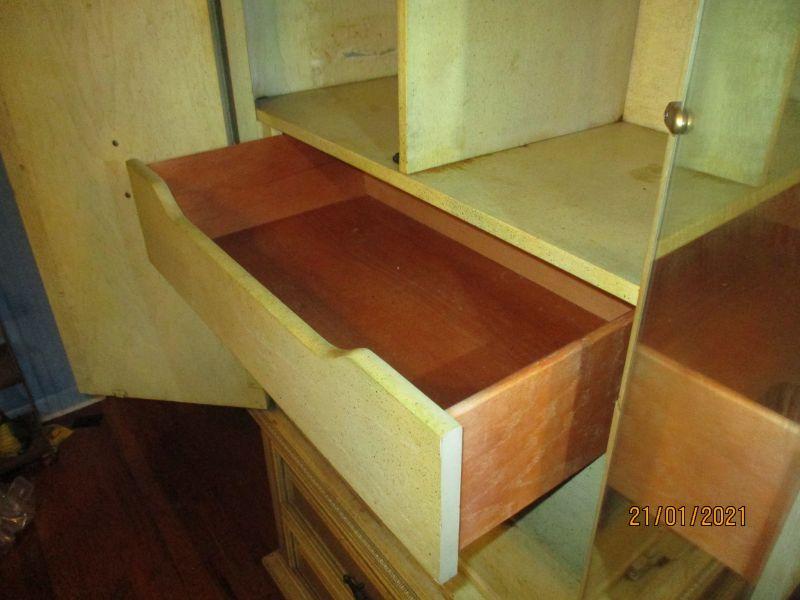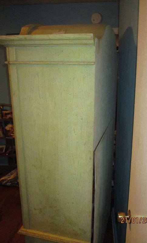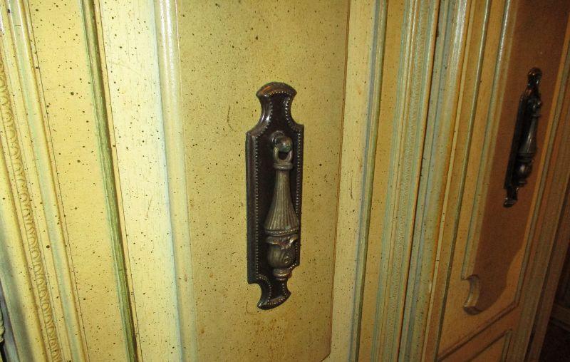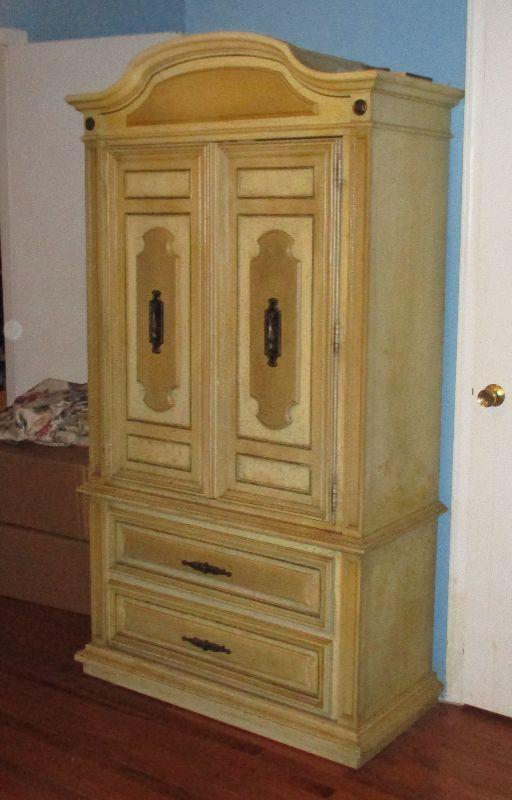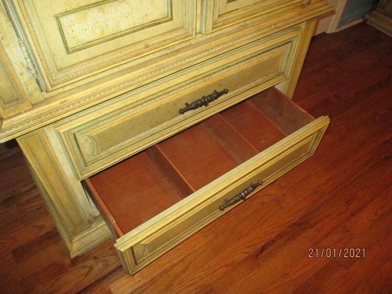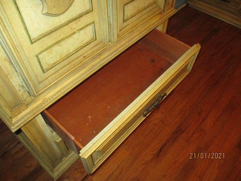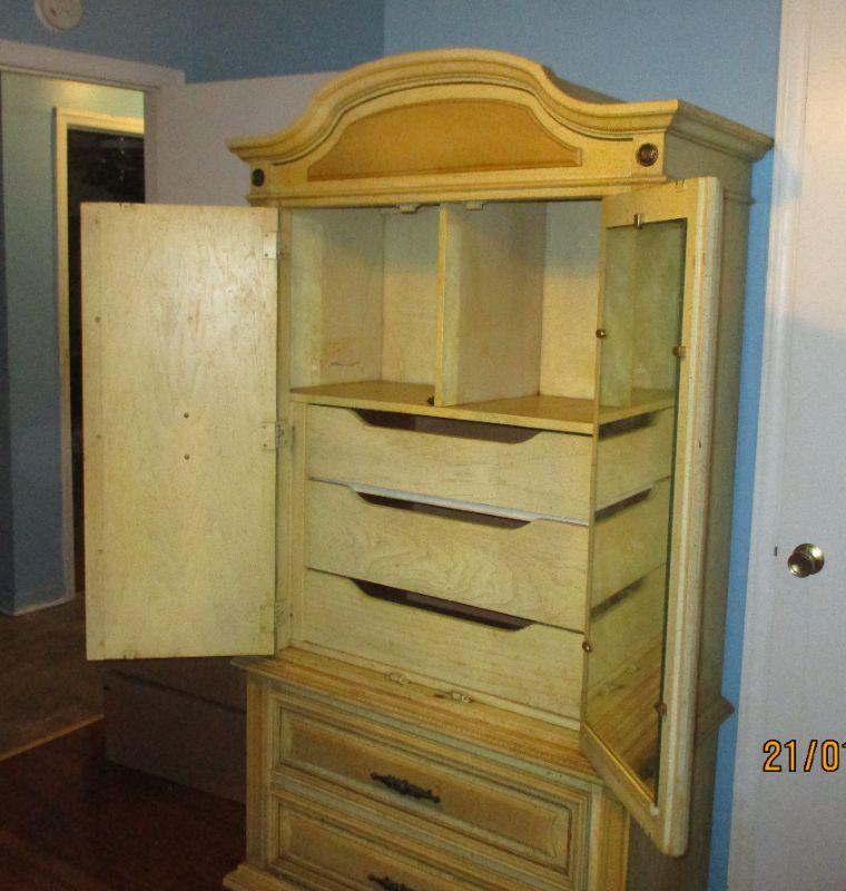 This matches lots 3, 5, and 6 and well as a dining room set later. Solid wood armoire with a divided drawer at the bottom and three pull out drawers at the top for a total of 5 drawers. The left door pull needs to be better attached - the hook that holds it on has stretched out and the pull falls off, but the pull is here and it's an easy repair. It has a mirror on the inside of one door. The wood backing at the bottom has come loose, but it just needs to be tapped back in as the nails are still there and it's not damaged. It's in great shape. About 74" at the highest point, 39.5" wide, and 18.5" deep.