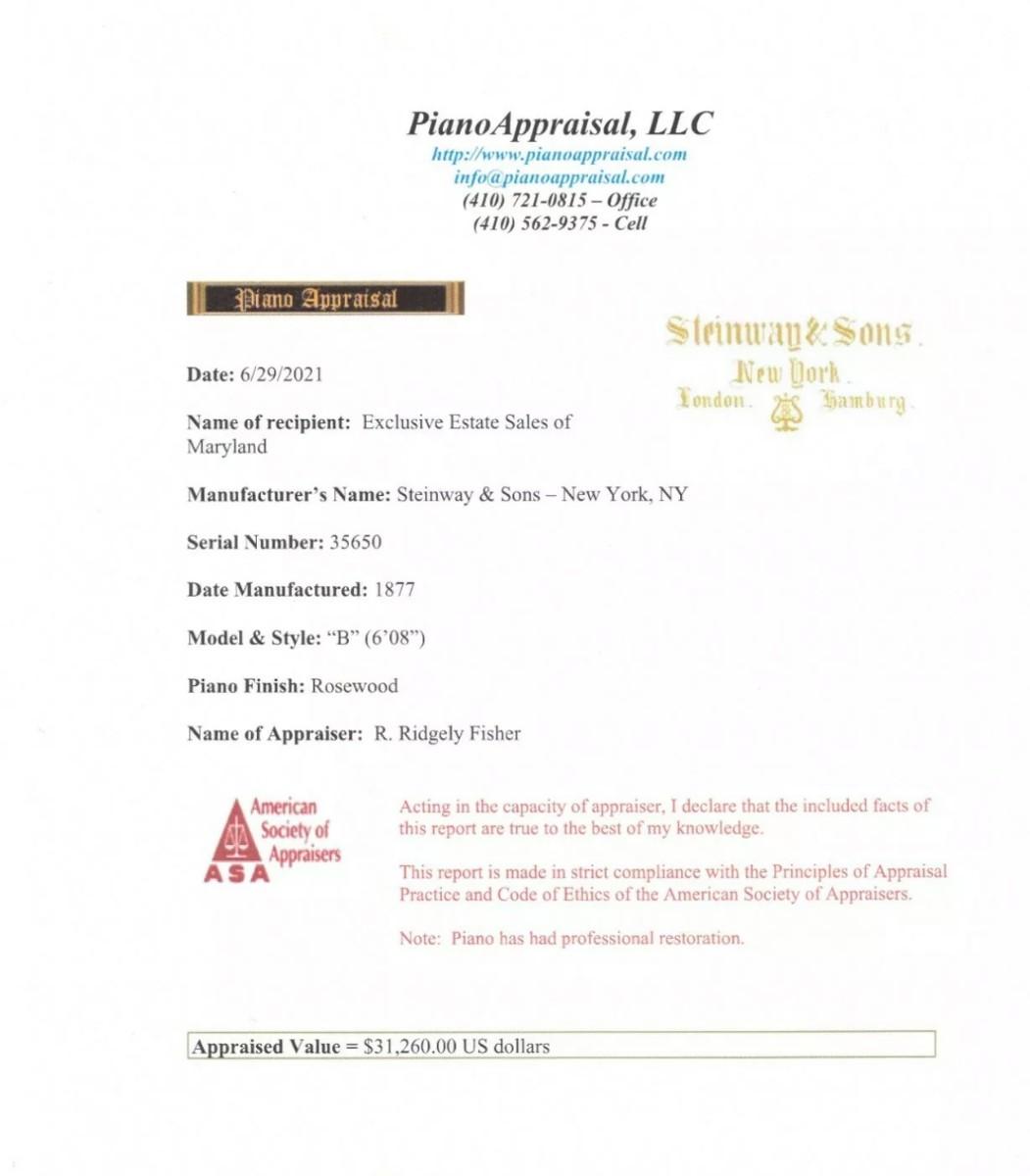 Lot 1- Ca 1877 Steinway and sons piano model B Serial #35650 appraised $31,260.00 with stool