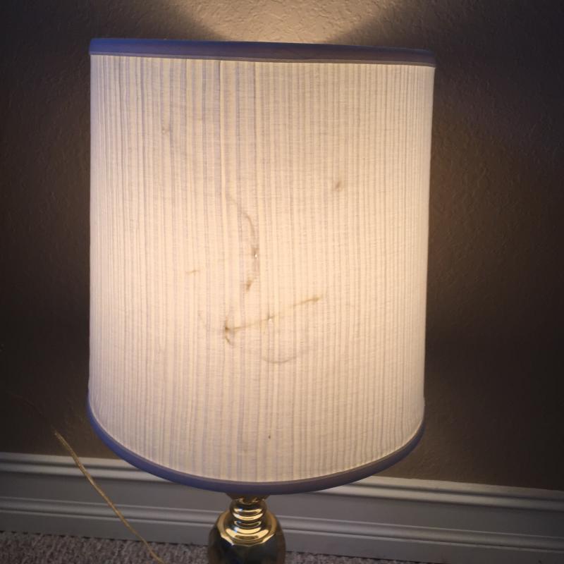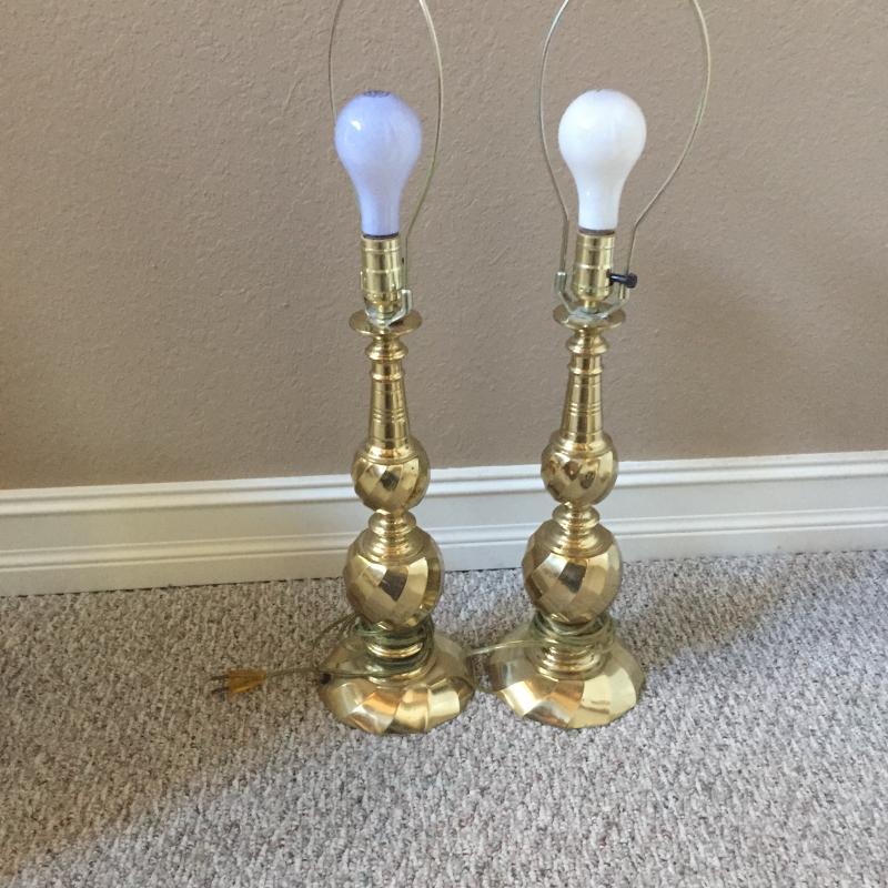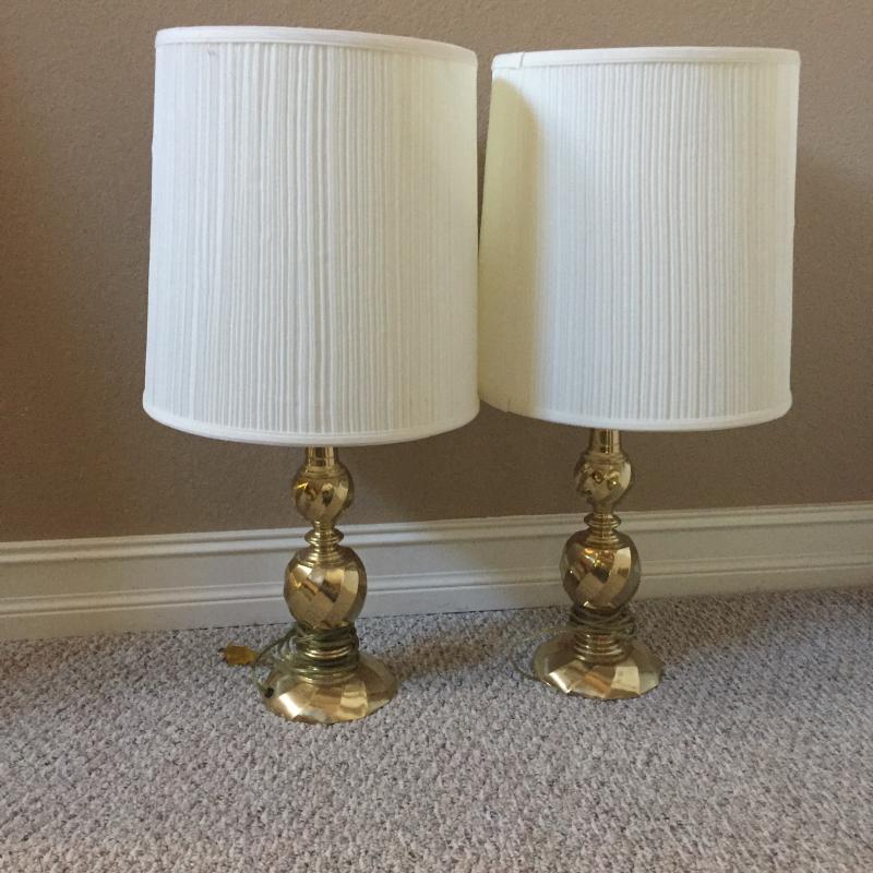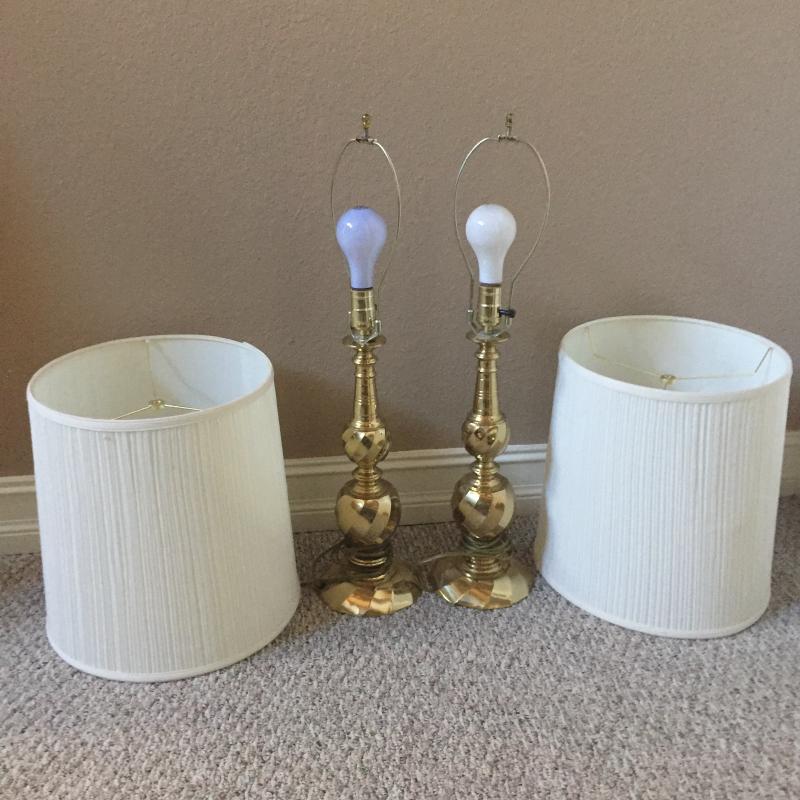 Pair of brass table lamps that add warmth up any room. Lamps measure 27” tall. One lampshade is slightly damaged on inside-see pictures. Local Pickup Only