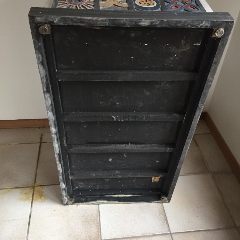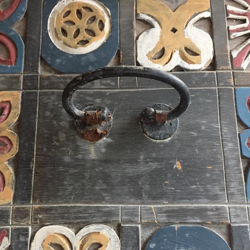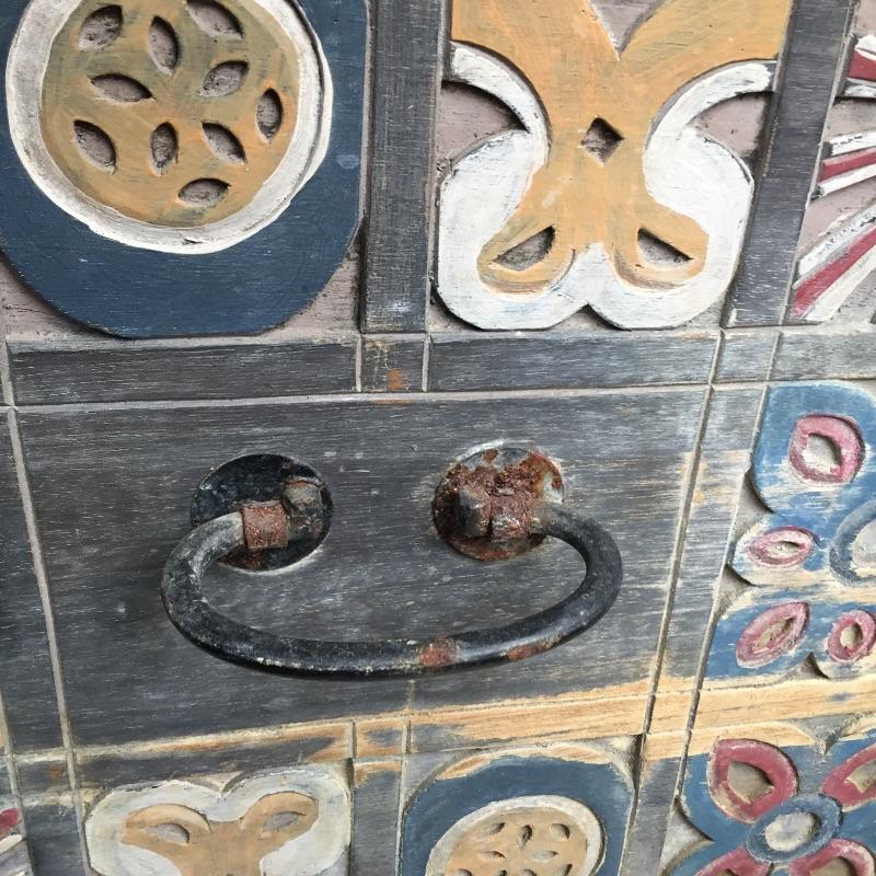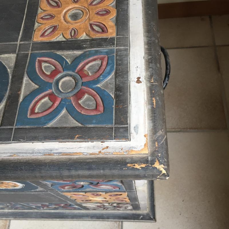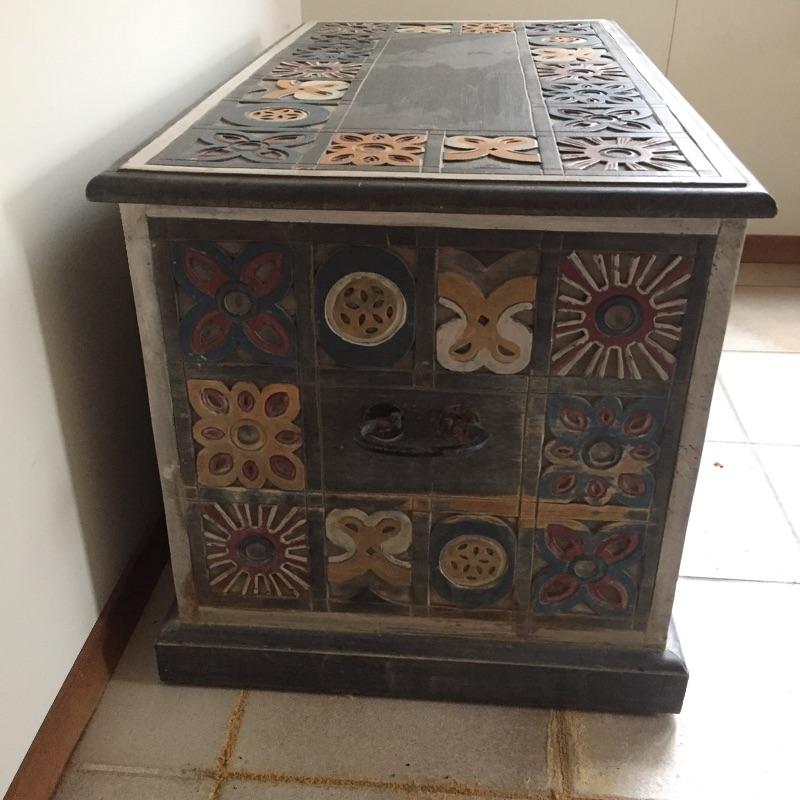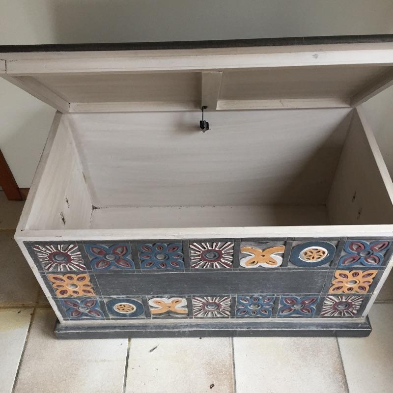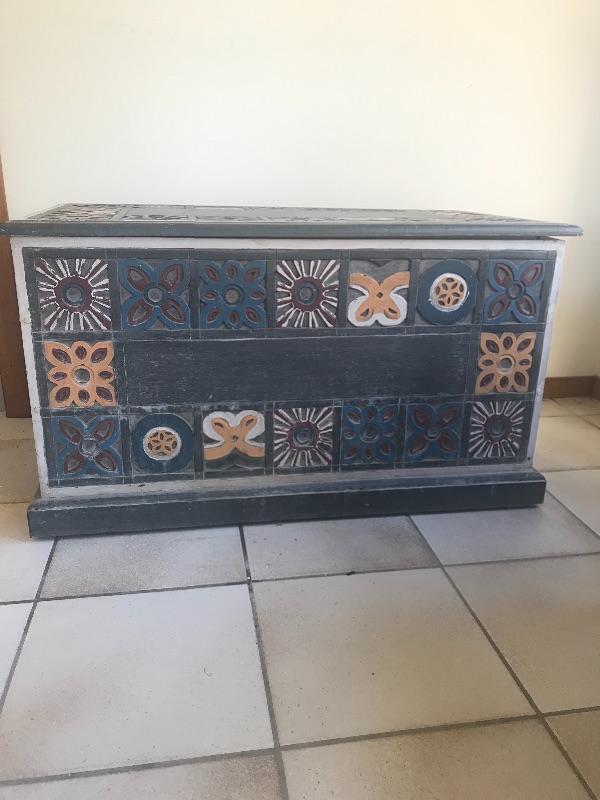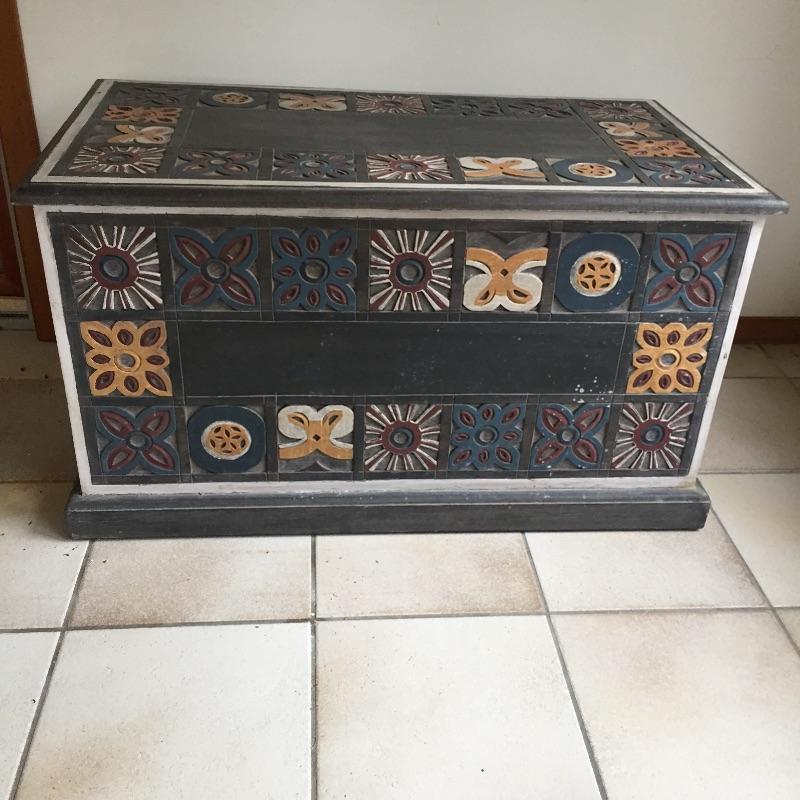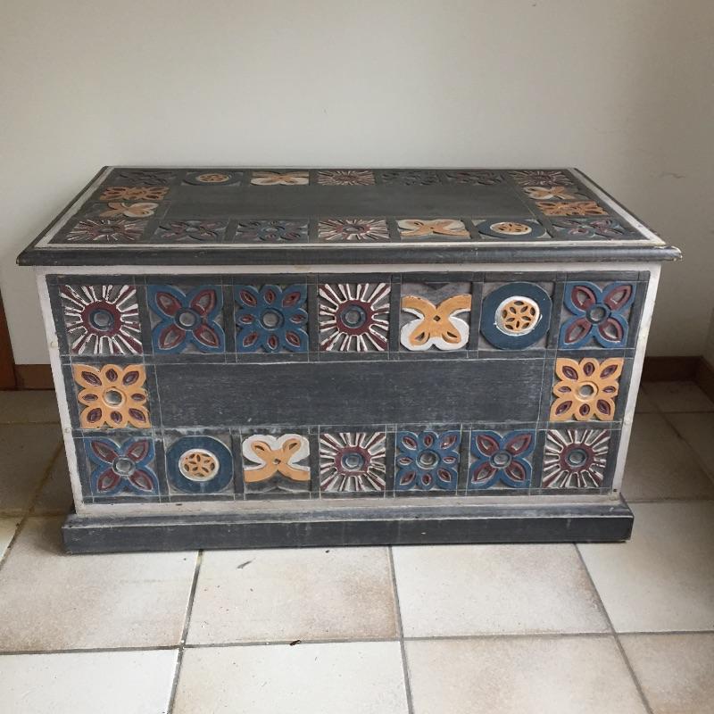 Charming wooden trunk with carved designs. Brighten up your room and have extra storage with this colorful trunk. Trunk Measures 20” x 36” x 20”.
