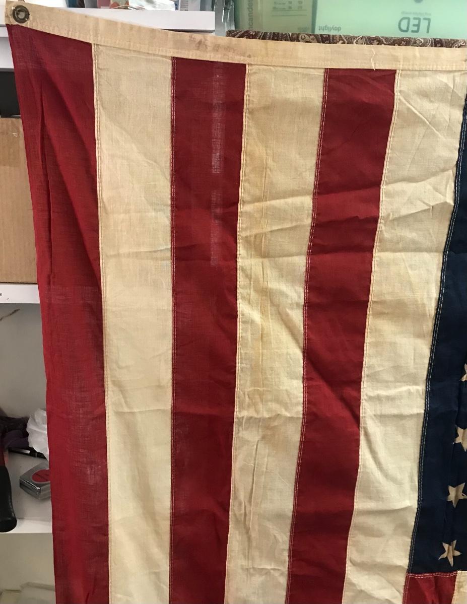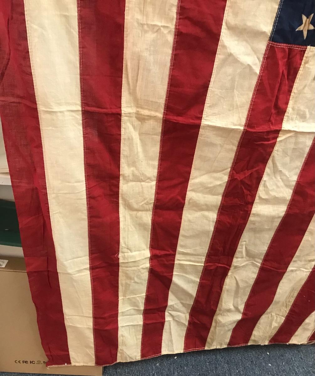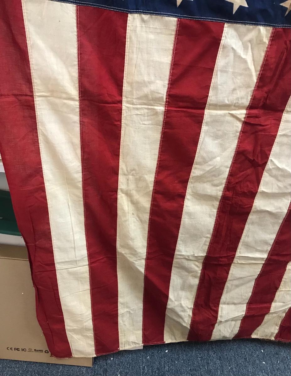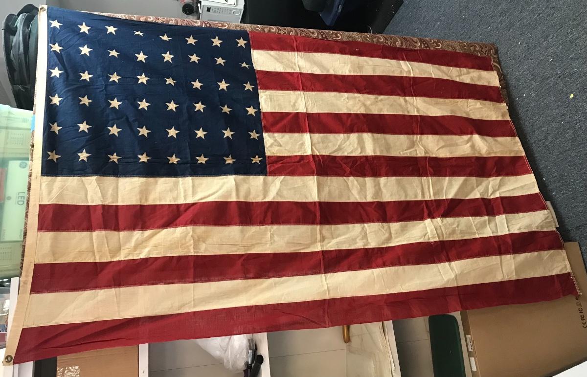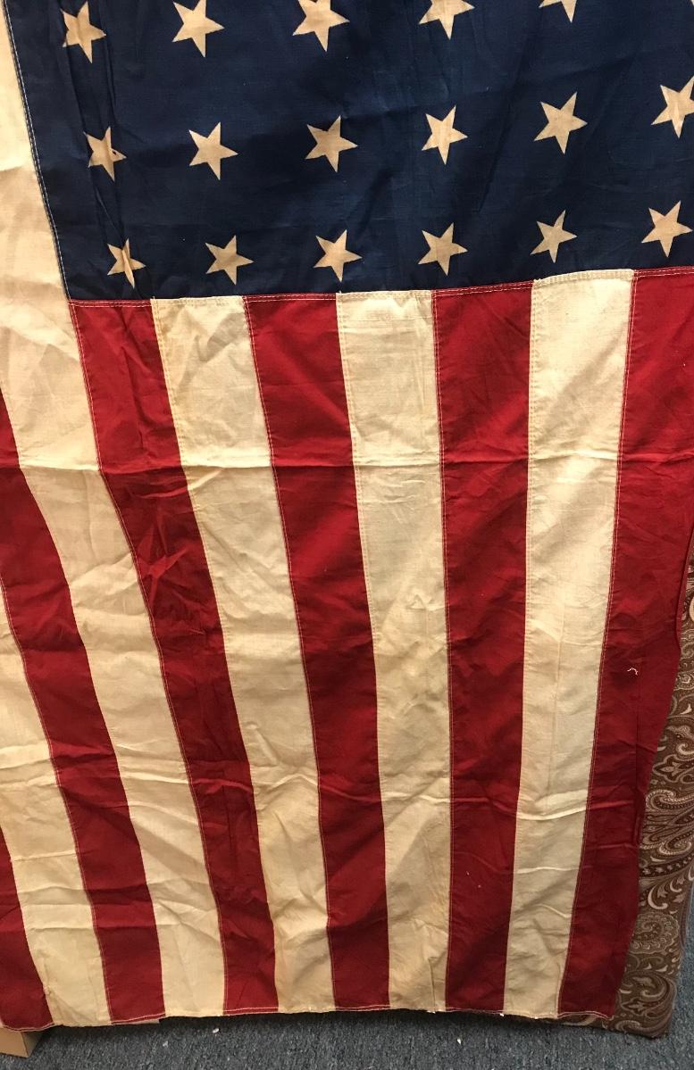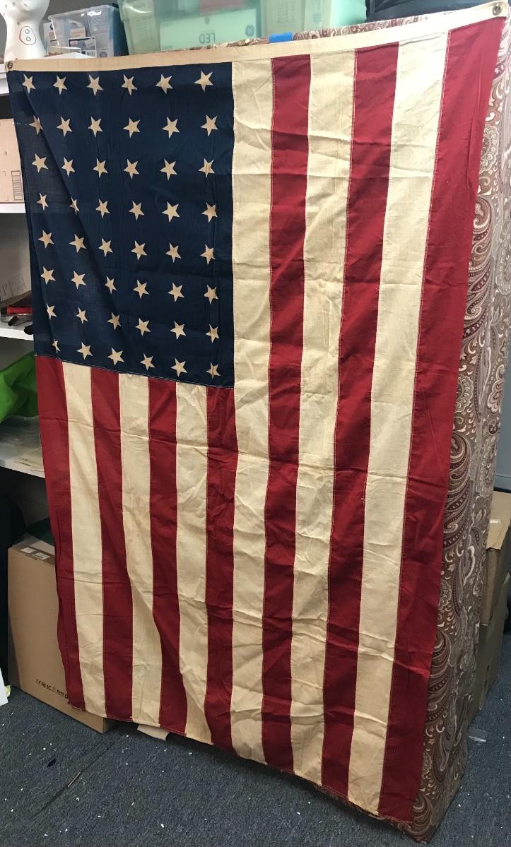 Vintage 48-Star American Flag. Approximately 4'X6'.Please see all pictures as they are the best representation of the items. The pictures show condition, measurements if taken, and what is included in the lot. Due to the large amount that we photograph and the time frame, we are not always able to take measurements. All items unless noted, are pre-owned and have been used. Please bring packing materials for your items. If you purchased furniture, you must bring help. We do not allow one person to carry large furniture out on their own. Bring help, tools and a truck for your personal safety. Company policy. Thank you.