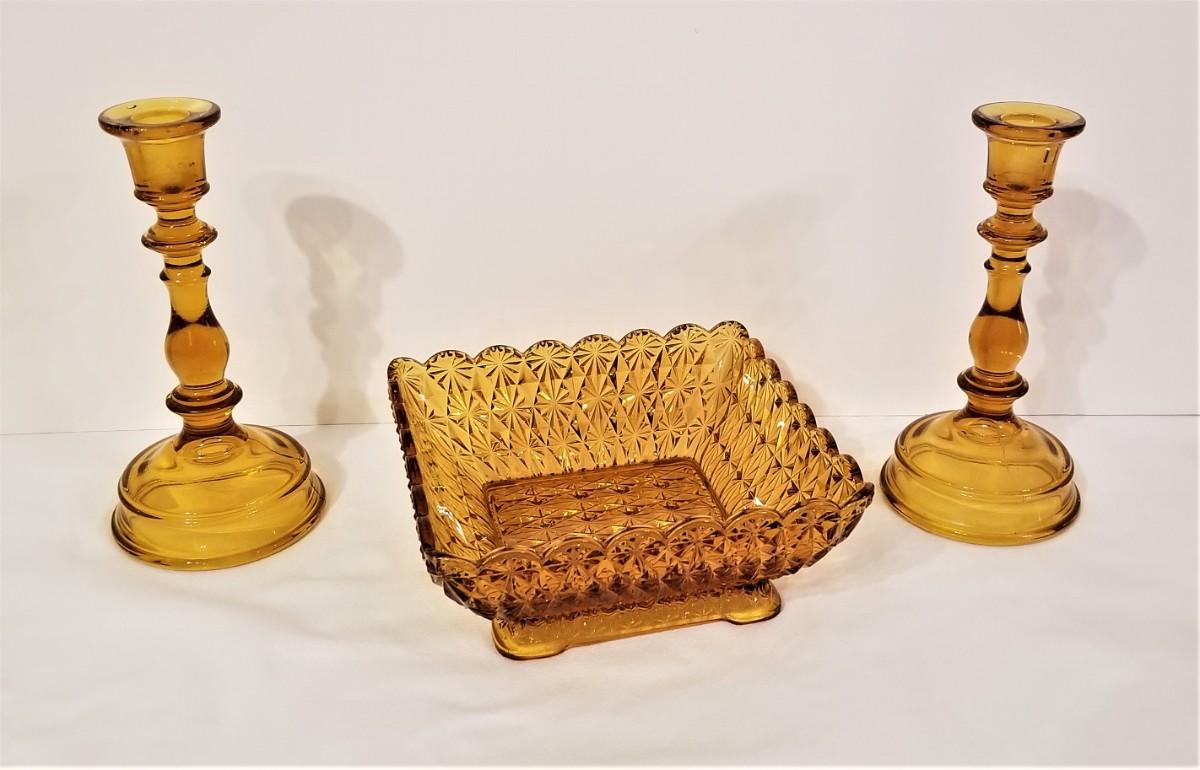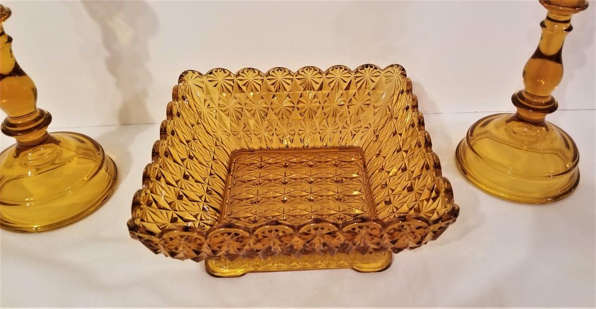 Nice vintage amber pressed glass trio - Center Bowl and two Candlesticks. The sticks are 8.5" tall - the bowl measures 7.5" x 7.5". Good condition.