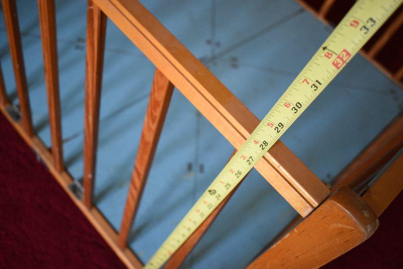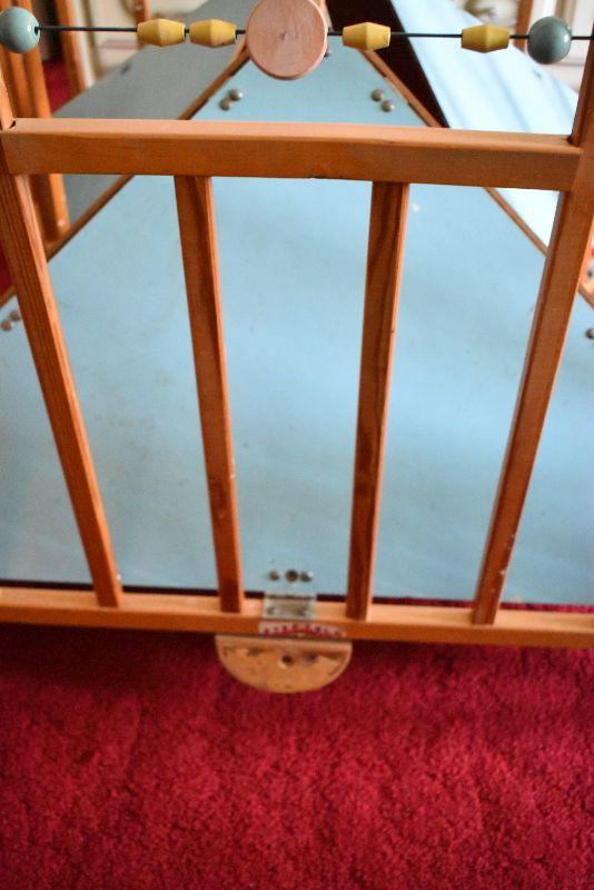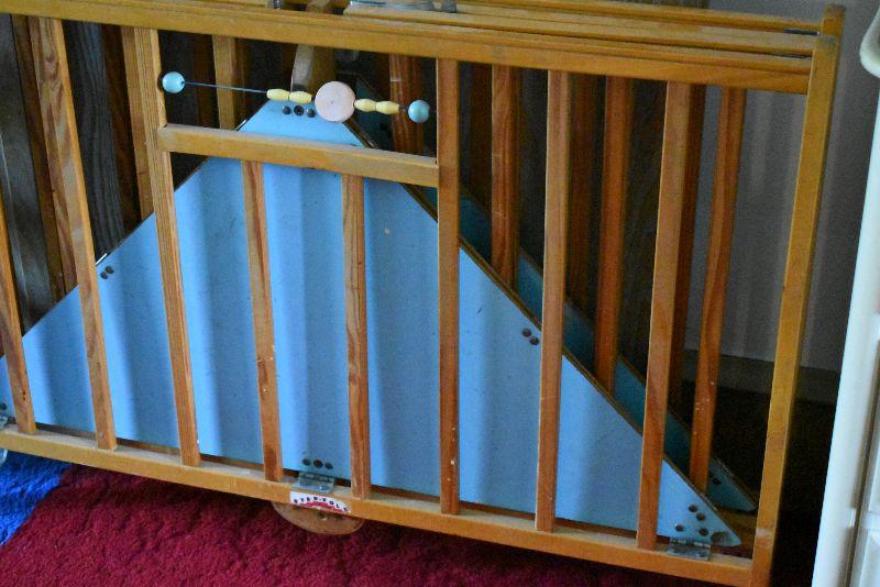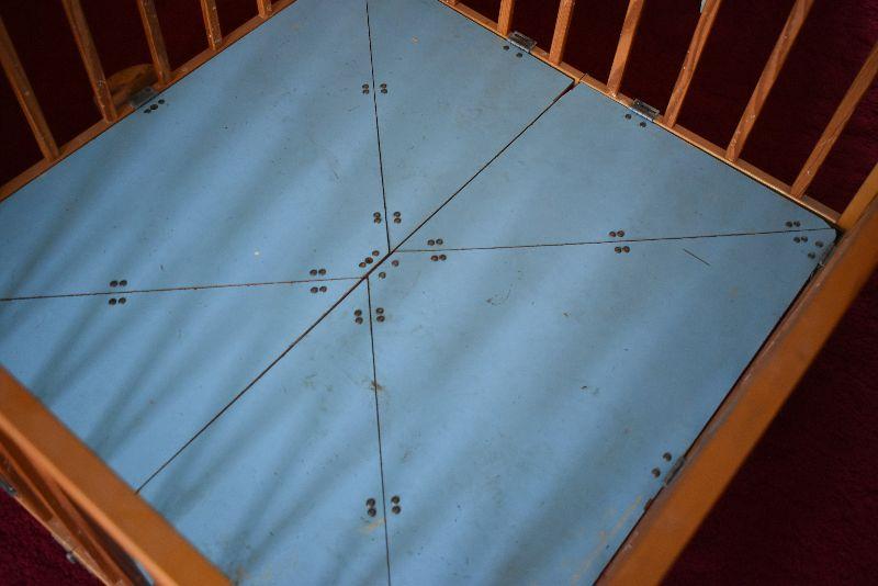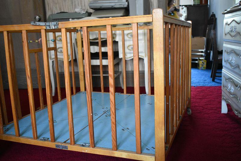 Wooden playpen with easy one step closing. Does not meet today's safety standards, use as decor only. Move from second floor.