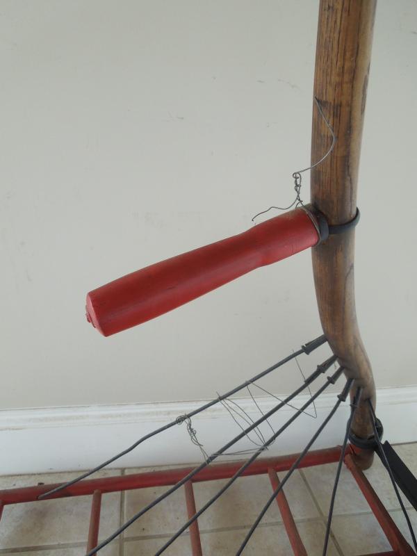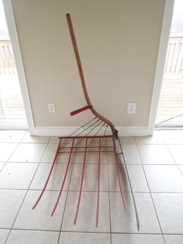 This is a 51" H x 48" L x 29" W wood and metal hand held farm implement. The handle and tines are wood. There is a metal blade or scythe that is not very sharp. In good solid condition.