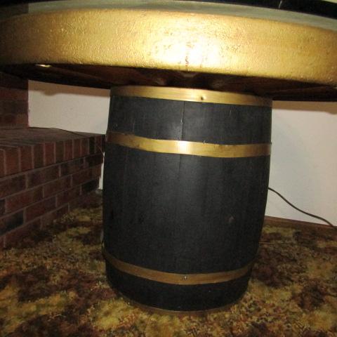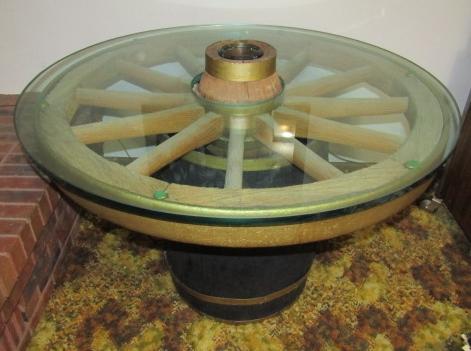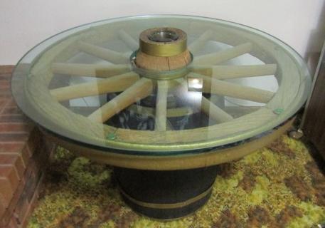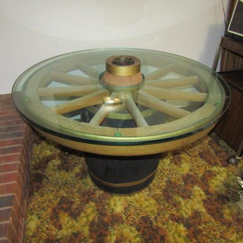 WAGON WHEEL ON A WOODEN BARREL AND A GLASS TOP