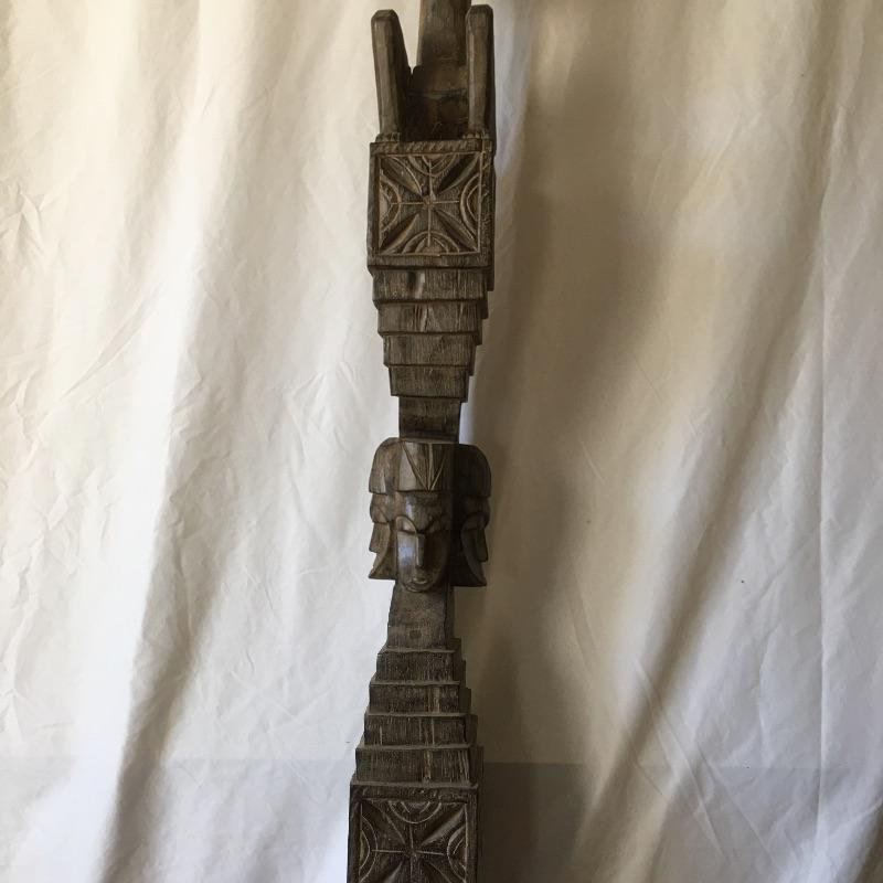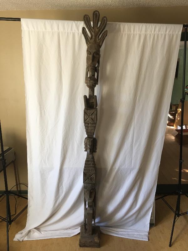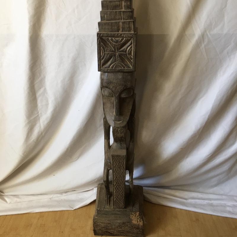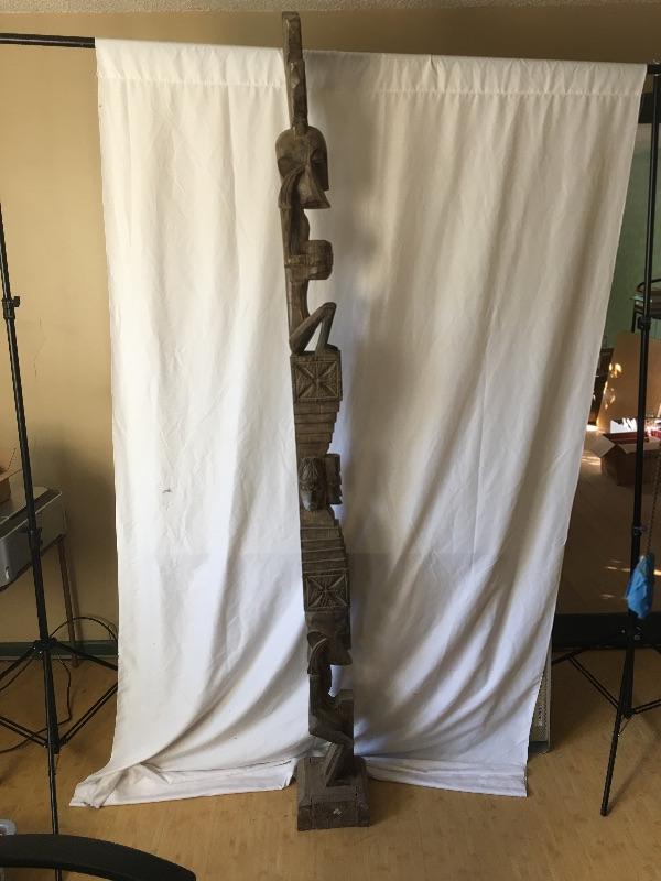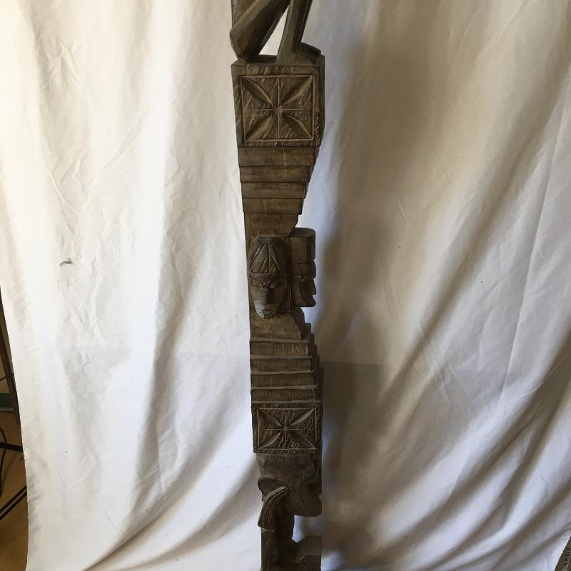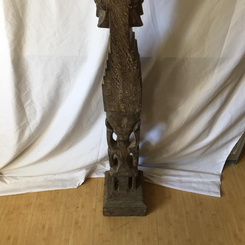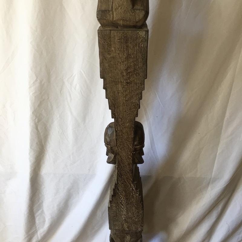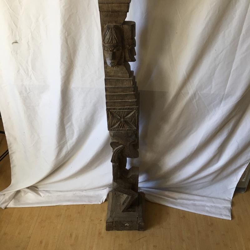 Wooden Totem pole measures 8.5” x 8.5” x 88”. Unique piece will be a great addition to any room in your home. Made of a light weight wood material. Pole has some damage on base and one arm has split, see pictures.
