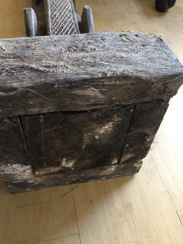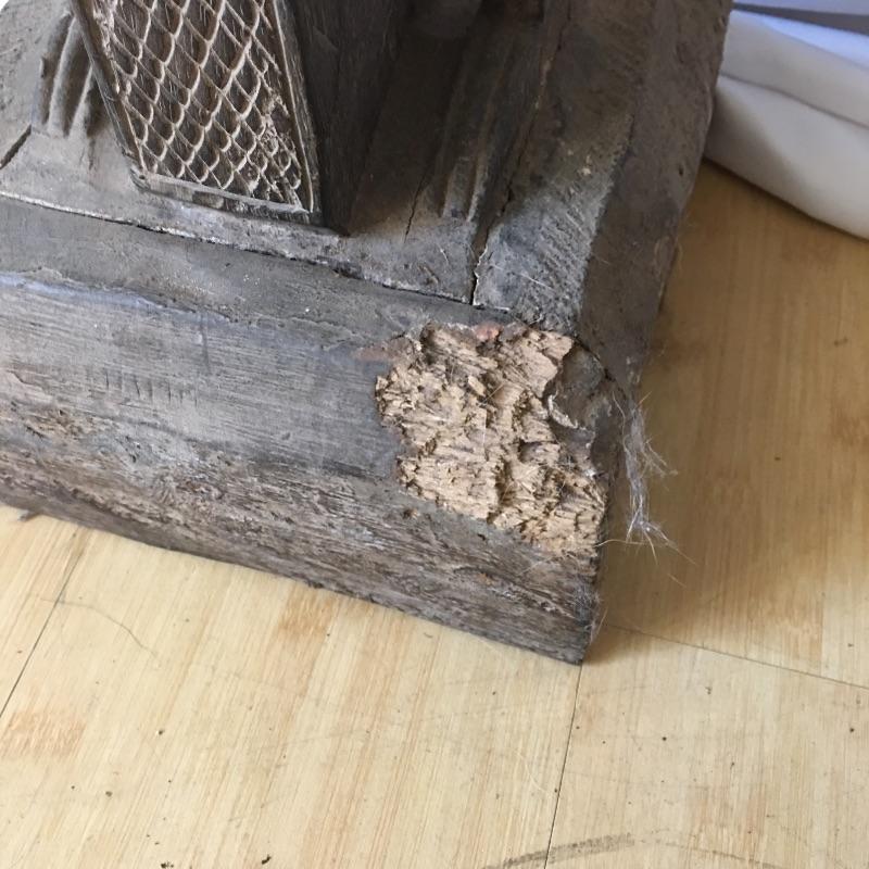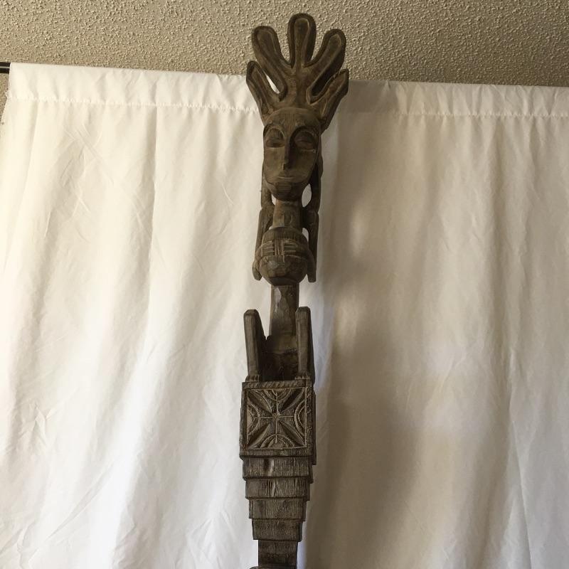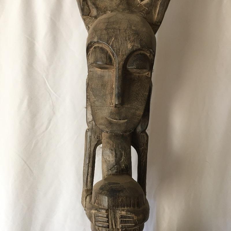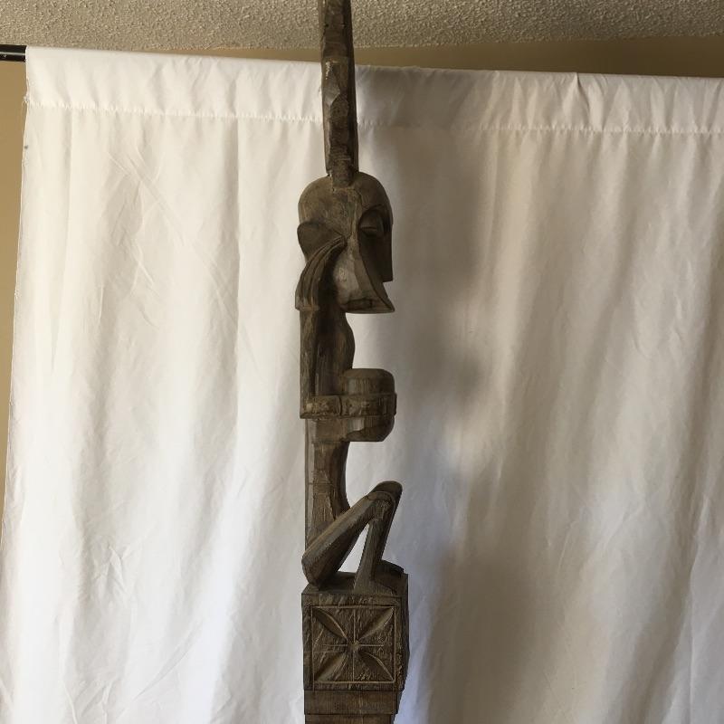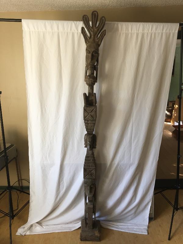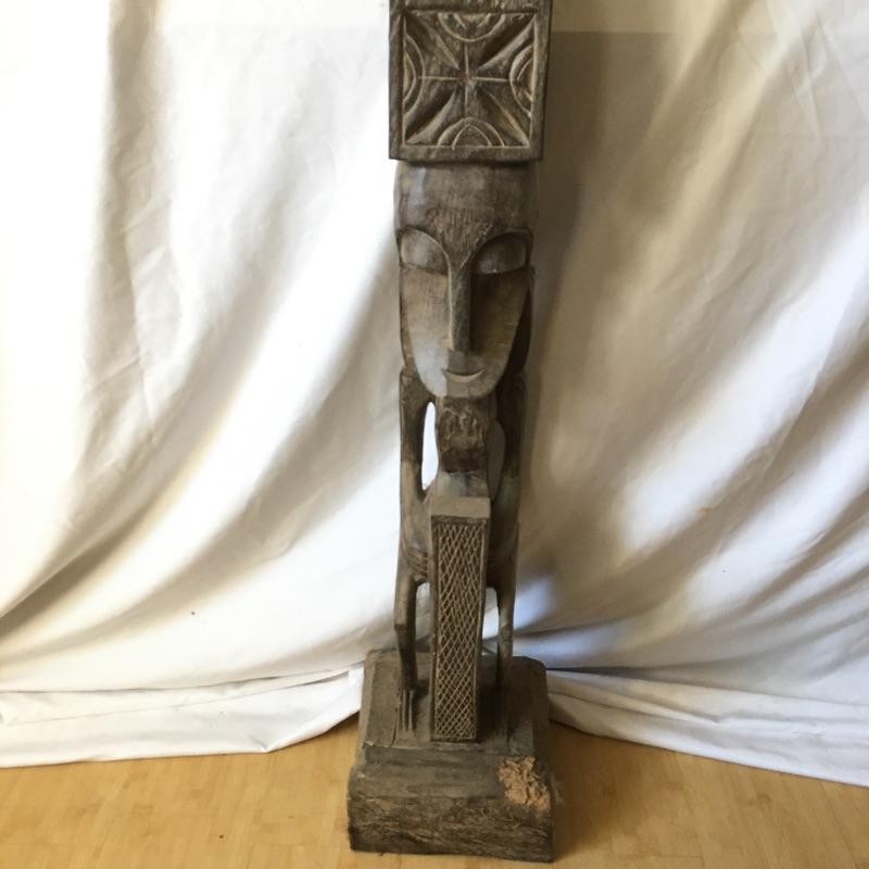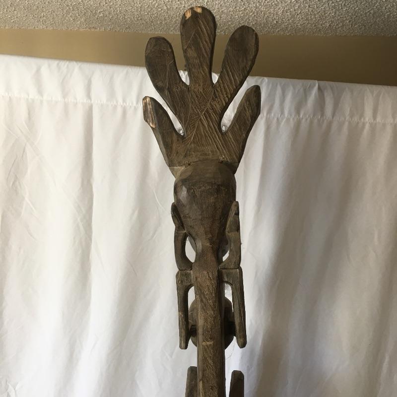 Wooden Totem pole measures 8.5” x 8.5” x 88”. Unique piece will be a great addition to any room in your home. Made of a light weight wood material. Pole has some damage on base and one arm has split, see pictures.