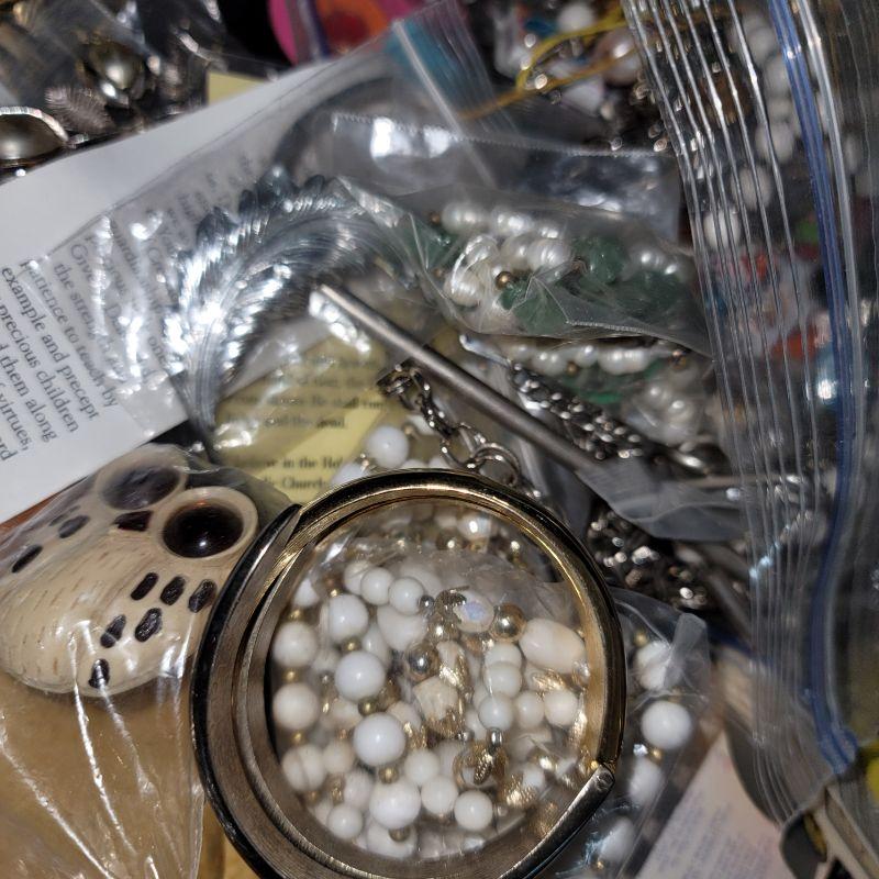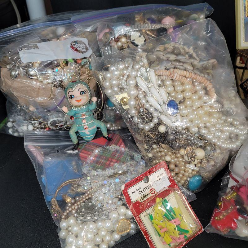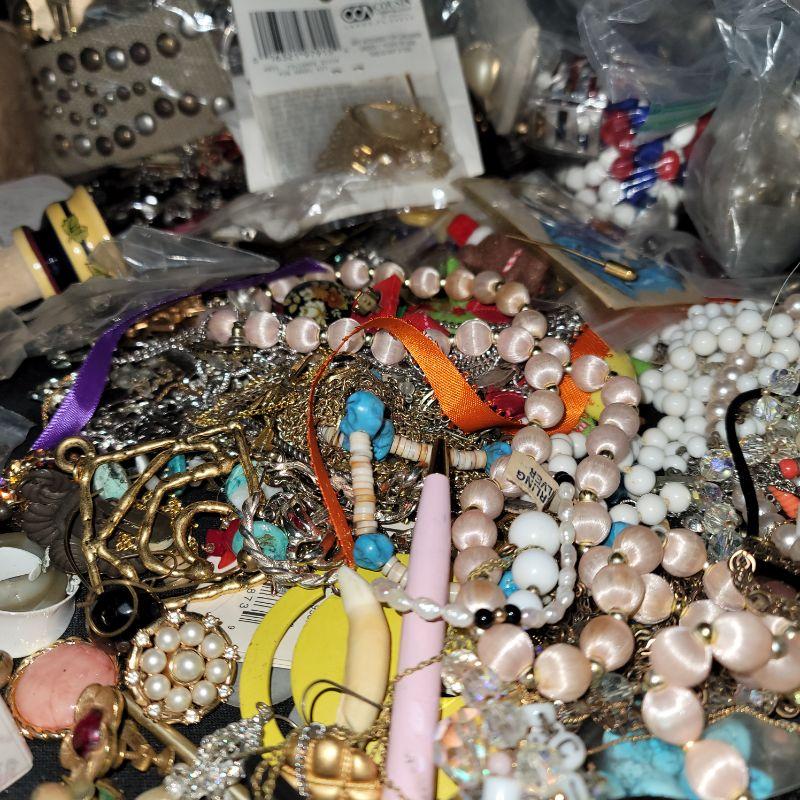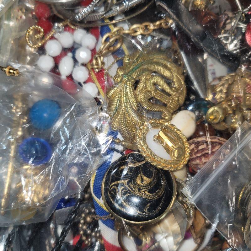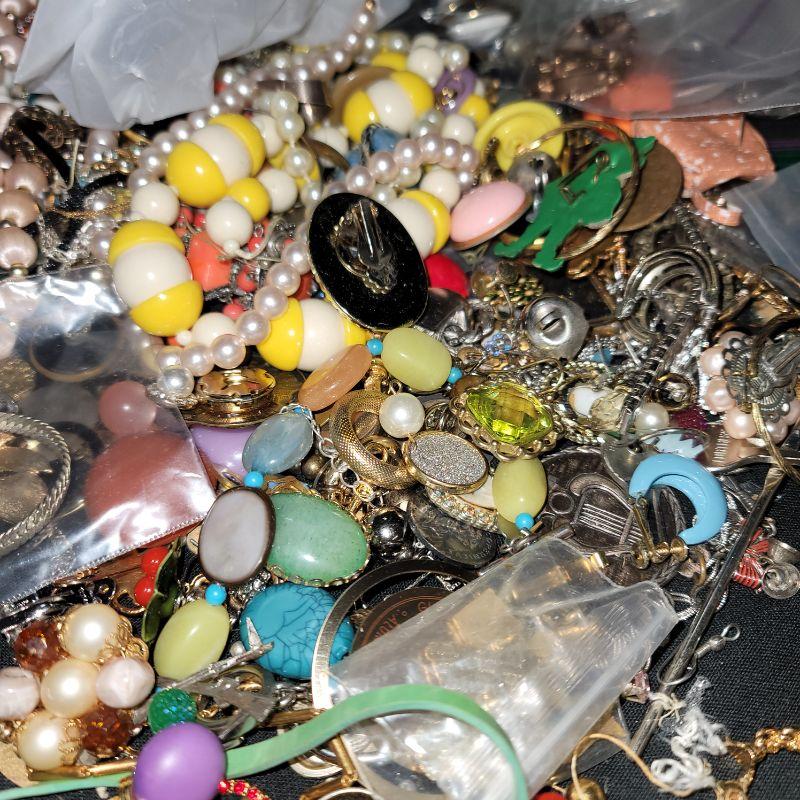Many pieces just need repair, plenty of beads, pearls, clip-on and pierced earrings, chains, necklaces and so much more. Great for making art with jewelry or repair and resell vintage pieces