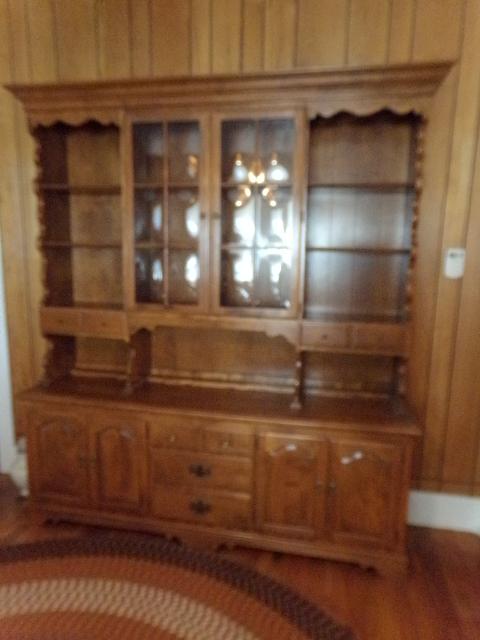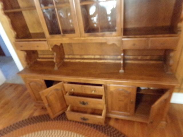 2 DOUBLE CABINETS ON THE BOTTOM WITH 3 DRAWERS, TOP DRAWER HAS INSERT FOR FLATWARE