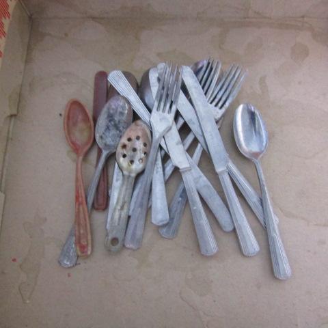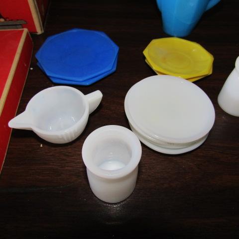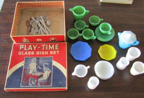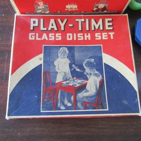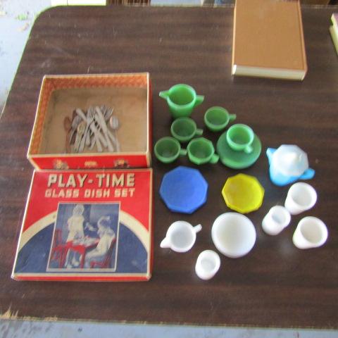 PLAY-TIME GLASS DISH SET IS NOT COMPLETE BUT DOES HAVE NUMEROUS PIECES INCLUDING SMALL METAL EATING UTENSILS