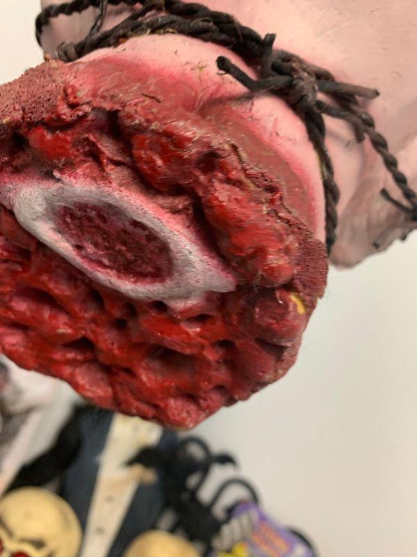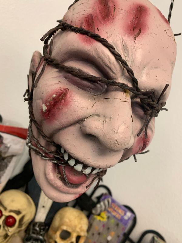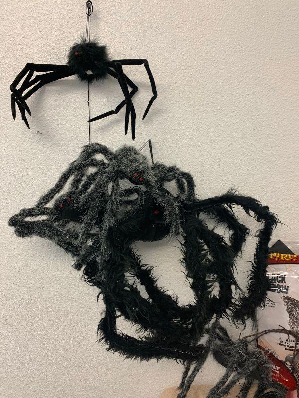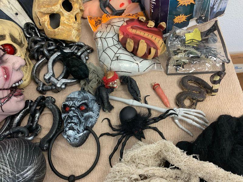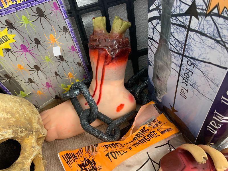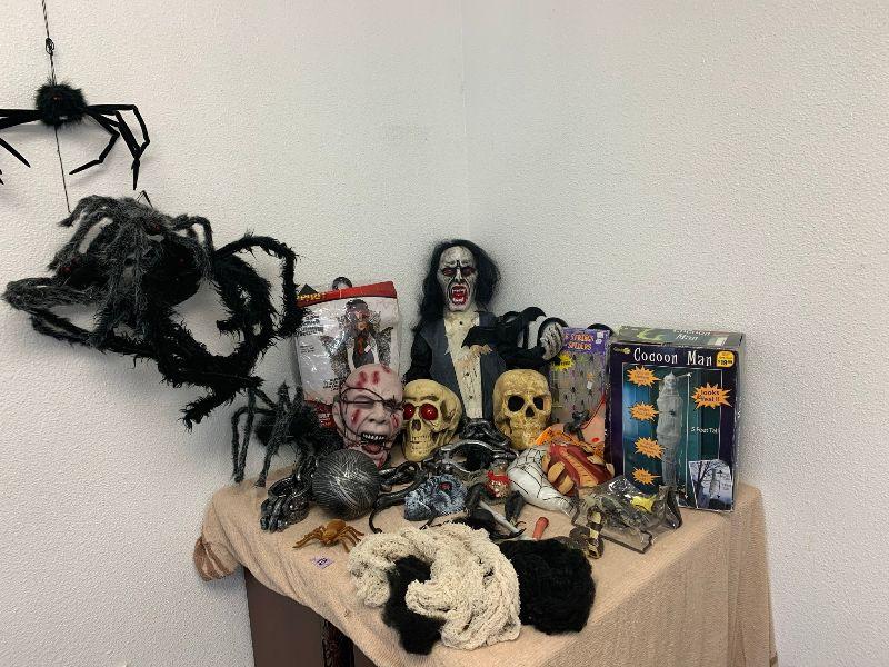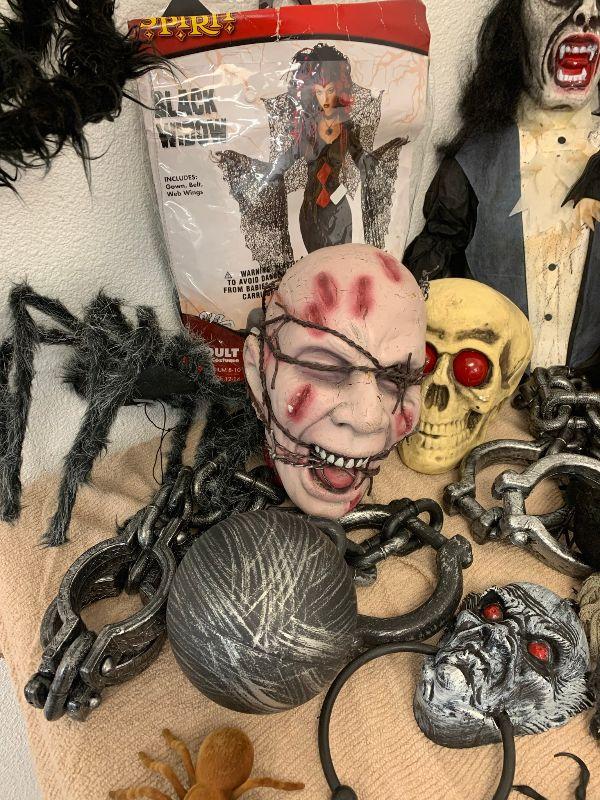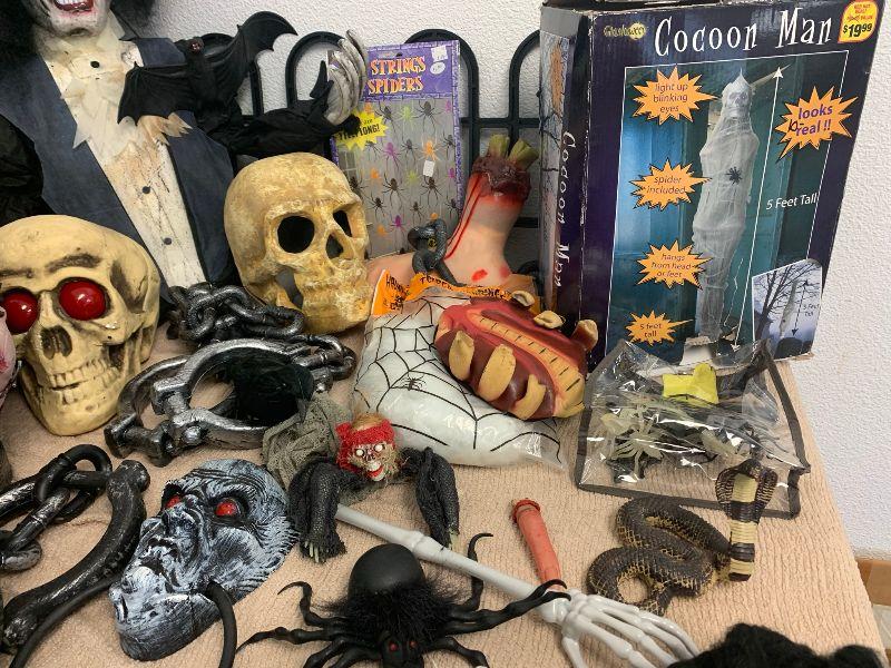 Halloween items (25 total) 3 skulls, snake, crow, foot, heart, hanging spiders, black widow costume adult XL, cocoon man and more. Hanging realistic severed head.