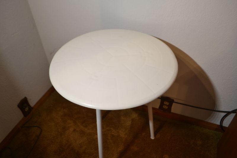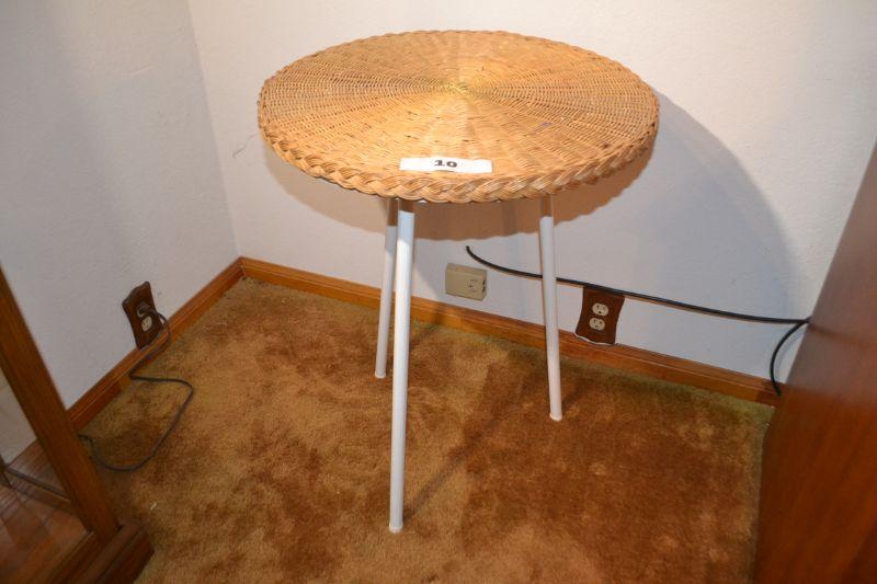 PLASTIC TABLE WITH WICKER TOP. 22" wide