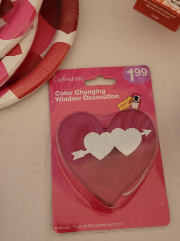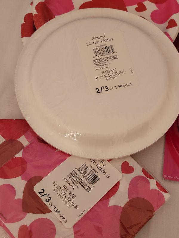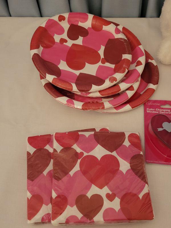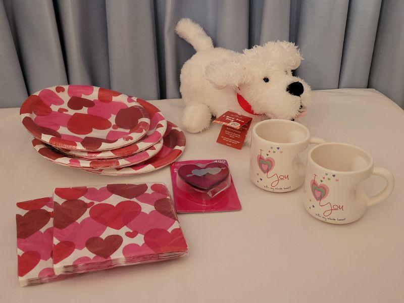 Lot 10: New Valentine's Day Disposable Plates, Napkins, Window Decoration, (2) Coffee Mugs & Plushie
