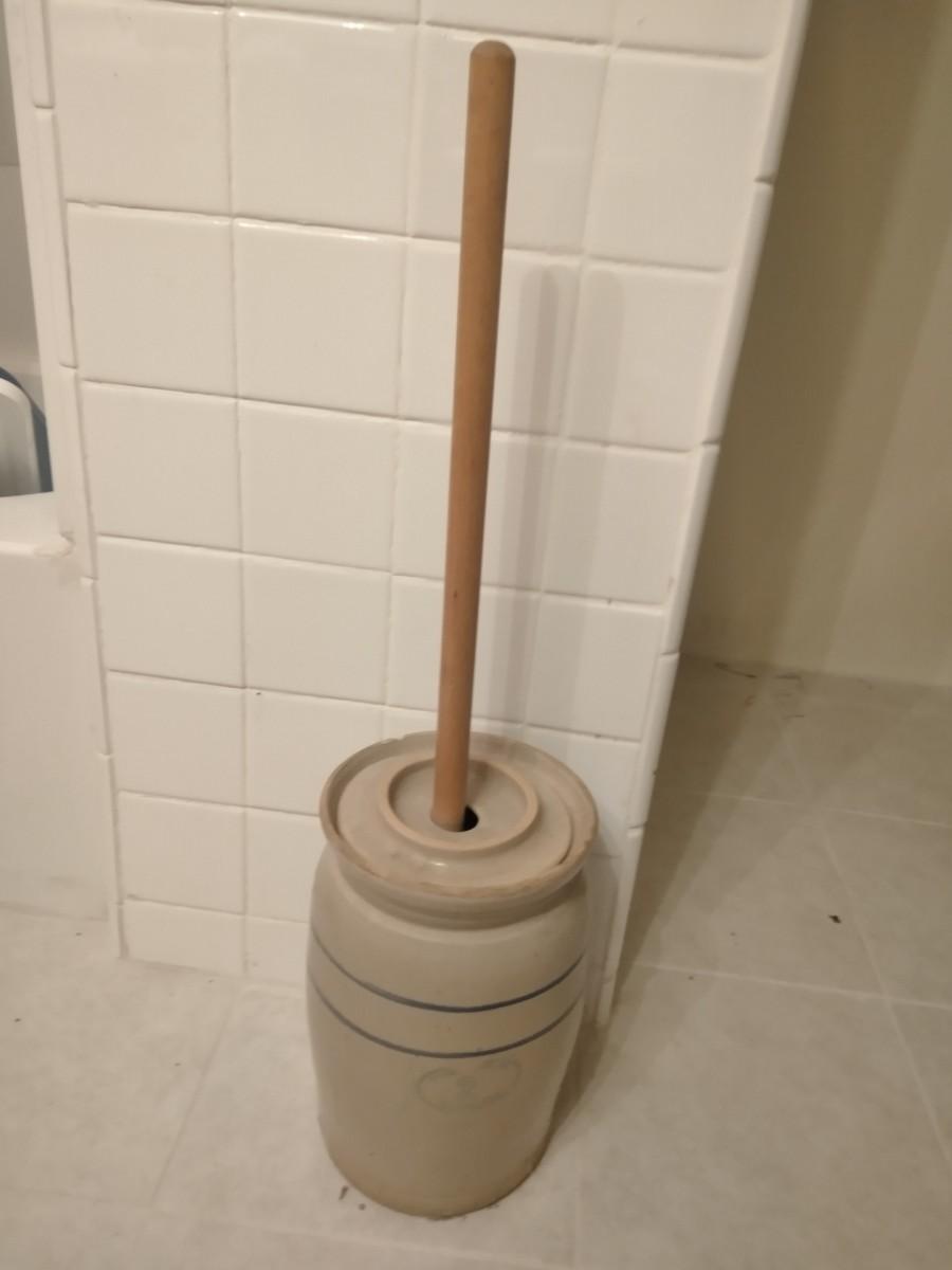 BUTTER CHURN CROCK WITH WOODEN PADDLE AND LID. THIS CROCK HAS A NUMBER 2 ON IT. (crock has small chip on rim as shown) ADDITIONAL BROWN LIDDED CROCK WITH A HANDLE. MARKED WITH A CROWN AND THE NUMBER 3