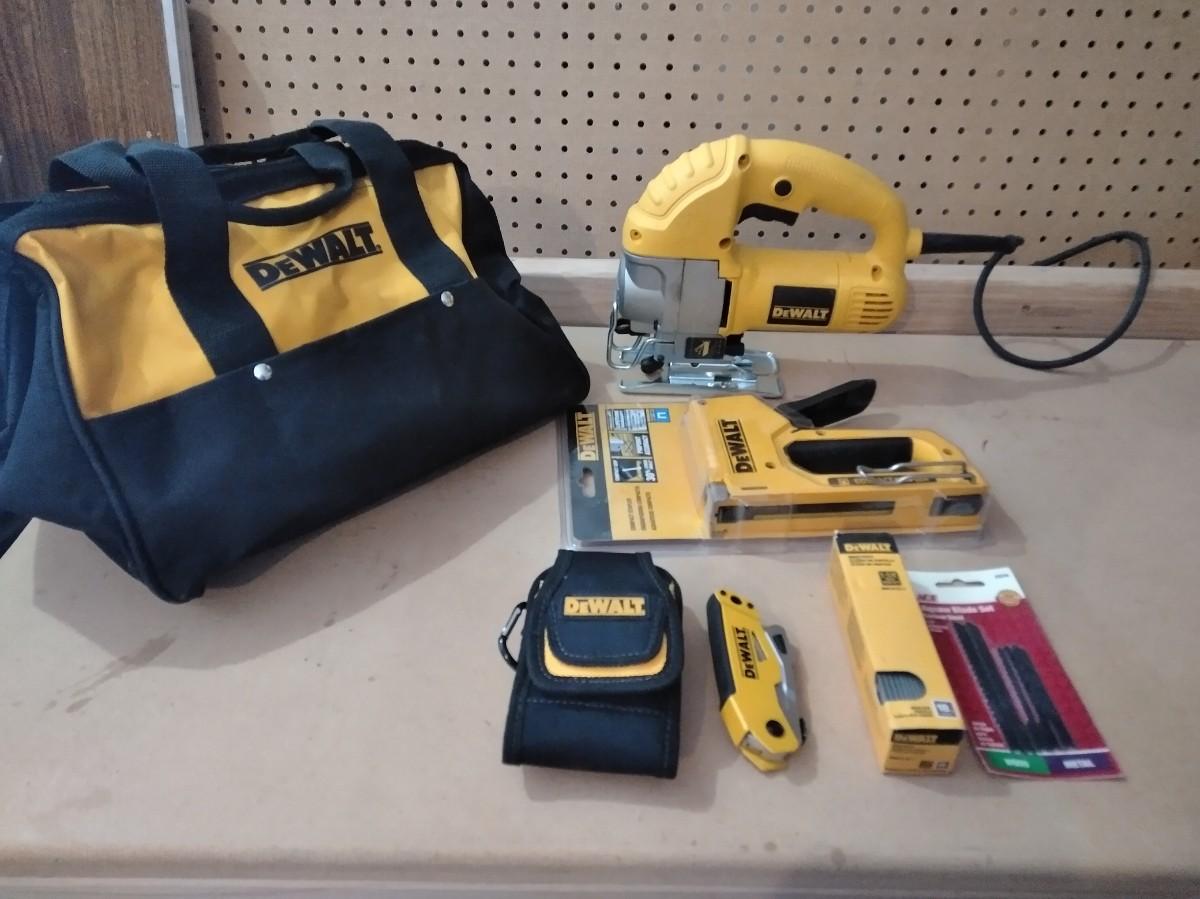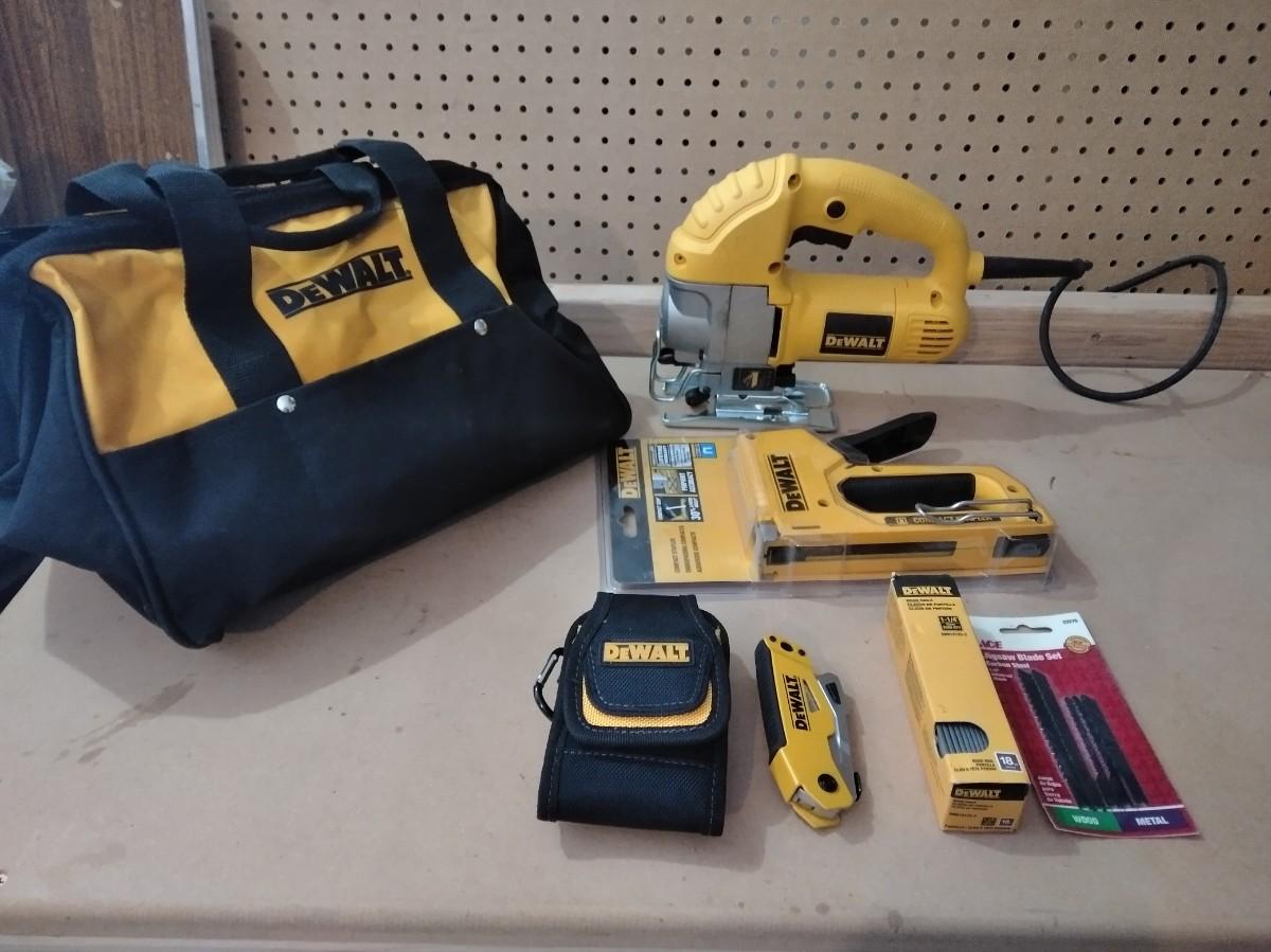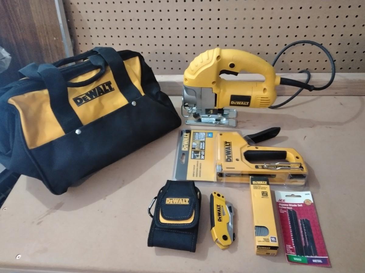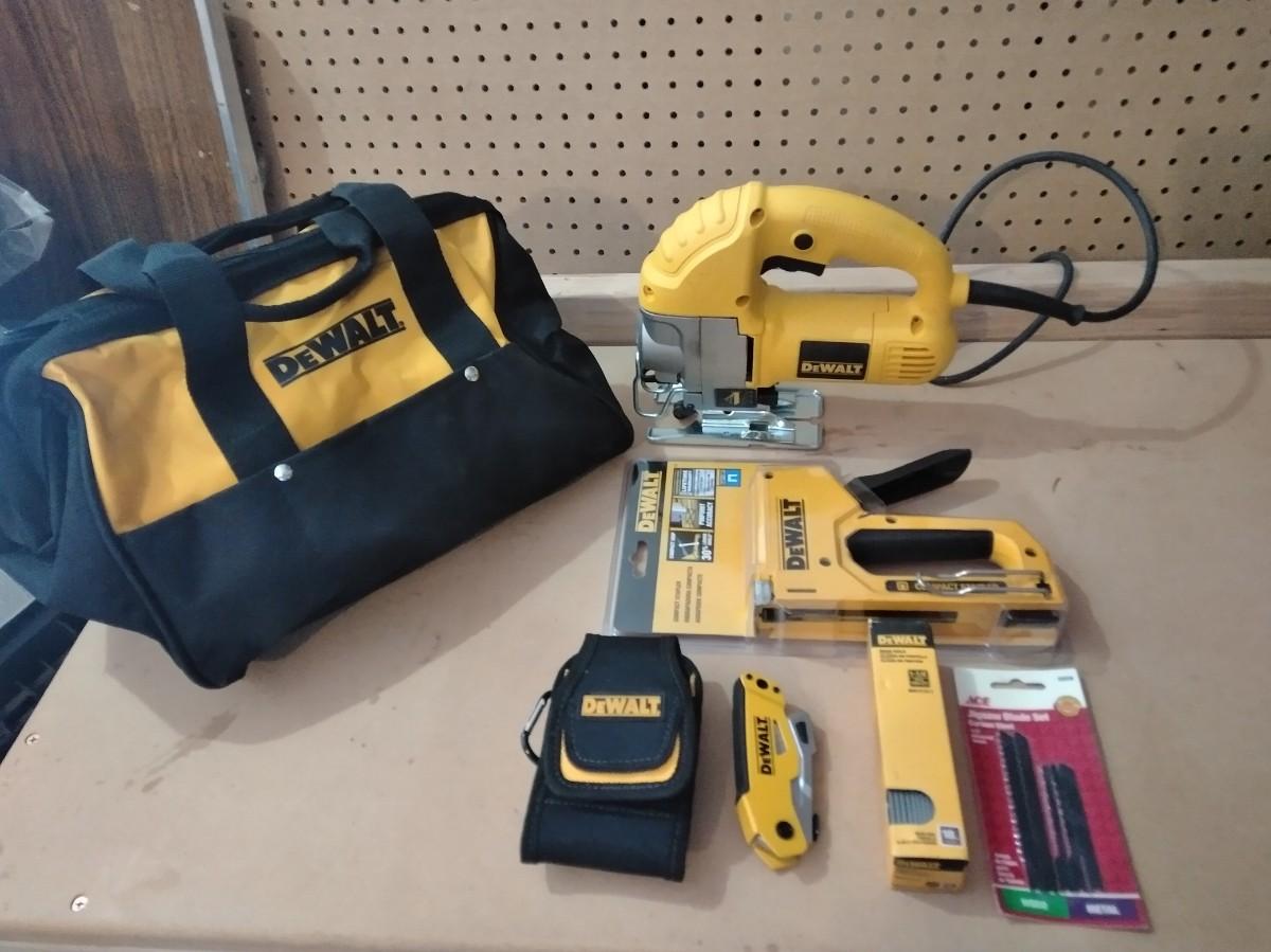 DEWALT STAPLER WITH DEWALT JIGSAW DW317 DEWALT UTILITY KNIFE WITH CASE, AND A DEWALT TOOL BAG.