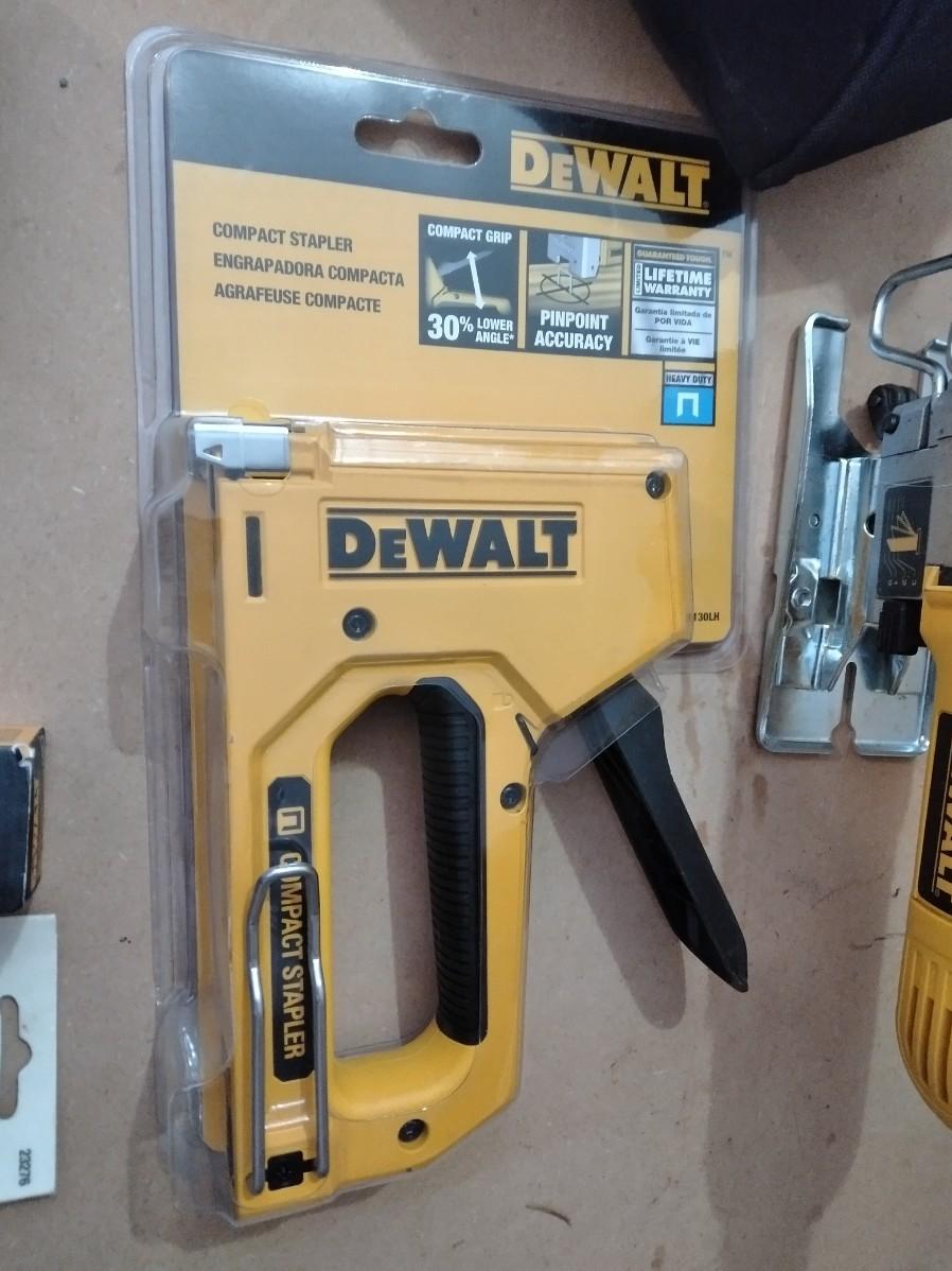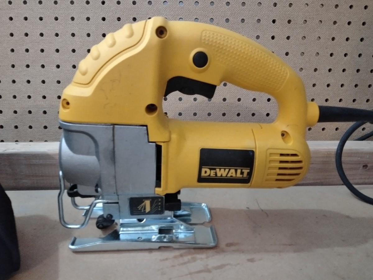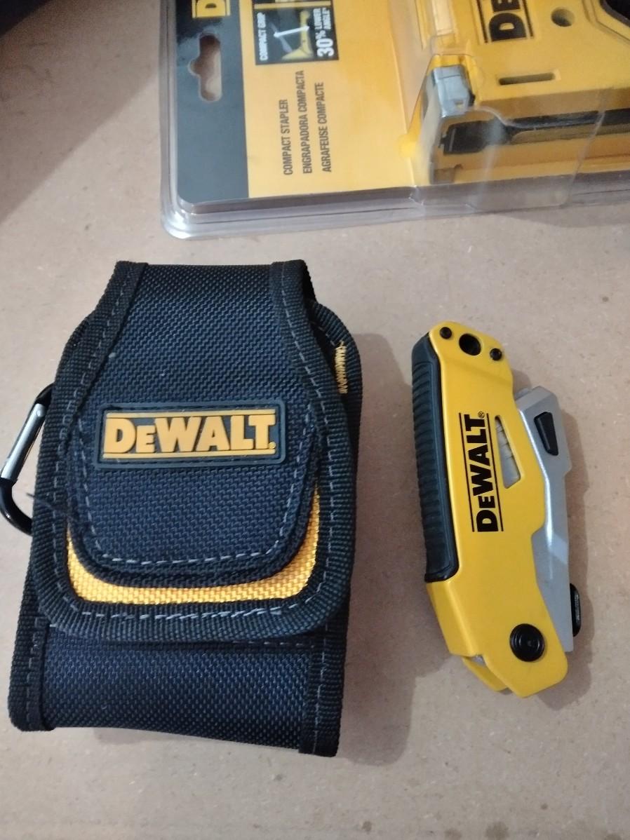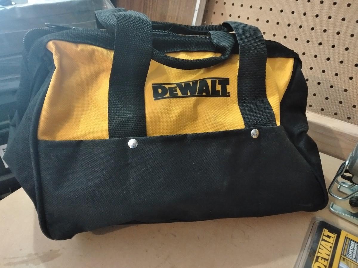 DEWALT STAPLER WITH DEWALT JIGSAW DW317 DEWALT UTILITY KNIFE WITH CASE, AND A DEWALT TOOL BAG.