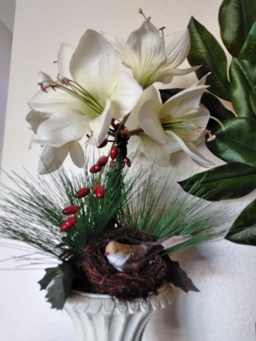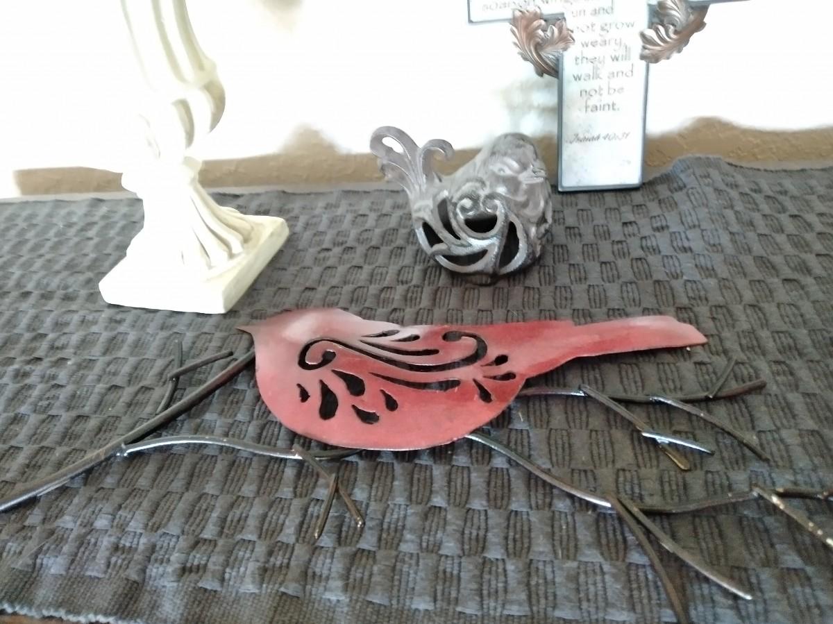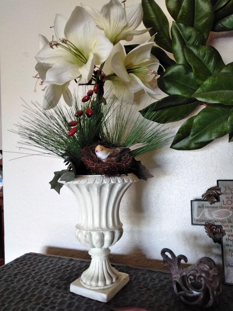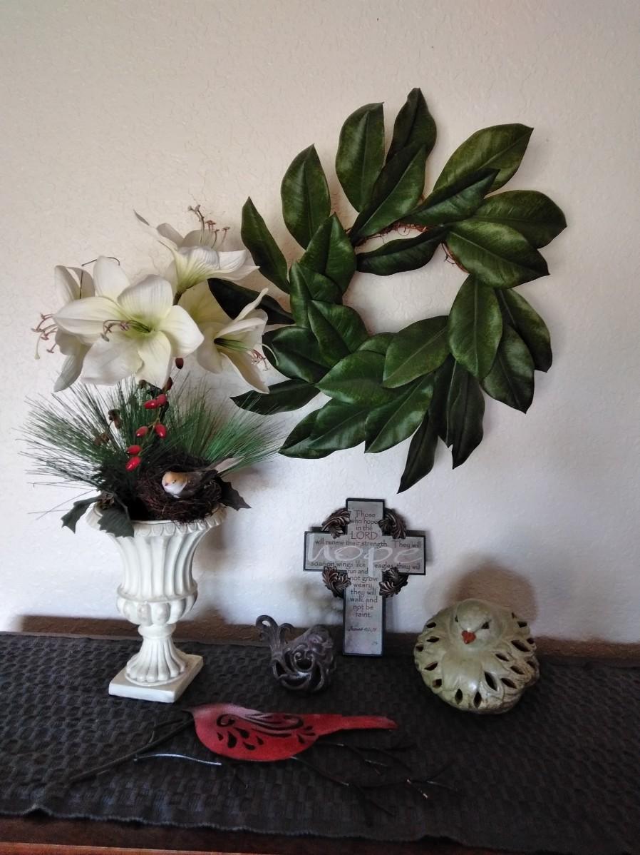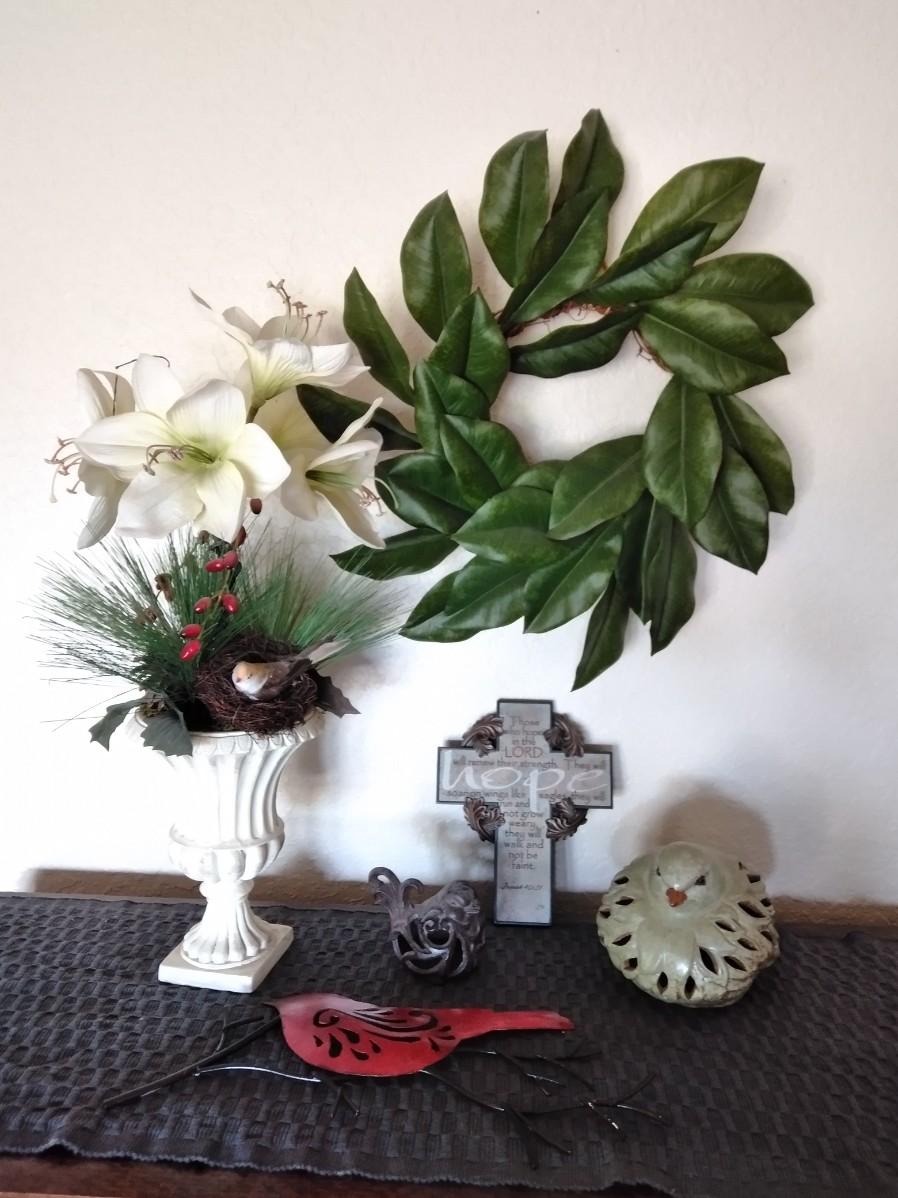 VASE WITH FAUX FLOWERS AND BIRD IN NEST, CAST IRON BIRD, FAT CERAMIC BORD, GREEN LEAF WREATH, HOPE CROSS, METAL RED BIRD, AND TABLE RUNNER.