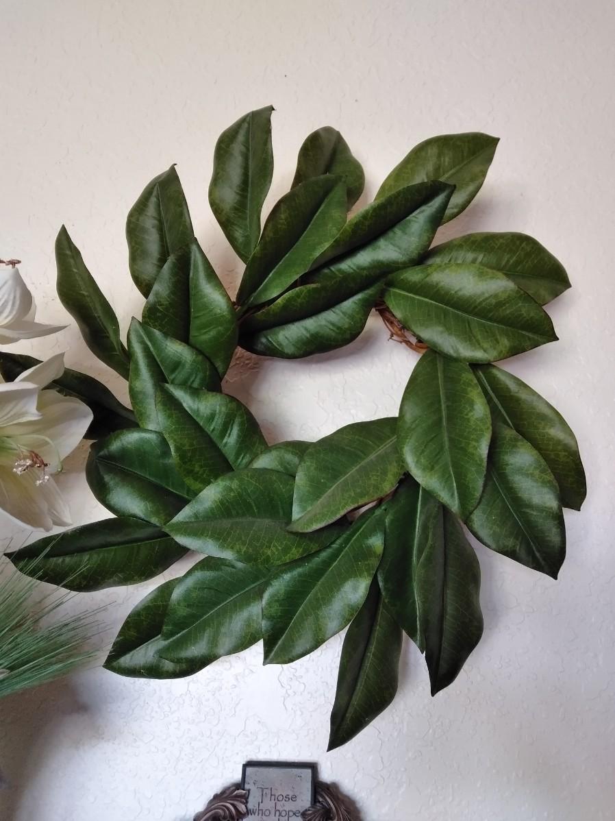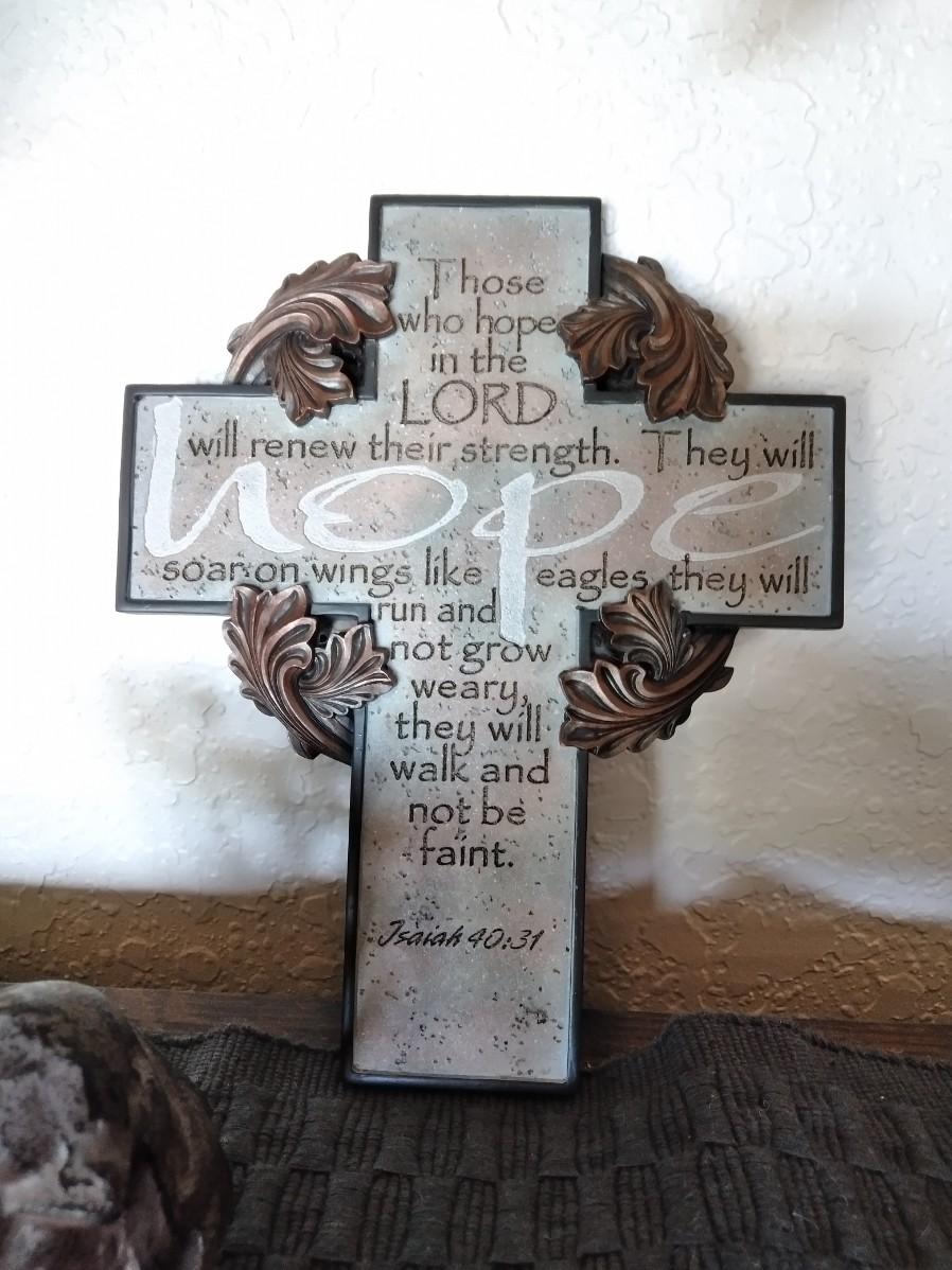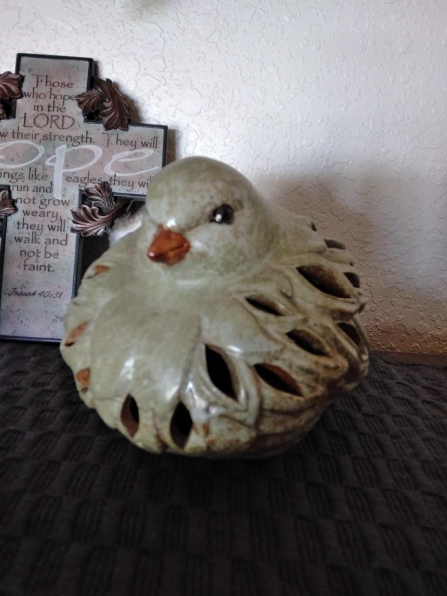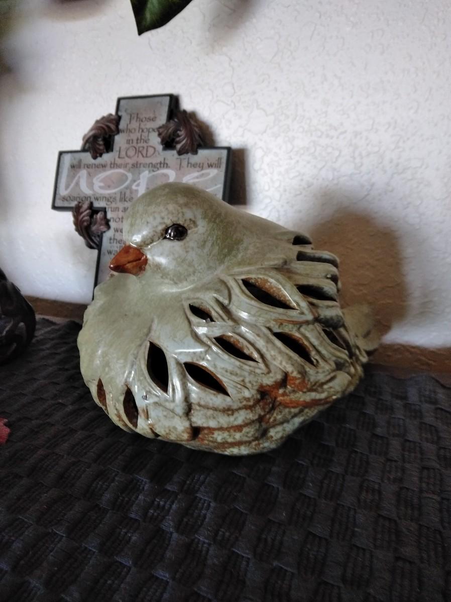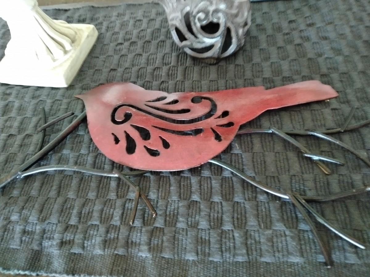 VASE WITH FAUX FLOWERS AND BIRD IN NEST, CAST IRON BIRD, FAT CERAMIC BORD, GREEN LEAF WREATH, HOPE CROSS, METAL RED BIRD, AND TABLE RUNNER.