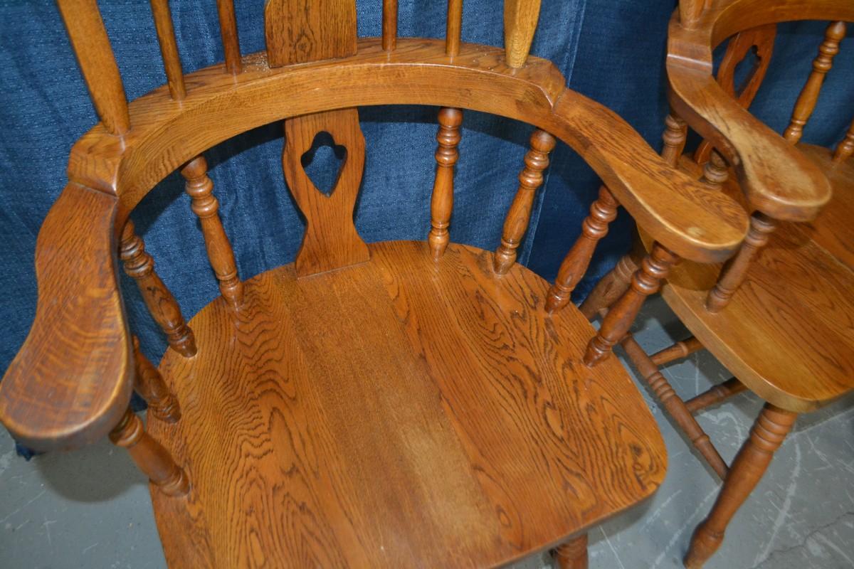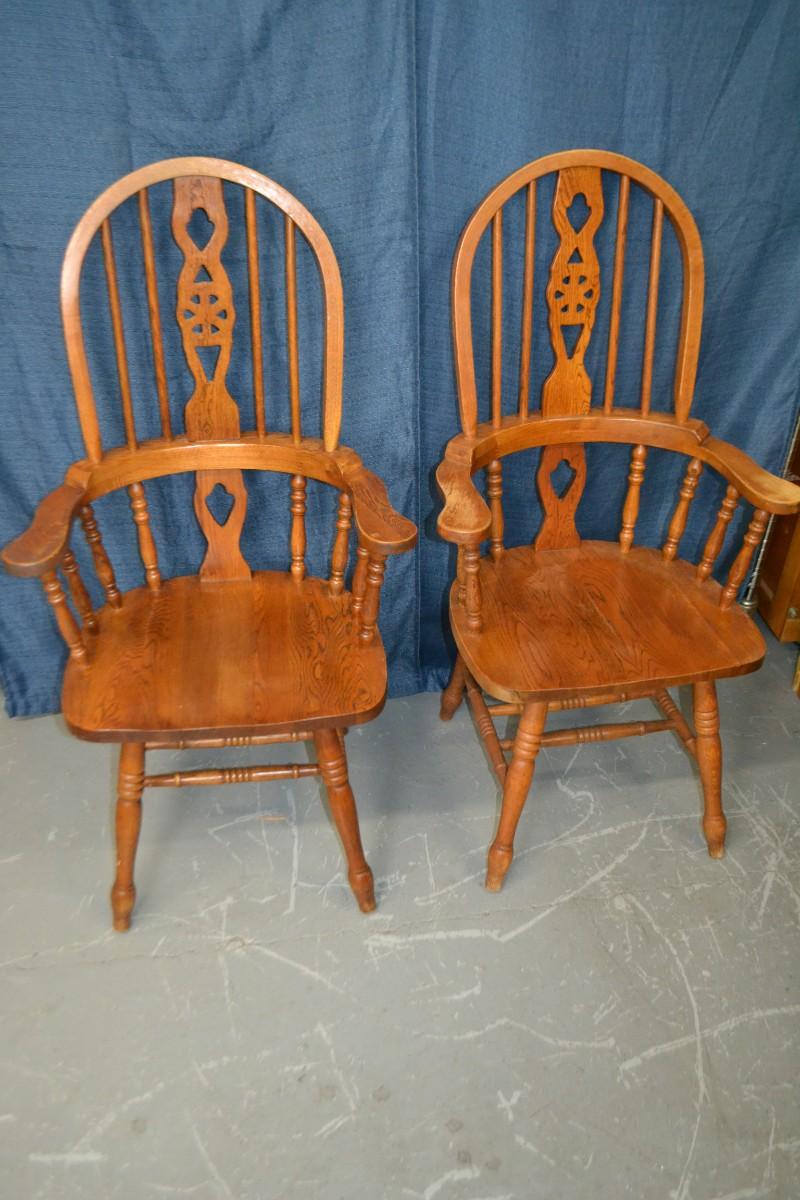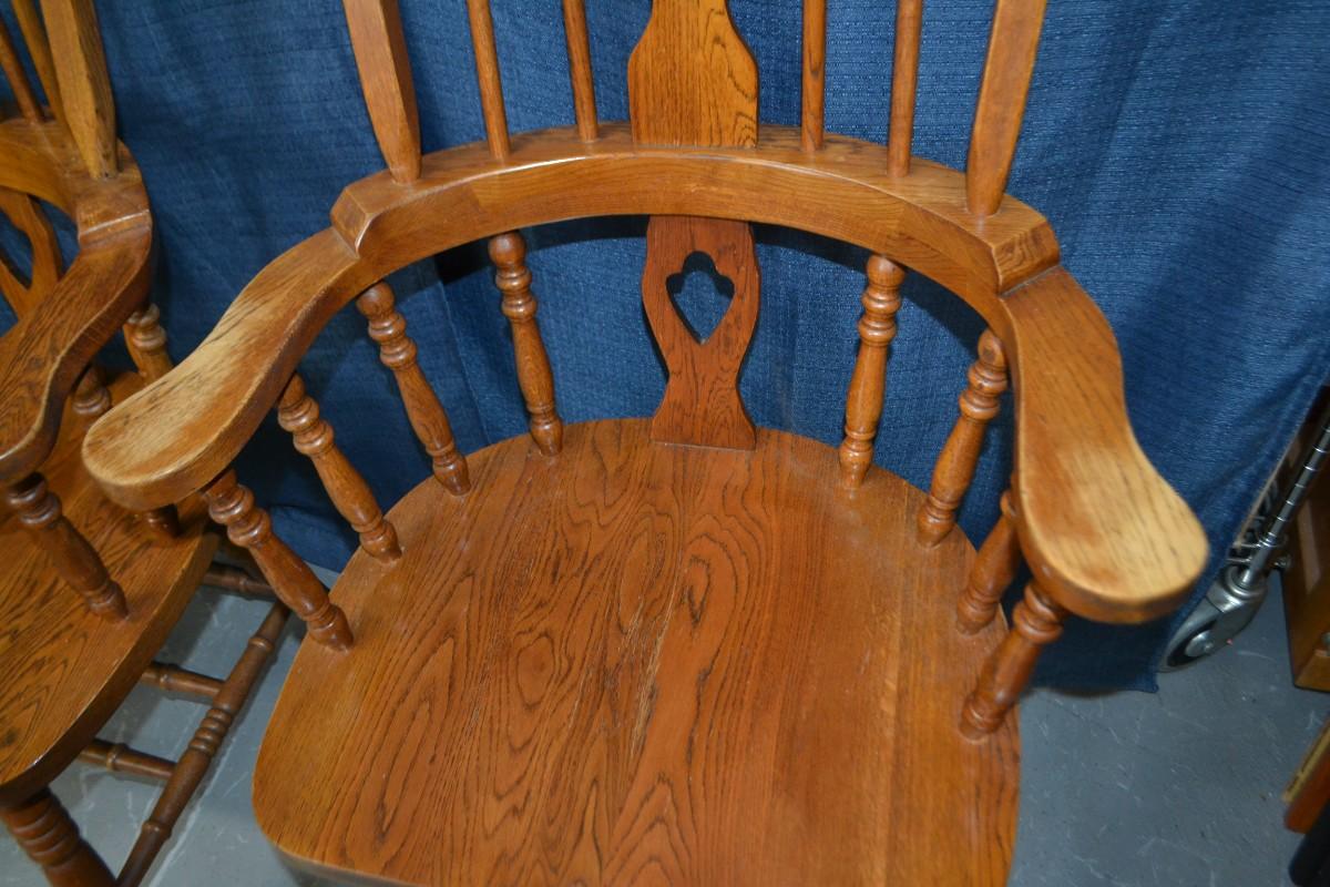 PAIR OF OAK WINDSOR DINING ARM CHAIRS, SIGN OF USE ON ONE OF THE CHAIR ARMS, BOTH CHAIRS VERY STURDY AND SOLID