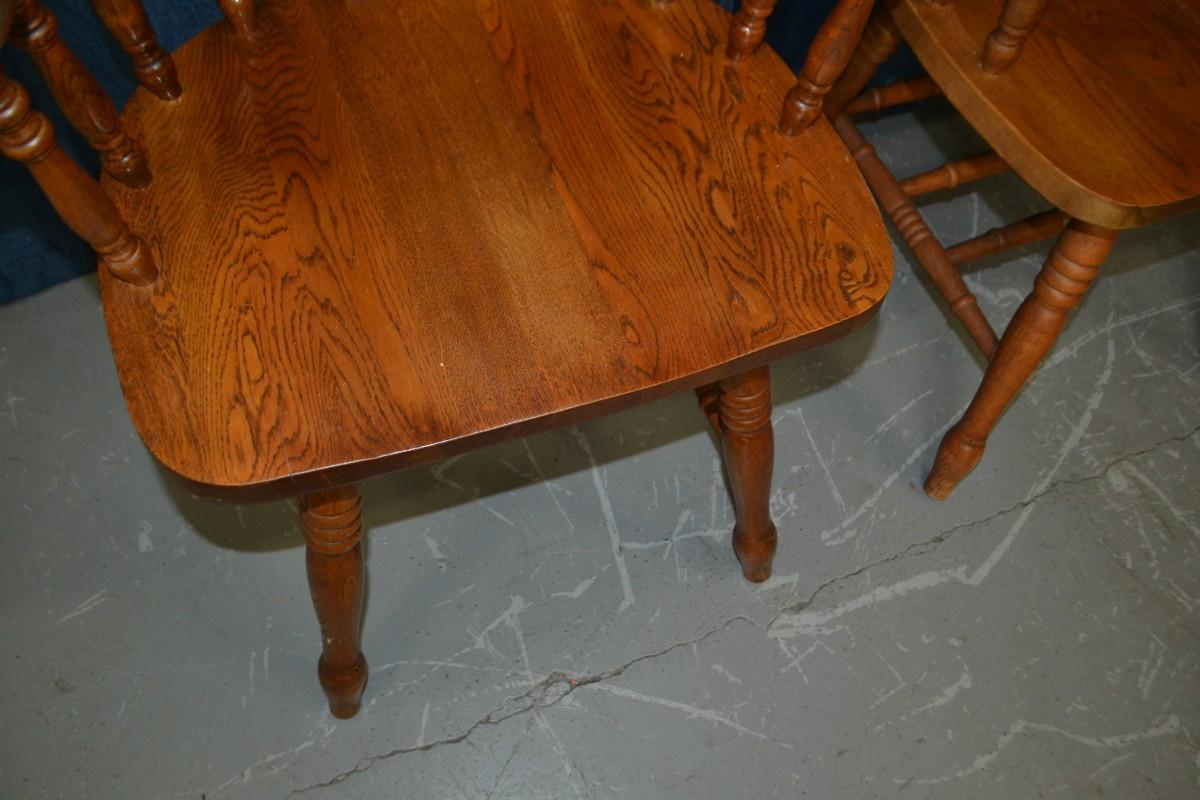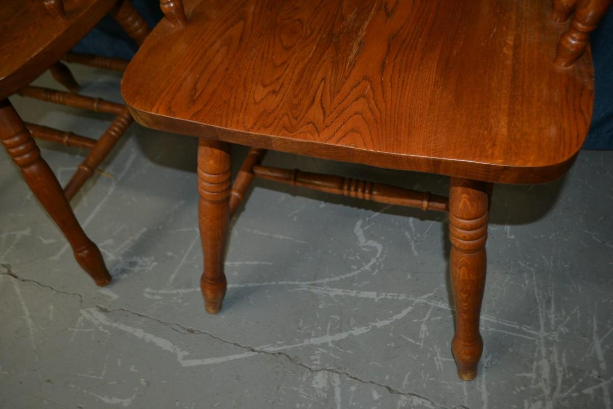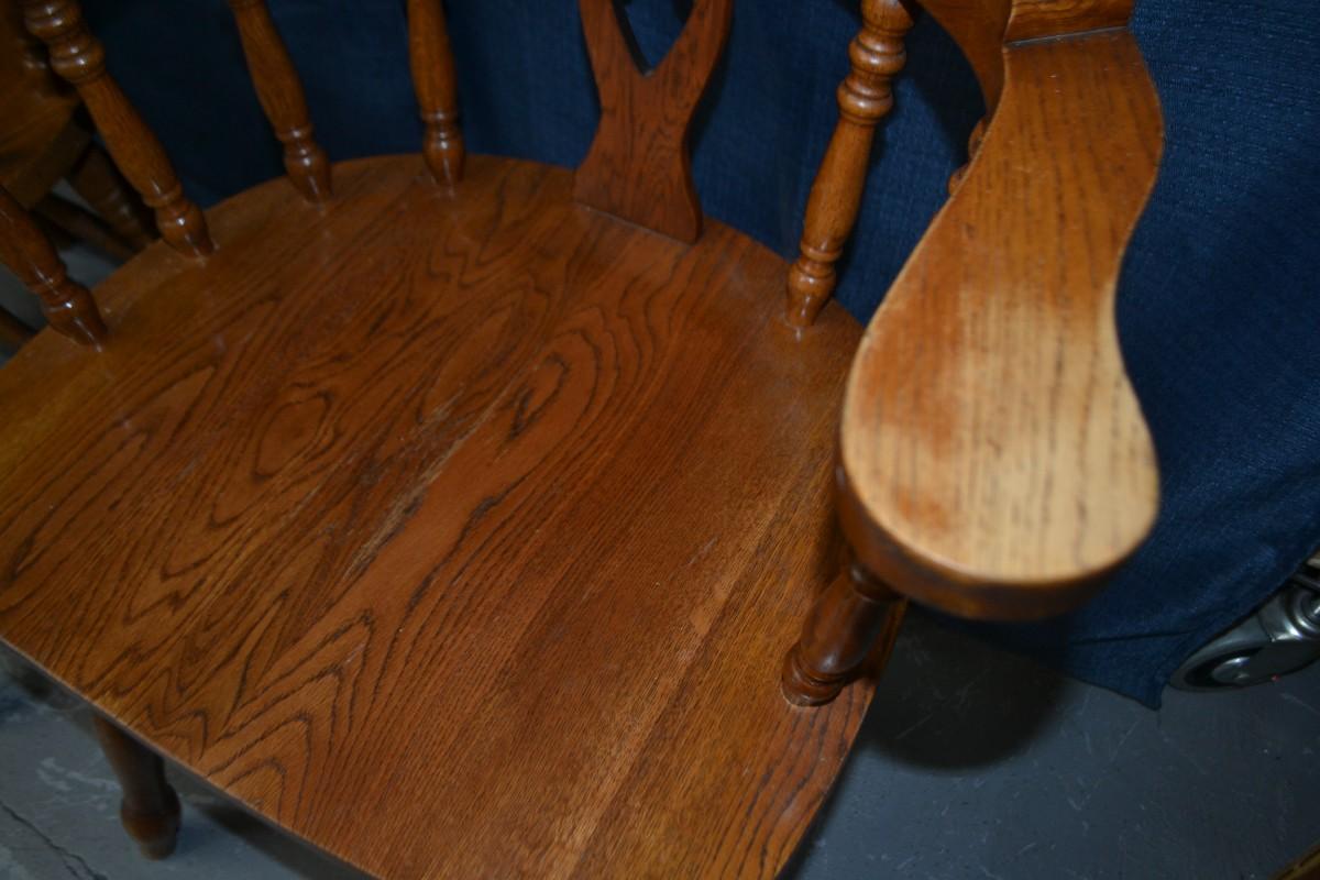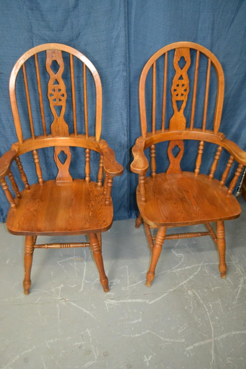 PAIR OF OAK WINDSOR DINING ARM CHAIRS, SIGN OF USE ON ONE OF THE CHAIR ARMS, BOTH CHAIRS VERY STURDY AND SOLID