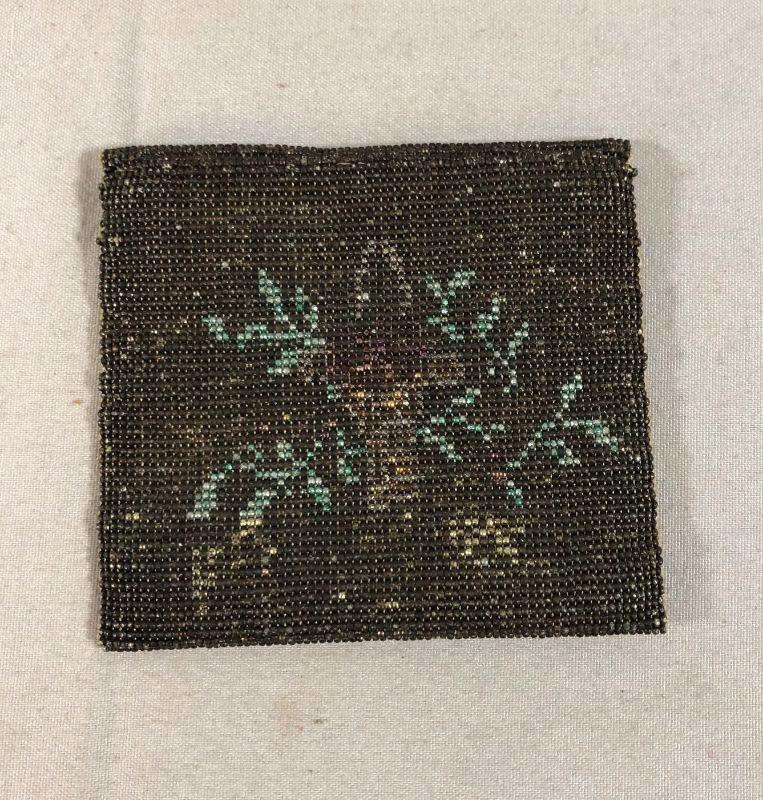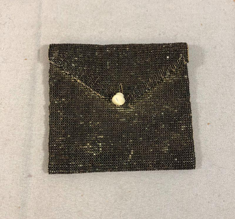 This feels like it is made out of a metallic thread (it's weighty) and needs to have it's tiny button sewn back on. It looks like it was originally silverish and it is lined. Measures about 2.5" x 2.5". Consignor states that it is from the 1930s.