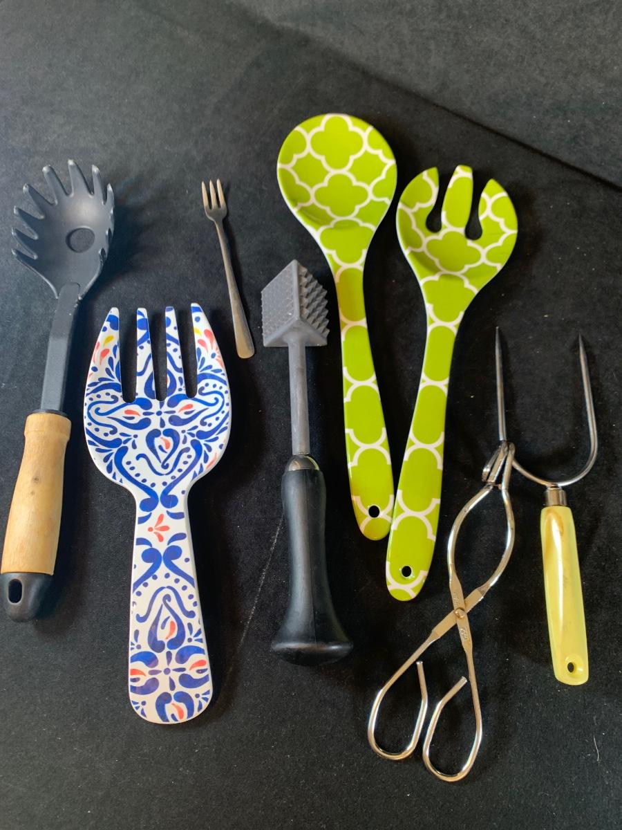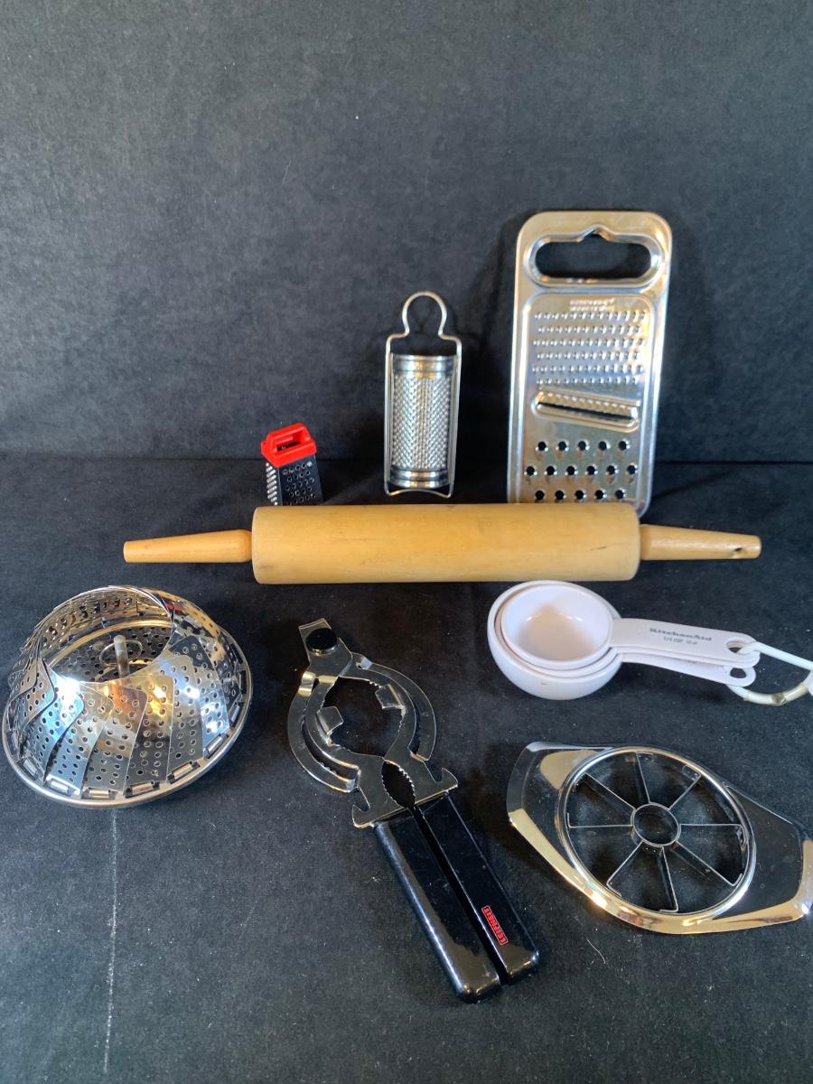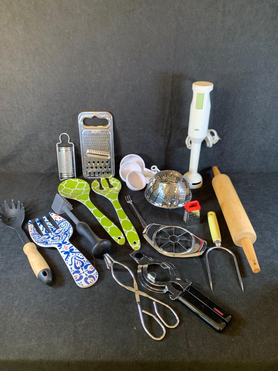Includes steamer basket, Braun emulsion blender, apple slicer, salad servers, serving fork, wooden rolling pin, plastic measuring cups, cheese grater, pasta spoon, nutmeg grater, meat tenderizer, meat fork, Leifheit extra wide stainless steel lid and jar opener.
