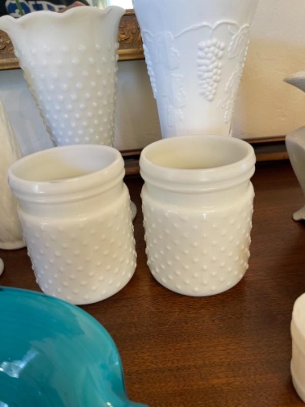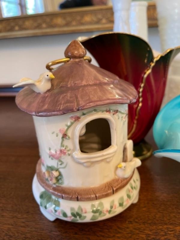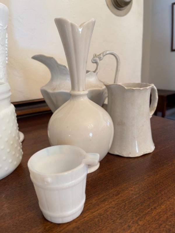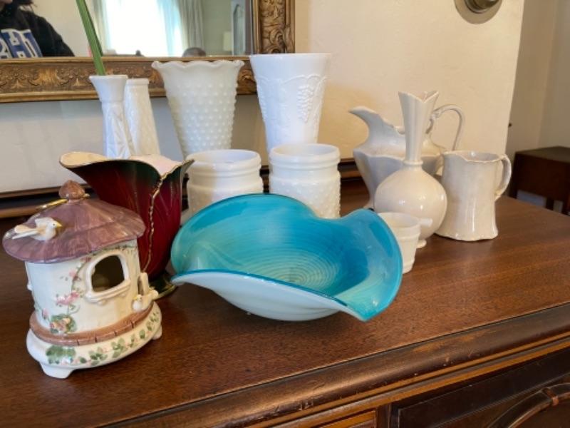 Lot 10. Assorted milk glass, pottery, Lenox, glass bowls, music box, etc.--$25