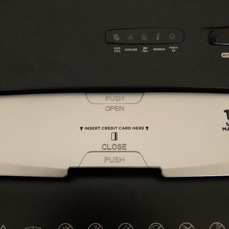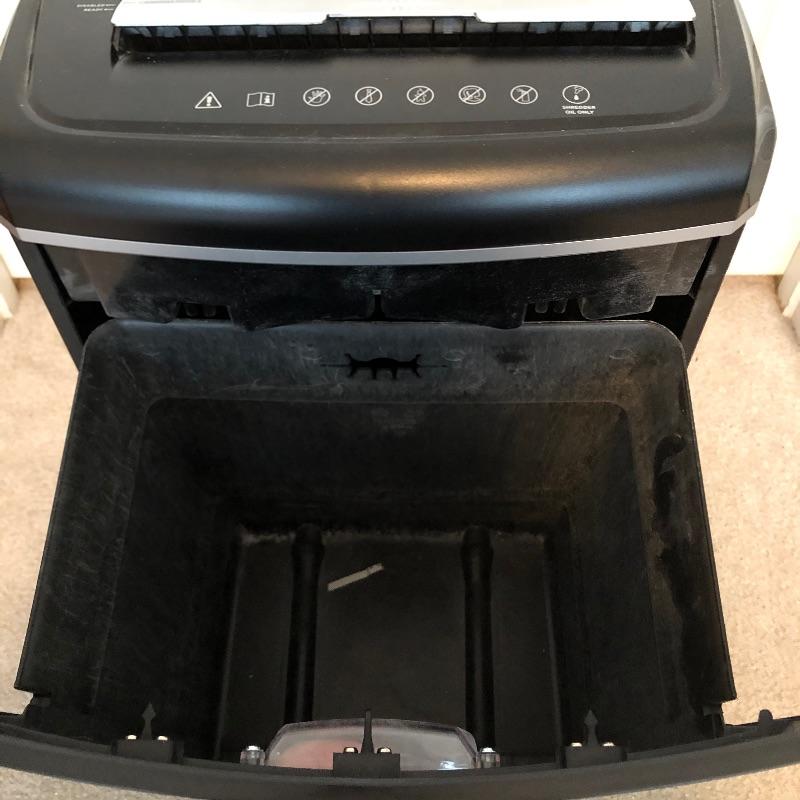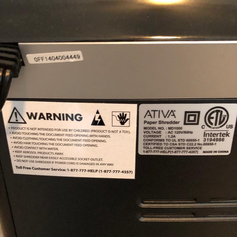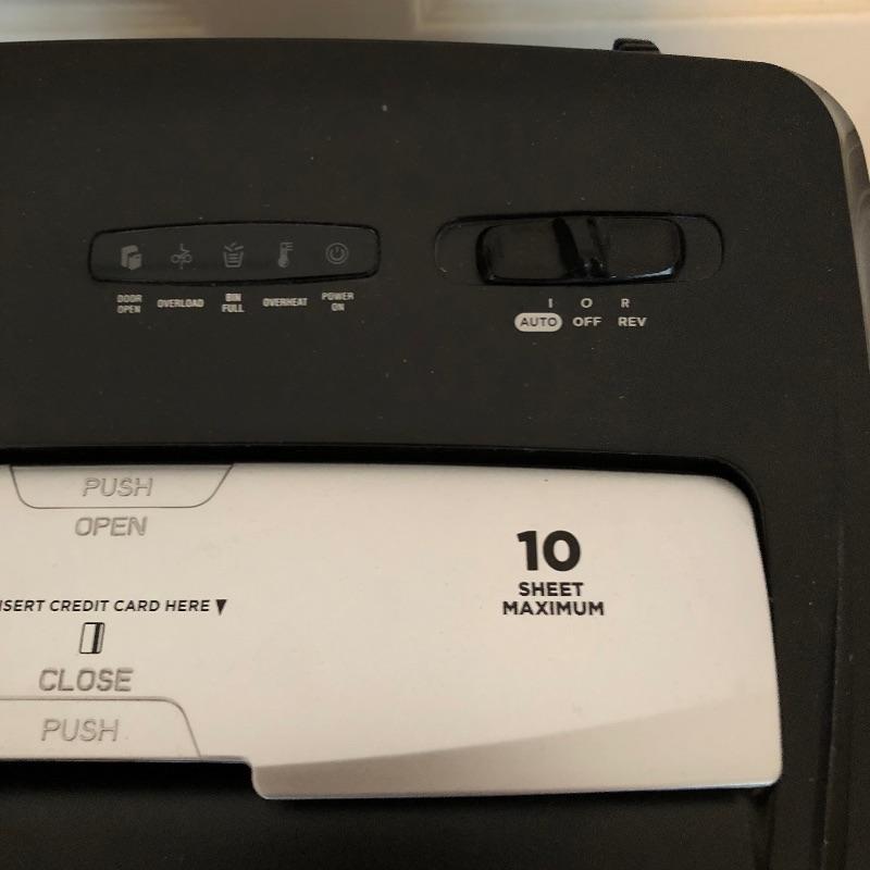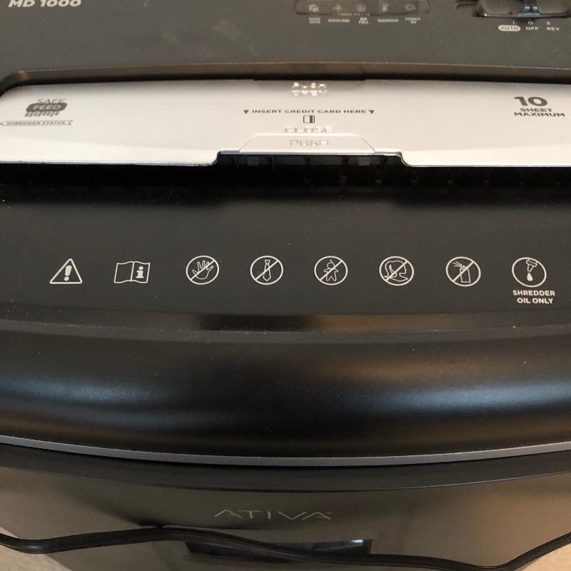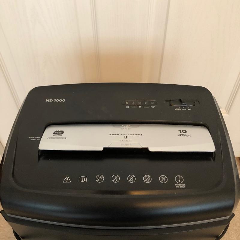 If you’re looking for a top-notch paper shredder, look no further! This paper shredder (12.5” x 9” x 18.5”) is Model MD1000 and takes up to 10 pages at a time and can even handle credit cards! It has rolling wheels for easy maneuverability. The shredder is in working order.