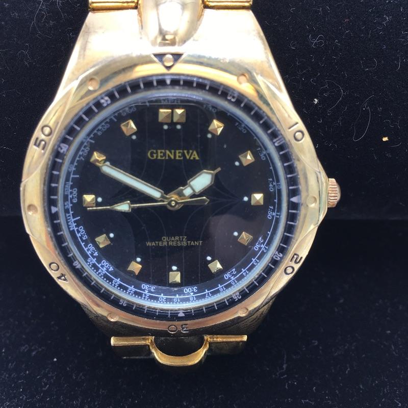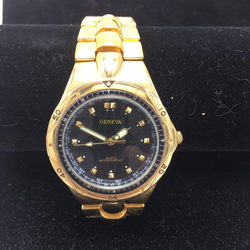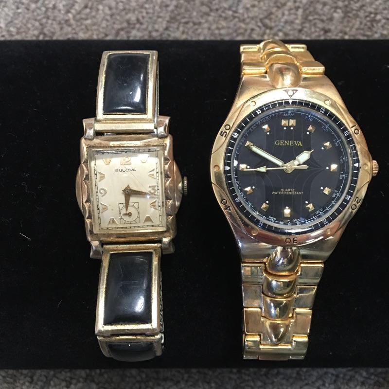 Ladies vintage Bulova watch and men’s Geneva watch. Geneva watch looks unworn and Bulova is a little faded, but still a good looking watch and was working when tested.