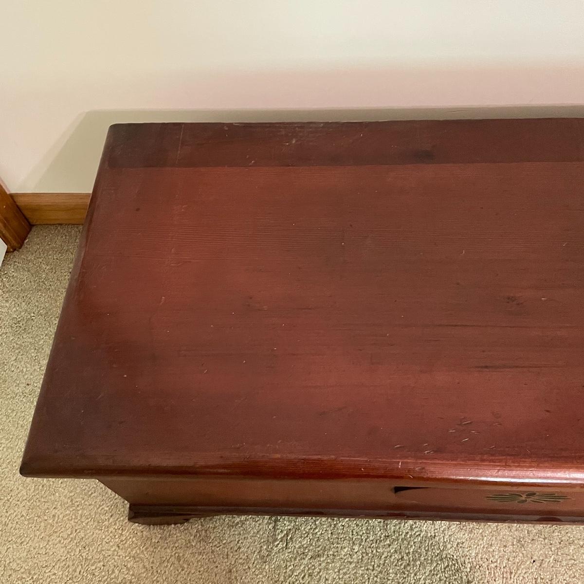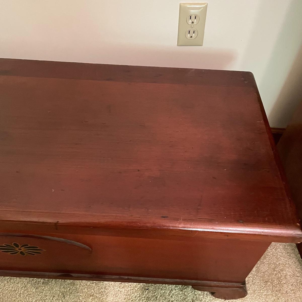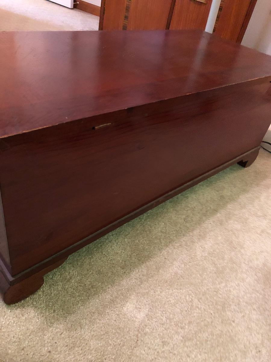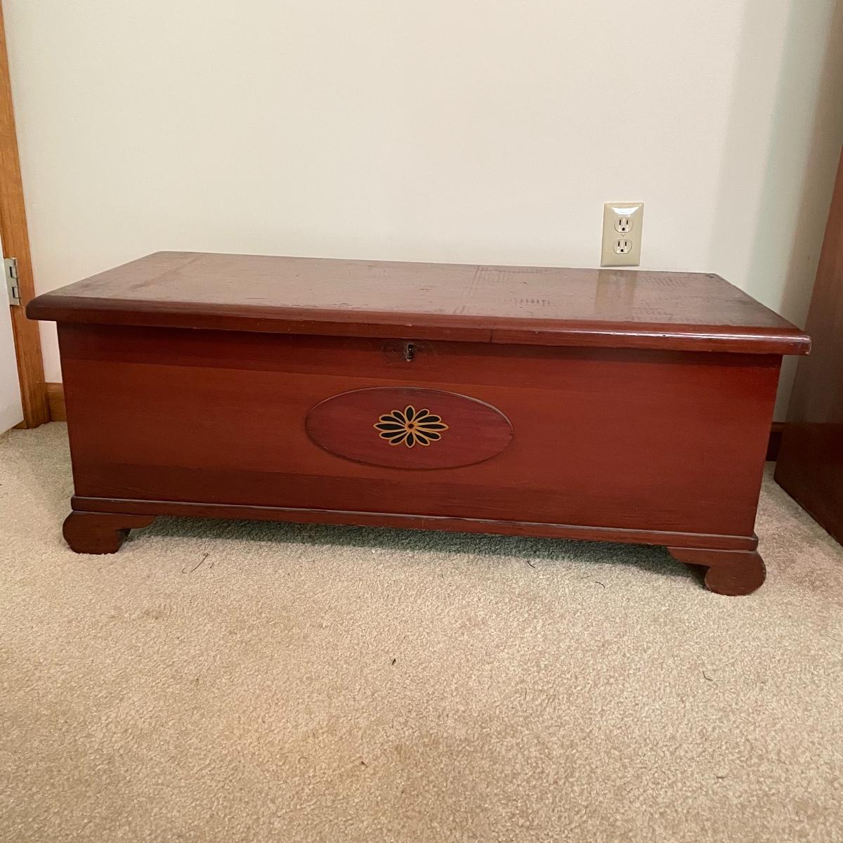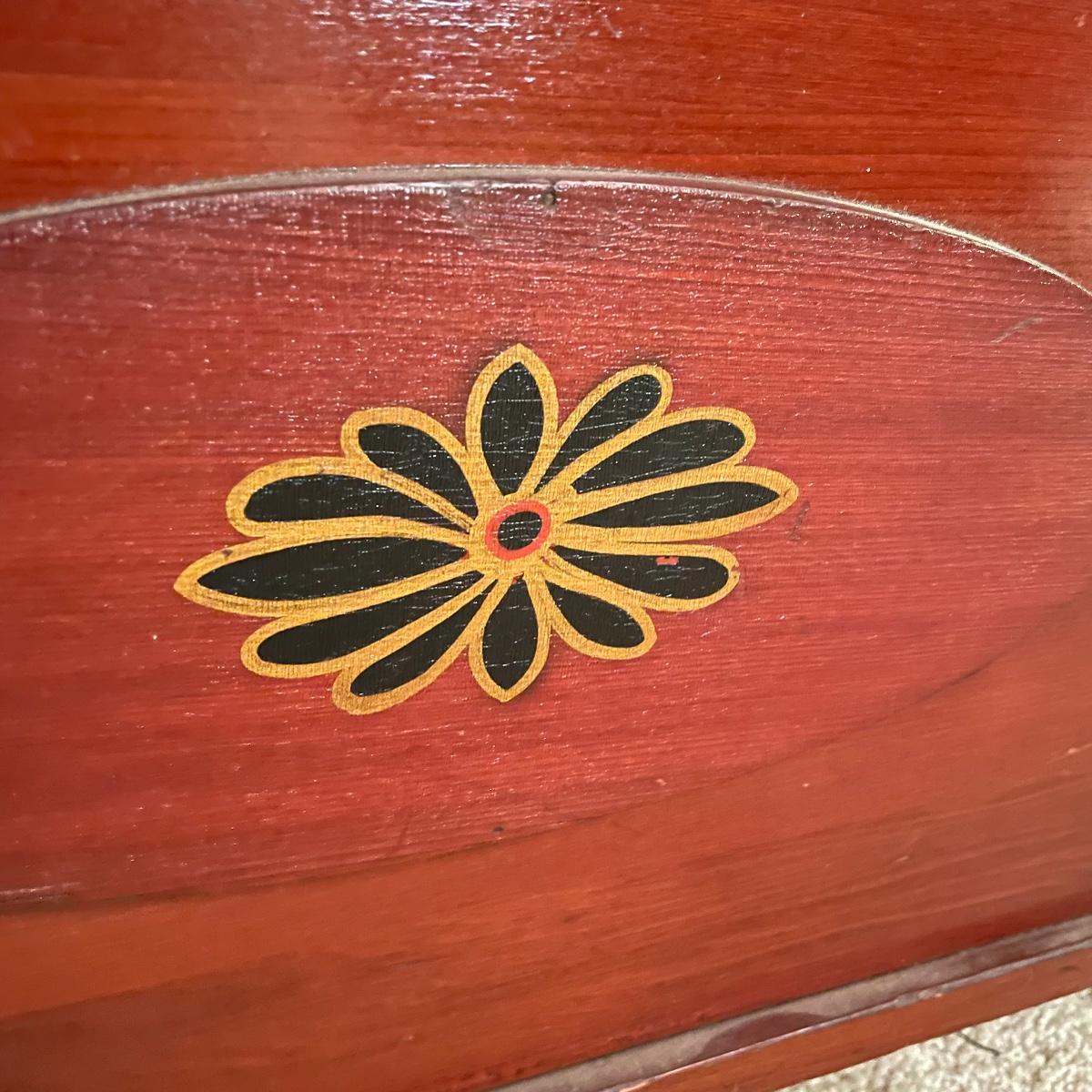 A beautiful reddish brown cedar chest with a hand painted flower. The chest appears to be in fantastic condition inside and will keep your treasures nice and clean. Some wear is noted in photos, but piece is sturdy and in fine shape. The lock has been removed with wear showing near it. Piece measures 40” x 17.5” x 15.5”. The feet are attached with screws, three are a bit wobbly, but it appears it’s only noticeable when manually moving the feet, it’s not noticeable when using chest. The back has residue from a sticker,See images. Local pick up only.