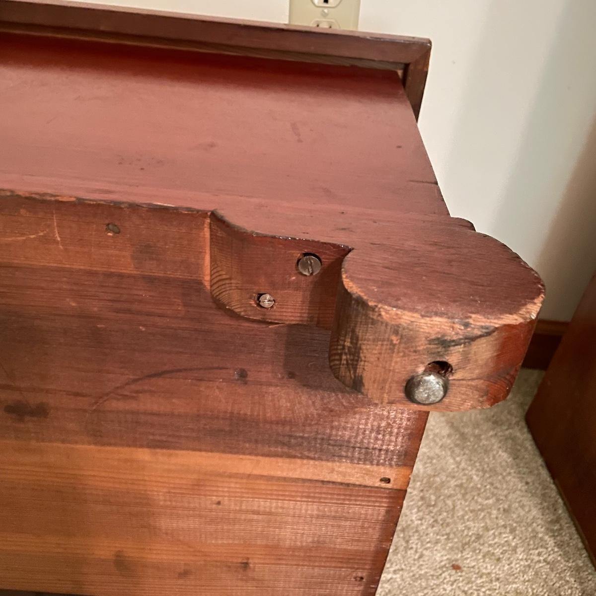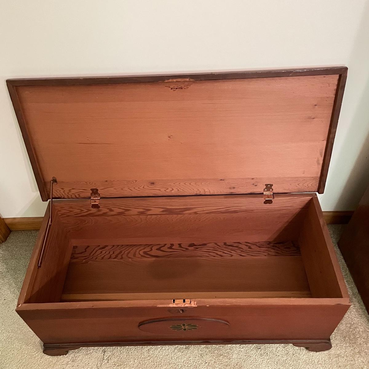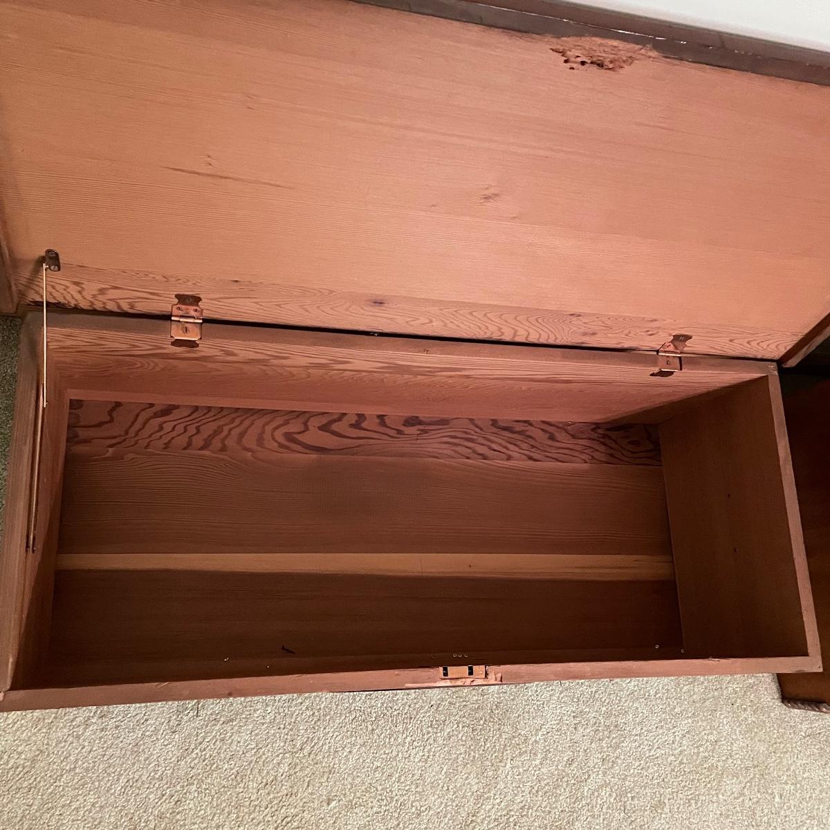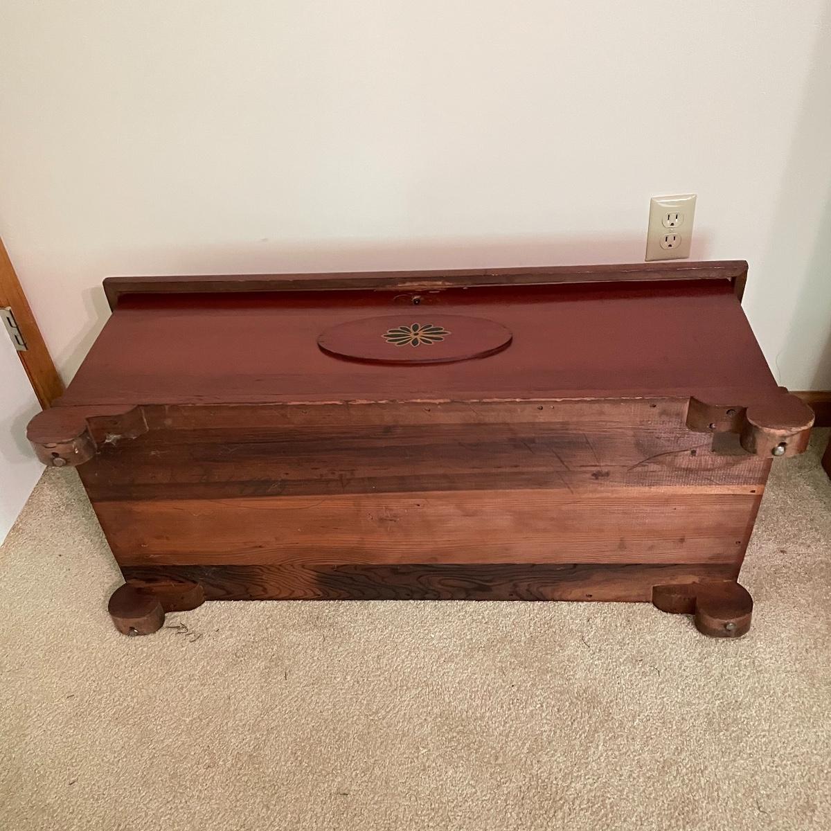 A beautiful reddish brown cedar chest with a hand painted flower. The chest appears to be in fantastic condition inside and will keep your treasures nice and clean. Some wear is noted in photos, but piece is sturdy and in fine shape. The lock has been removed with wear showing near it. Piece measures 40” x 17.5” x 15.5”. The feet are attached with screws, three are a bit wobbly, but it appears it’s only noticeable when manually moving the feet, it’s not noticeable when using chest. The back has residue from a sticker,See images. Local pick up only.