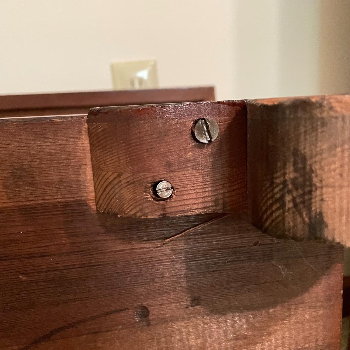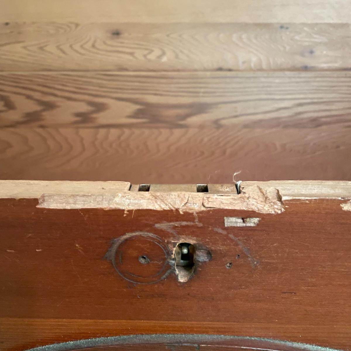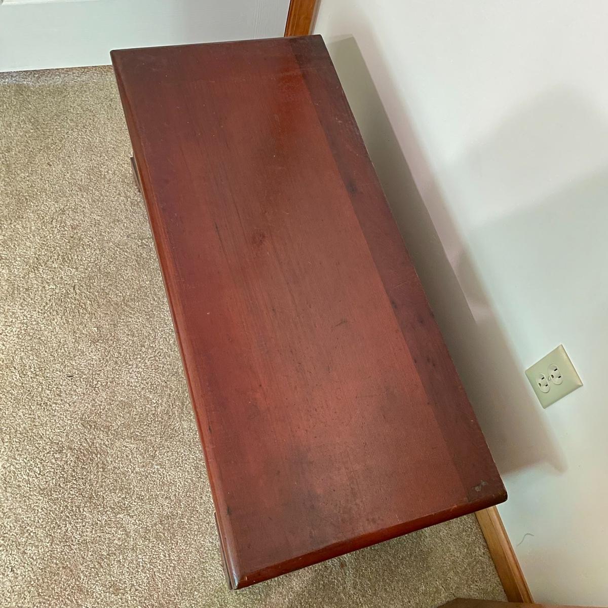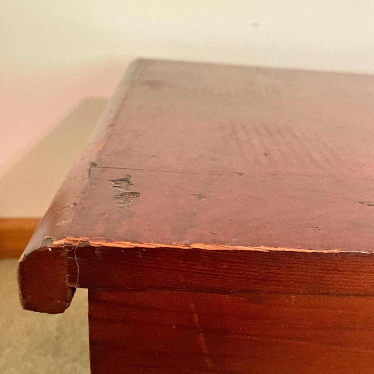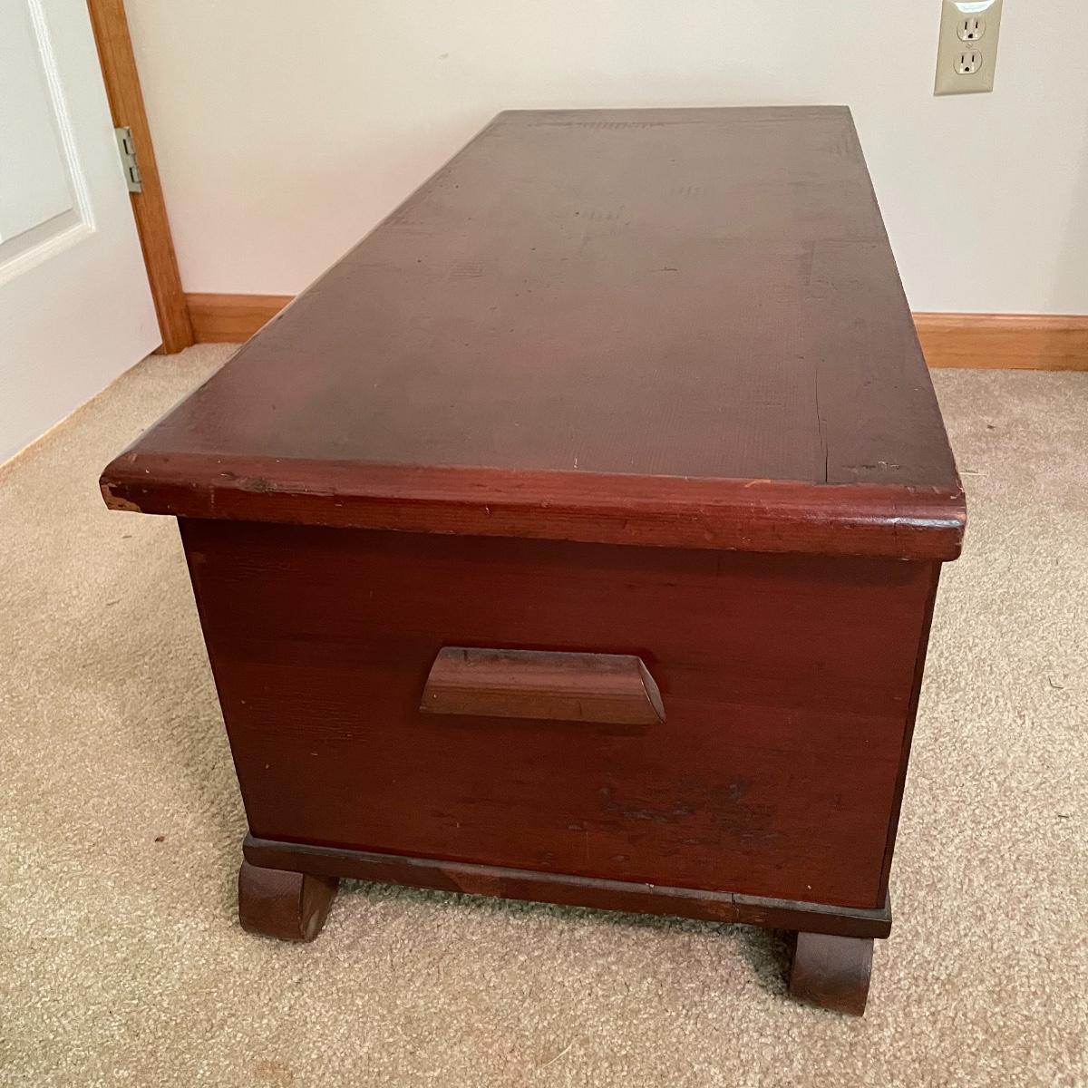 A beautiful reddish brown cedar chest with a hand painted flower. The chest appears to be in fantastic condition inside and will keep your treasures nice and clean. Some wear is noted in photos, but piece is sturdy and in fine shape. The lock has been removed with wear showing near it. Piece measures 40” x 17.5” x 15.5”. The feet are attached with screws, three are a bit wobbly, but it appears it’s only noticeable when manually moving the feet, it’s not noticeable when using chest. The back has residue from a sticker,See images. Local pick up only.