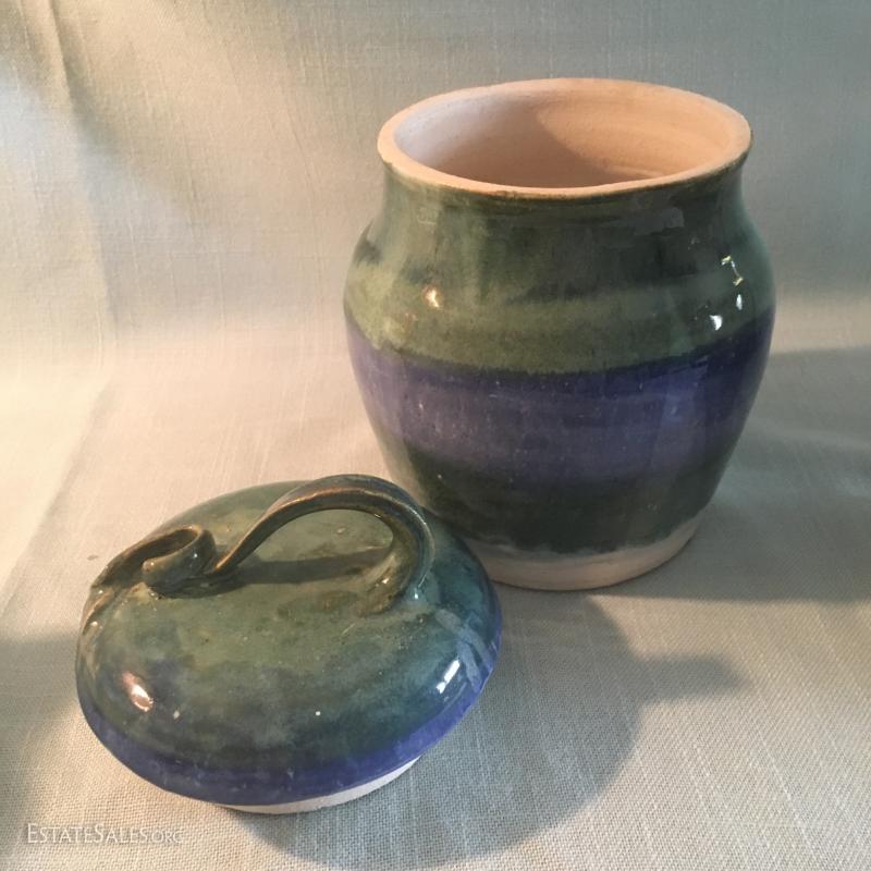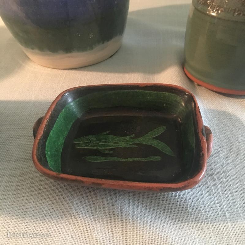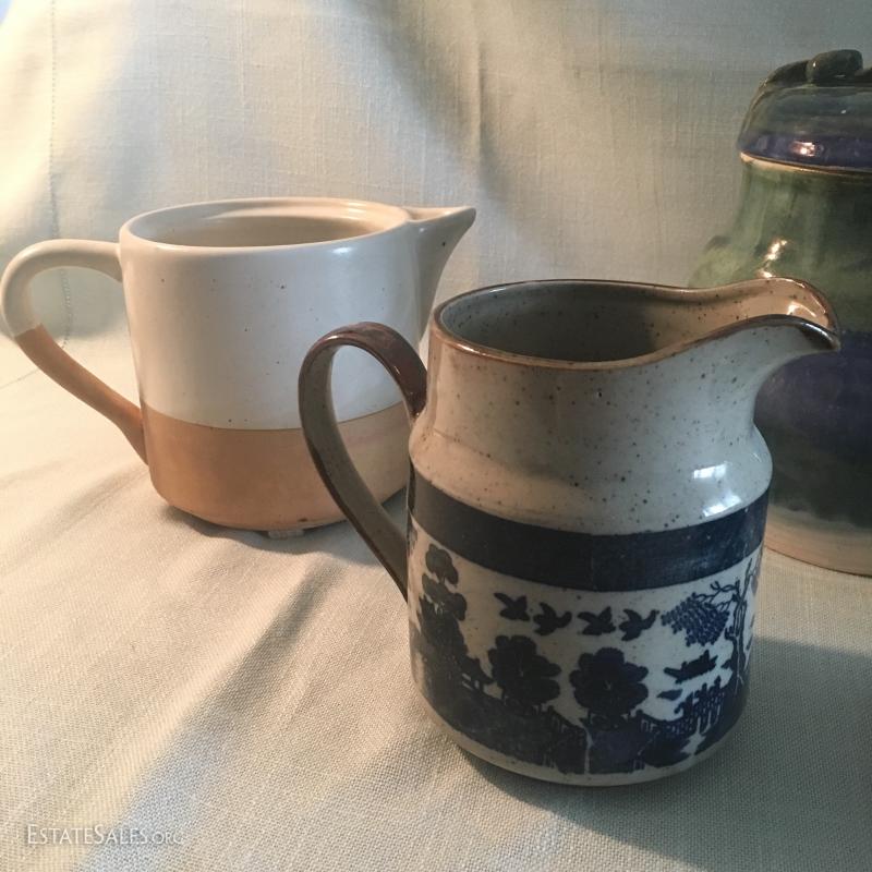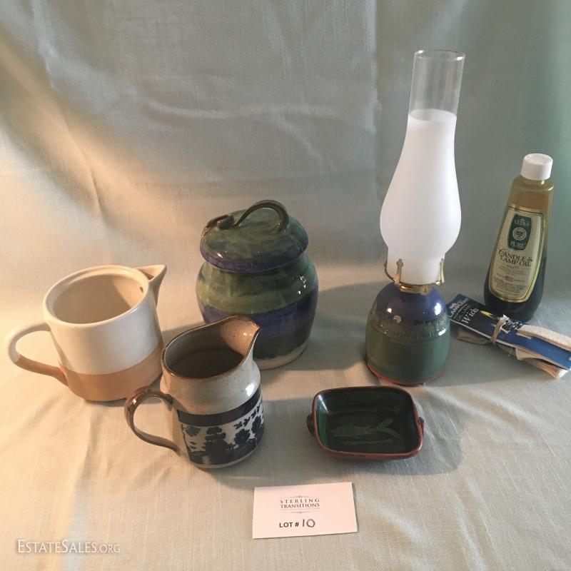 Ceramic oil lamp, with extra oil and wicks. Canister. Two pitchers and Dish. See photos for details.