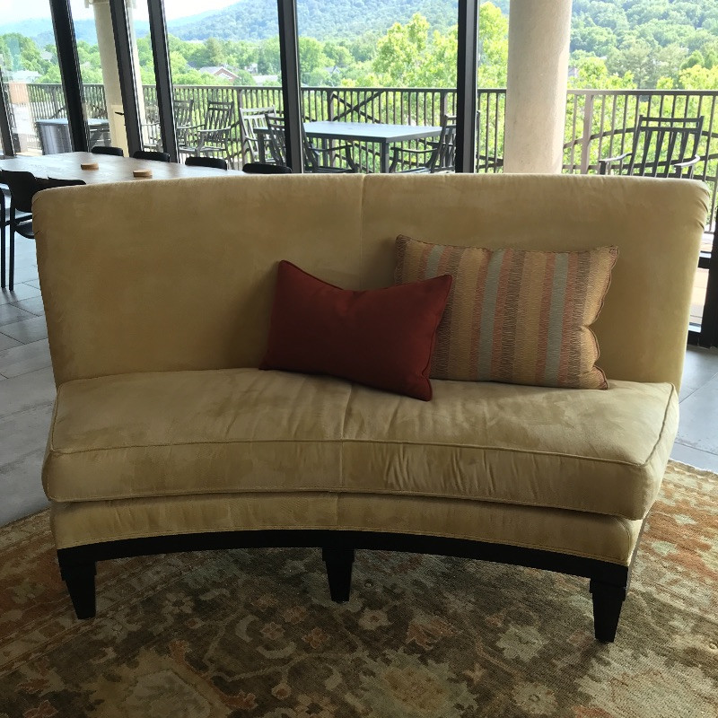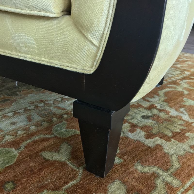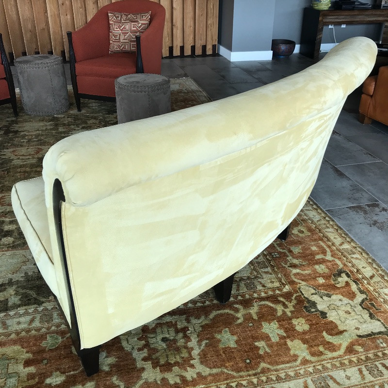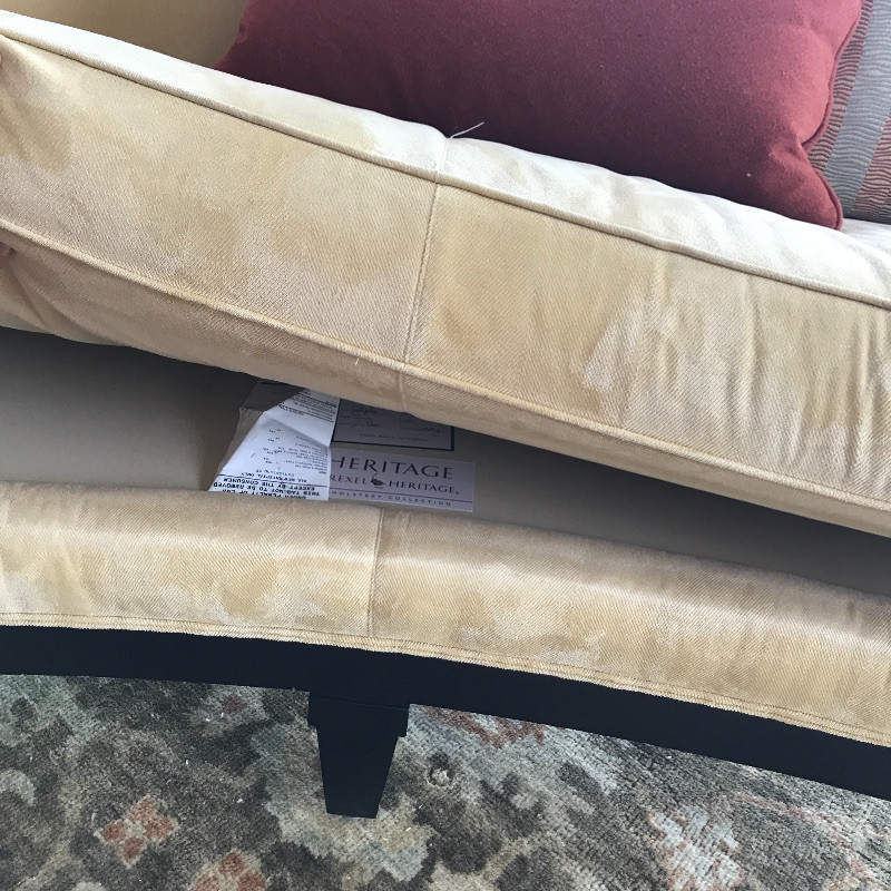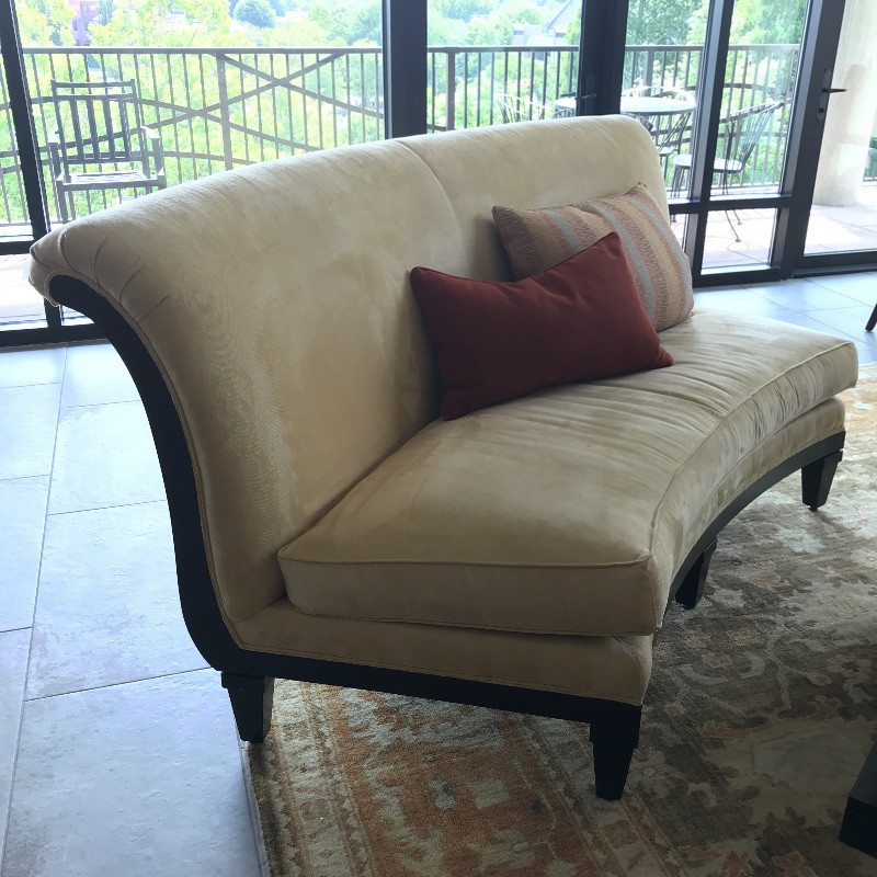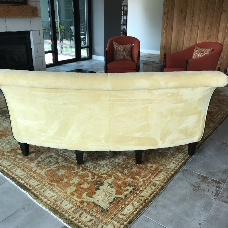 This nice buttery yellow colored couch is crafted by Drexel Heritage. The material feels like a textured ultra suede that is soft to the touch and darkens if you rub one direction versus the other (so it looks like there are marks but that is just the material). There are however a few small dark stains on seat that are not too noticeable, see images. Measures 83” x 42” x 38”.