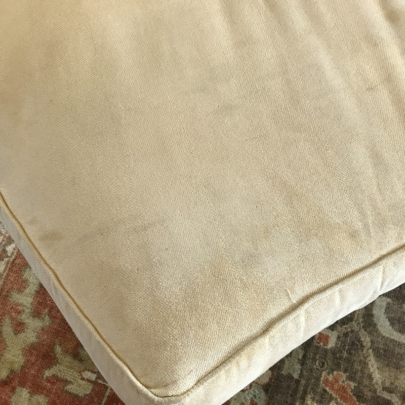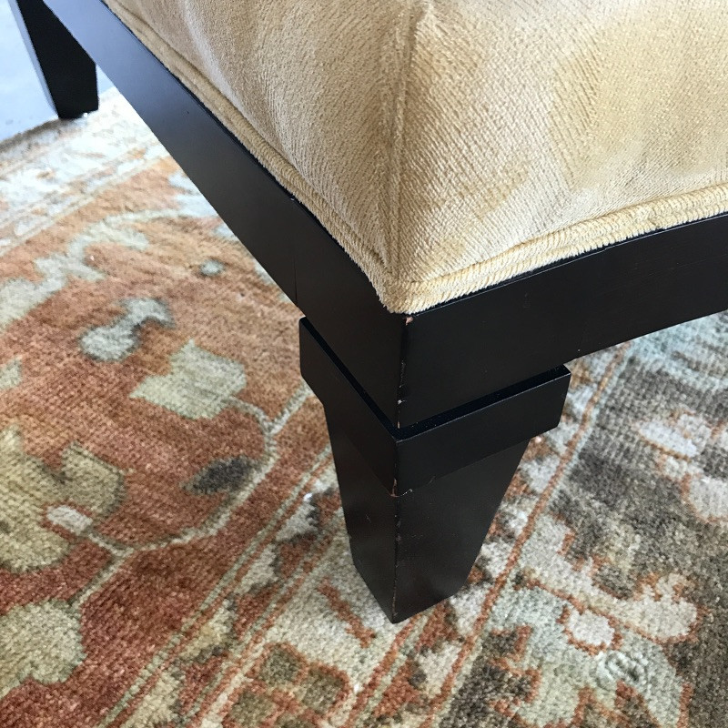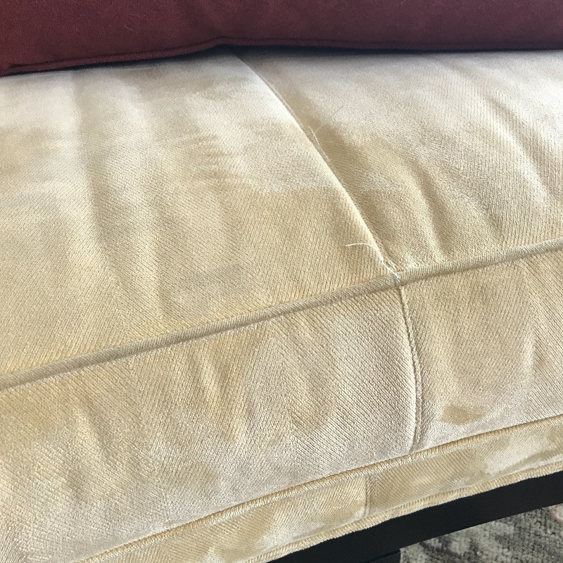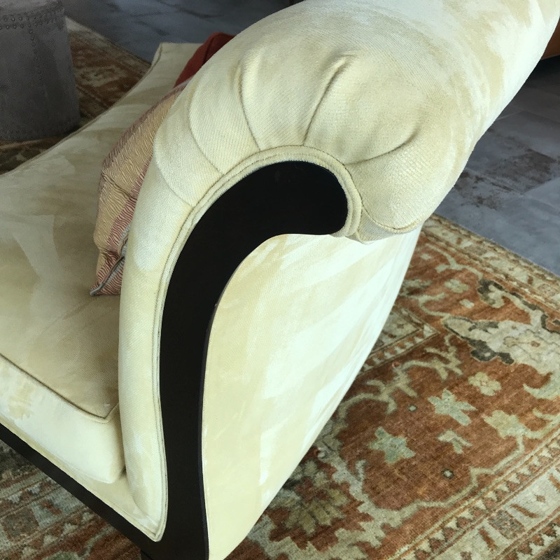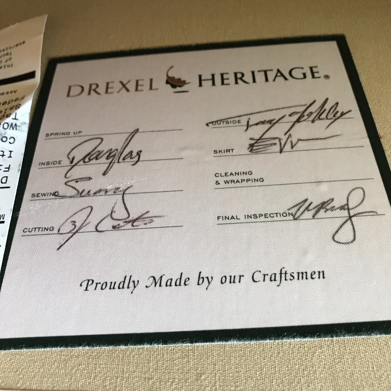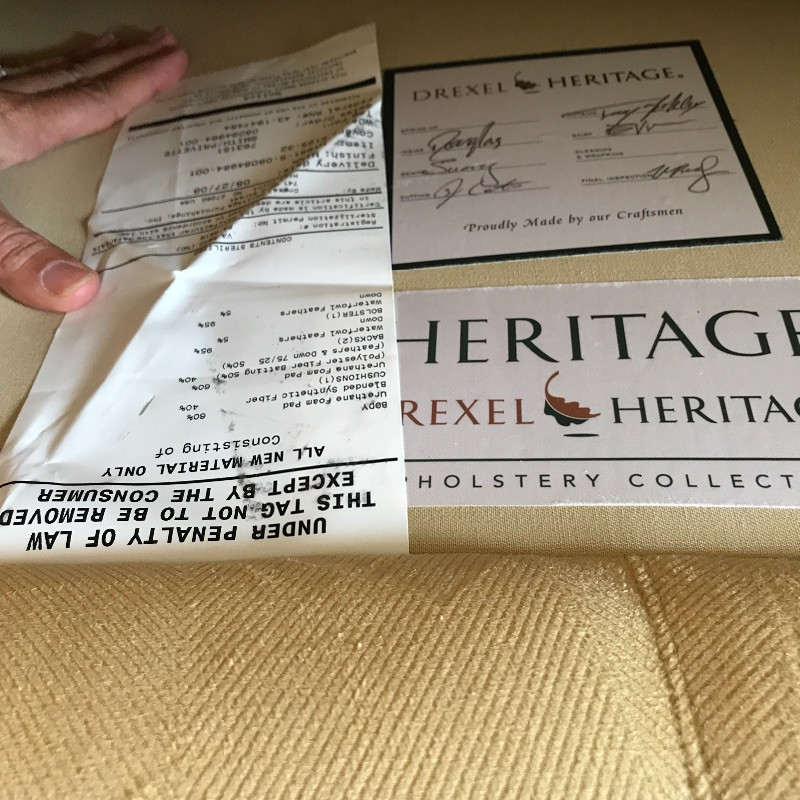 This nice buttery yellow colored couch is crafted by Drexel Heritage. The material feels like a textured ultra suede that is soft to the touch and darkens if you rub one direction versus the other (so it looks like there are marks but that is just the material). There are however a few small dark stains on seat that are not too noticeable, see images. Measures 83” x 42” x 38”.