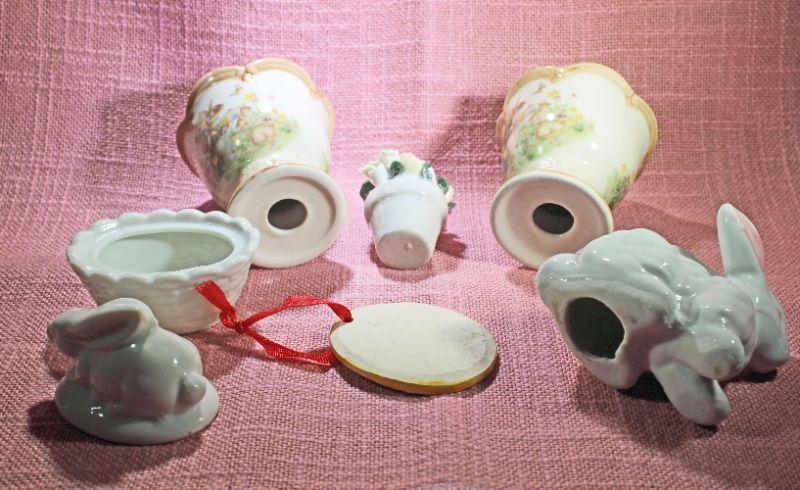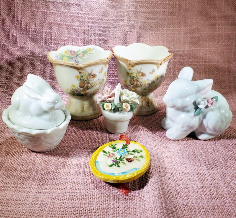 2 vintage egg cups, porcelain bunny on basket, very small flower basket, porcelain bunny and pottery hanging ornament All are @ 2" tall