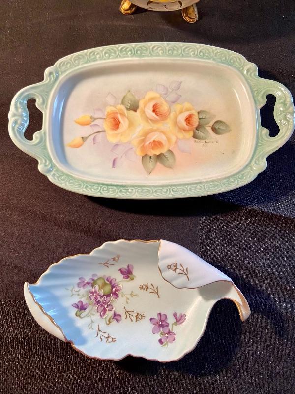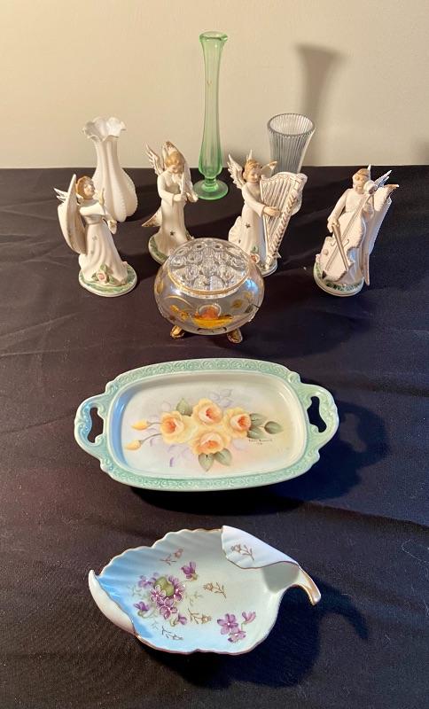 3 vases, tallest is 8.5 inches, 4 angel figurines playing instruments, a glass flower holder, and 2 dishes.