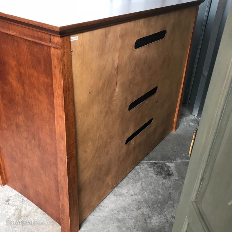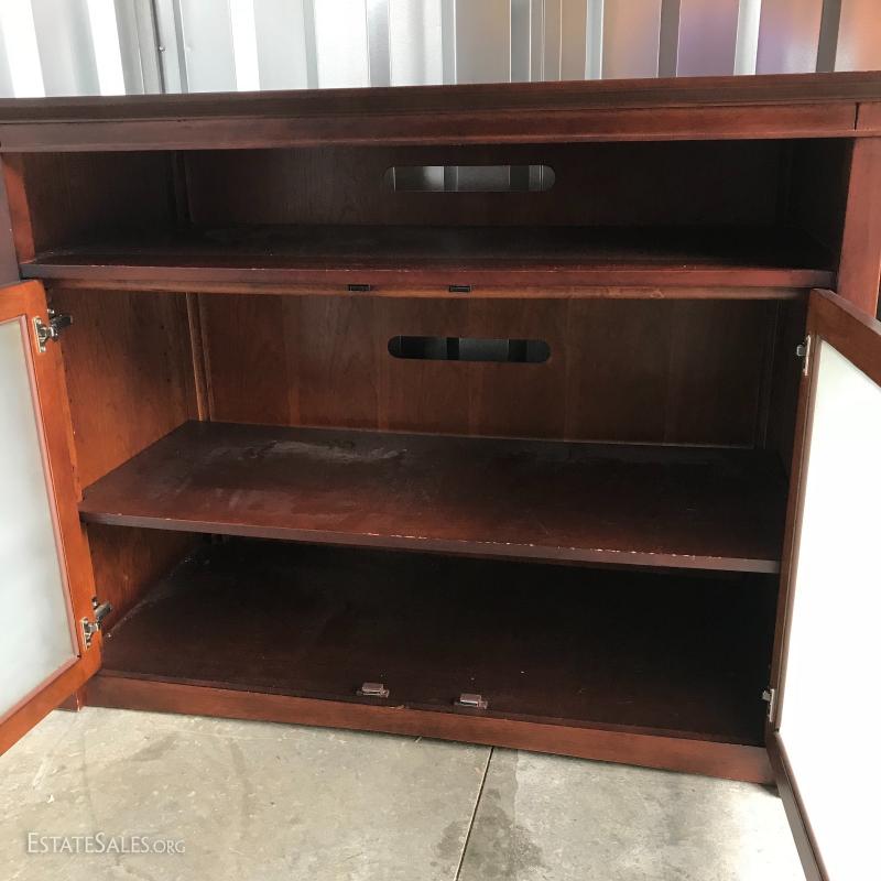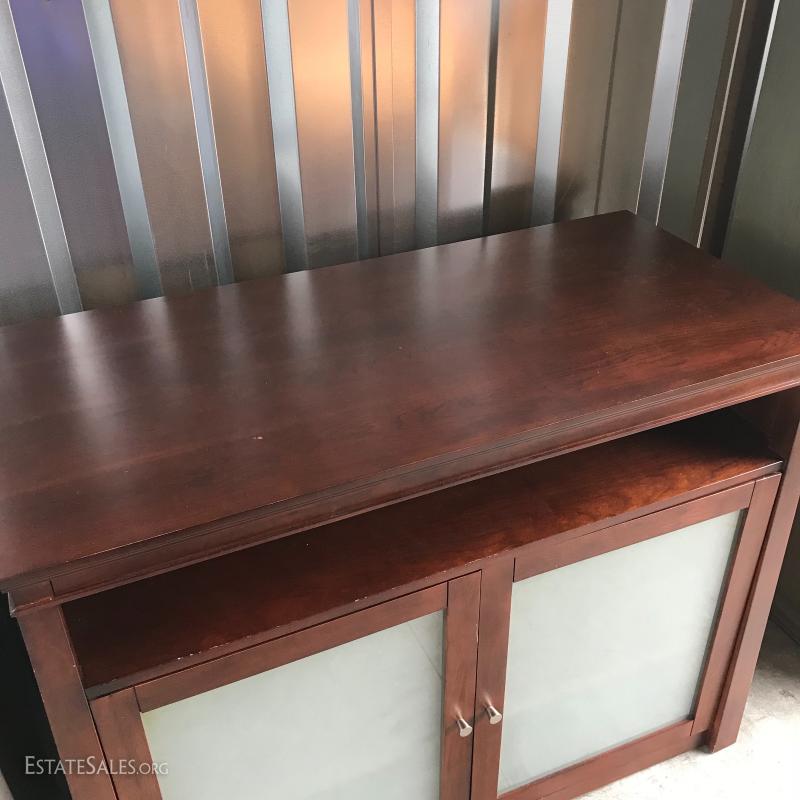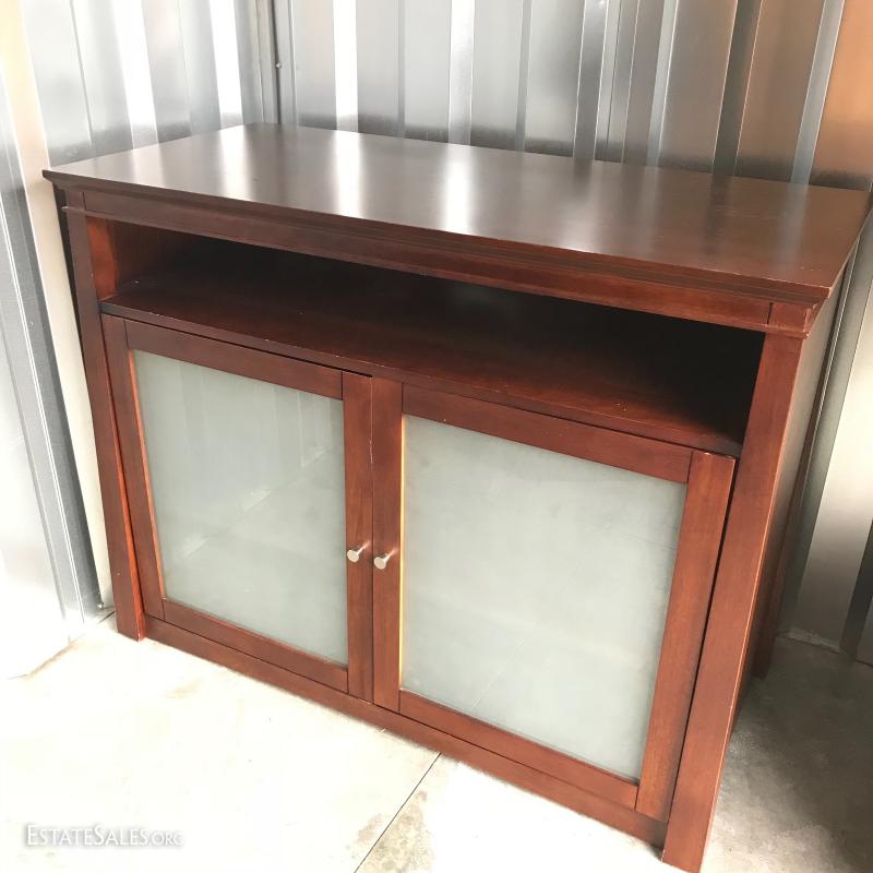 Dark manufactured wood with frosted glass front cabinets. Measures 46” x 22” x 36”. One open shelf and two in cabinet. This item is available for local pick up only in Asheville, NC.