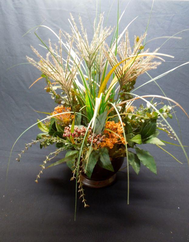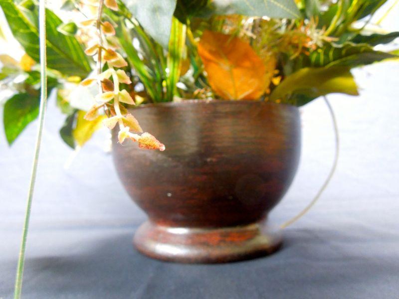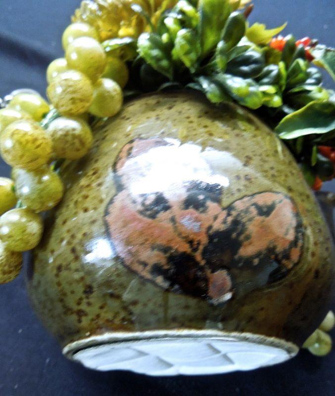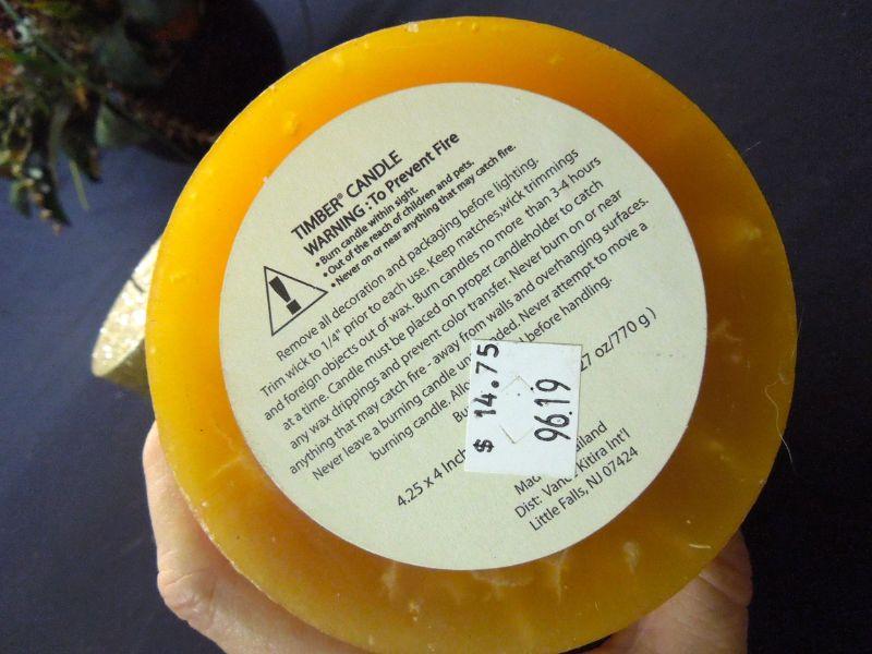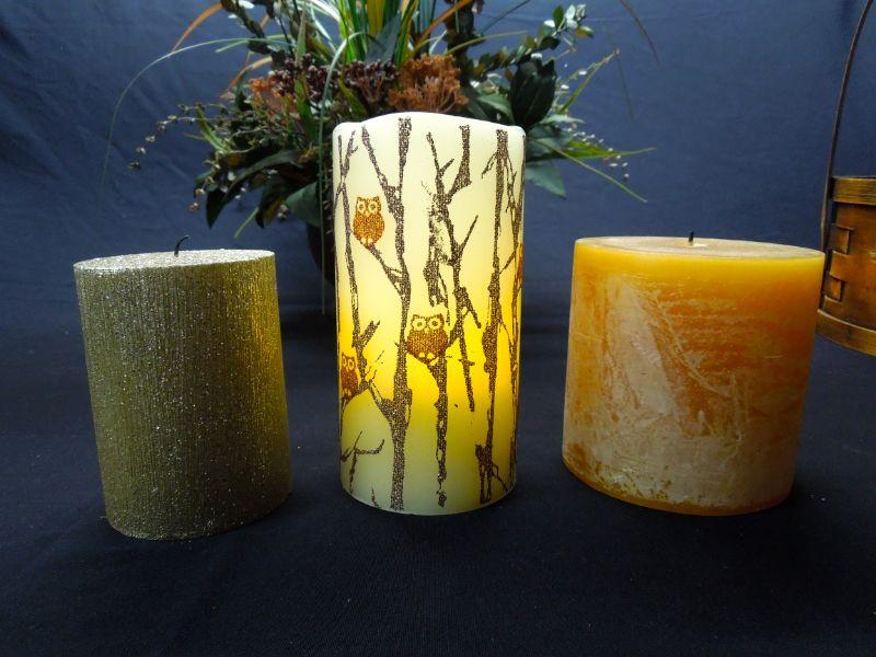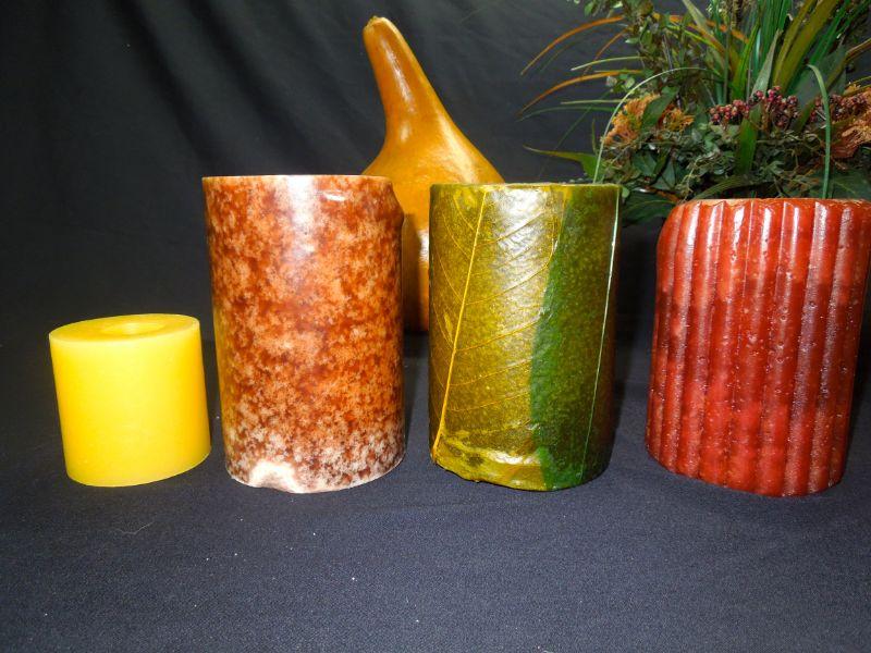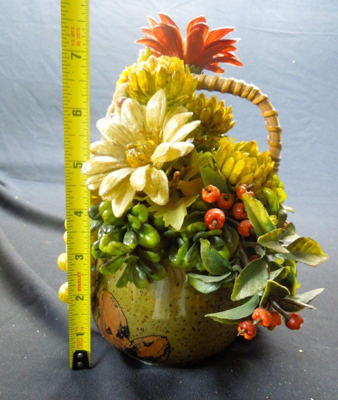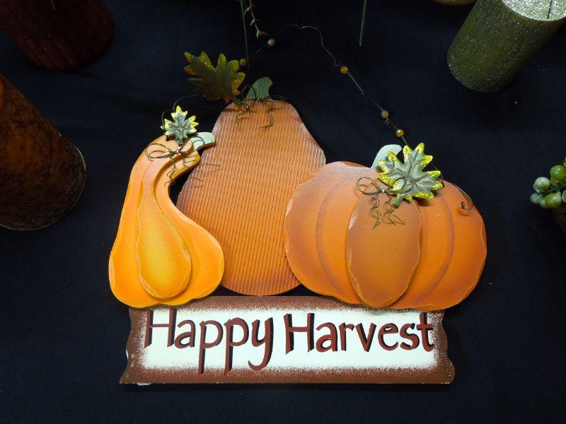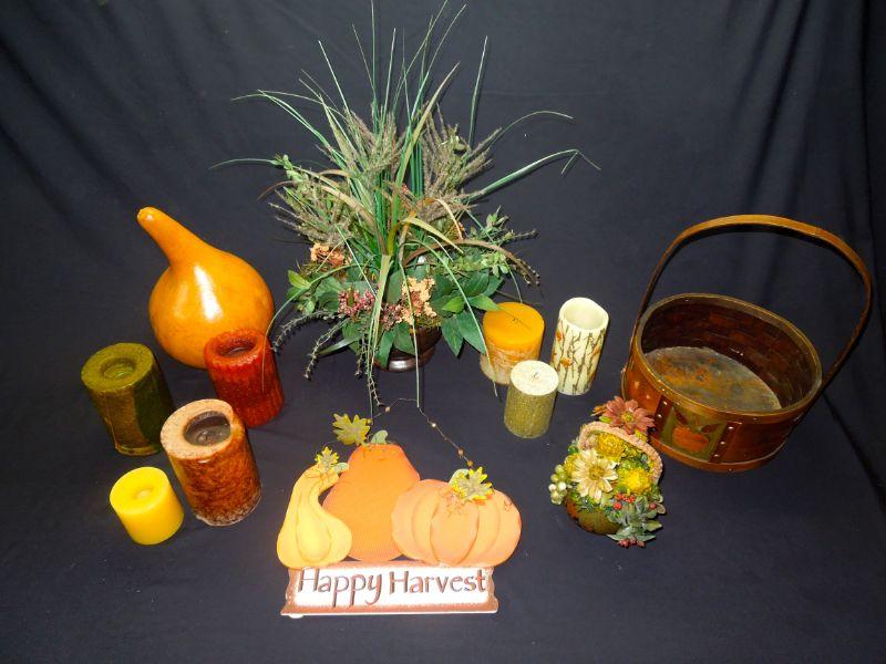 A door sign with pumpkin; a wooden basket with apple motif (punctured); 7 candles (some wrapped in natural foliage); 2 floral arrangements in clay vases; a 12" natural gourd. Candles smell really good!