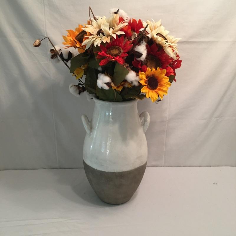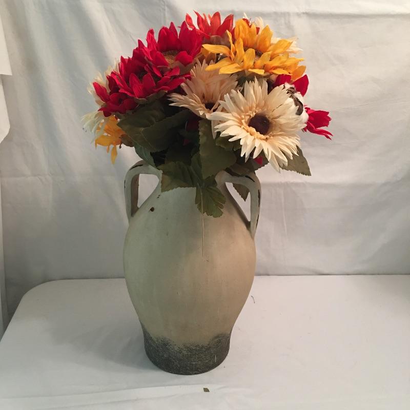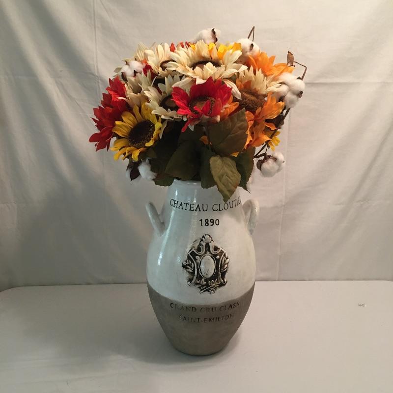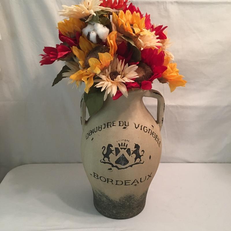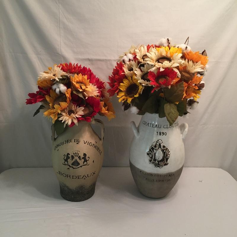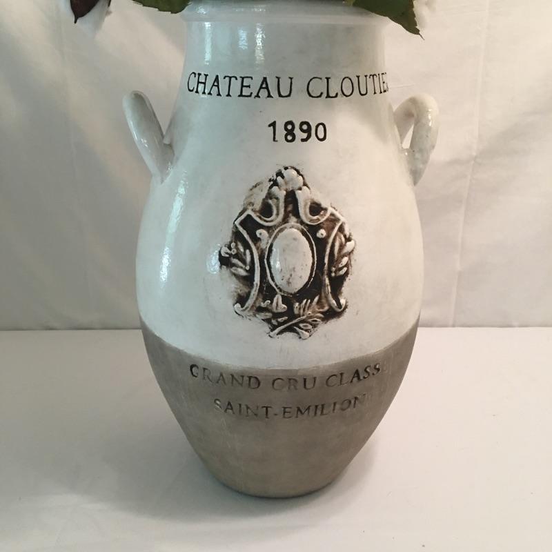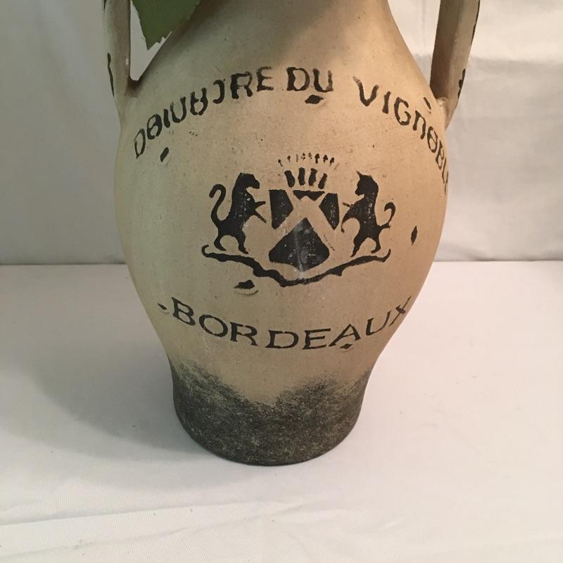 This is a cool pair of ceramic French carafes with one marked Chateau Cloutier 1890 and the smaller one marked Doiubore Du Vignoble will bring color and cheer to your home. Largest carafe with flowers measures 9”D x 28”.