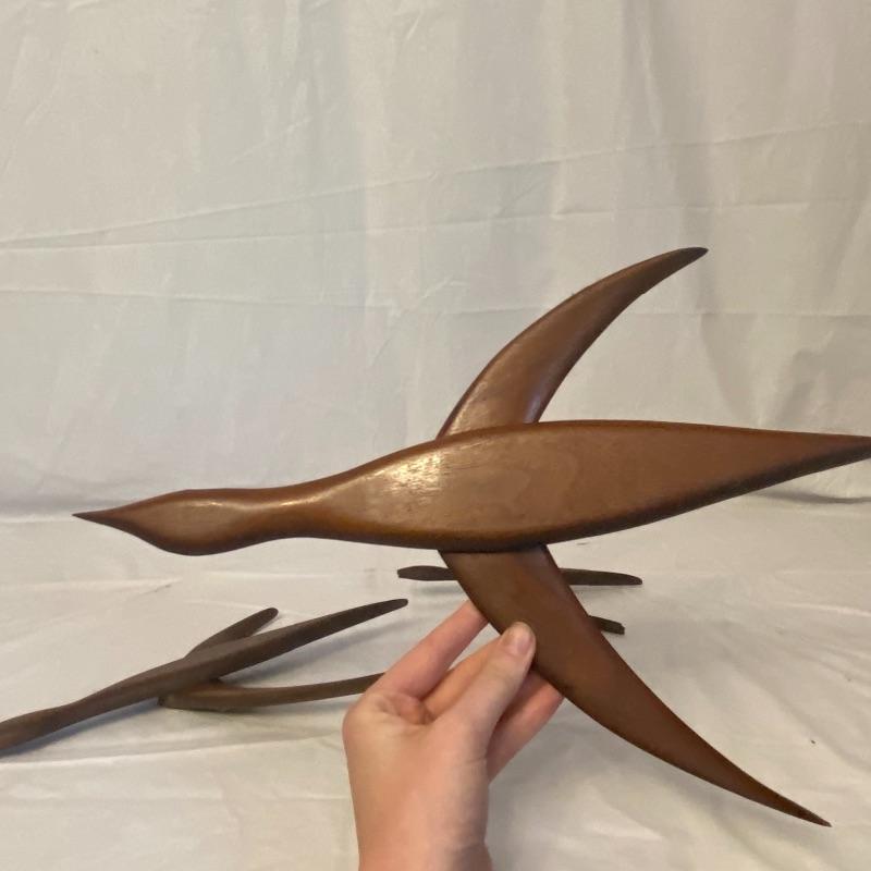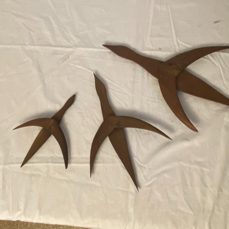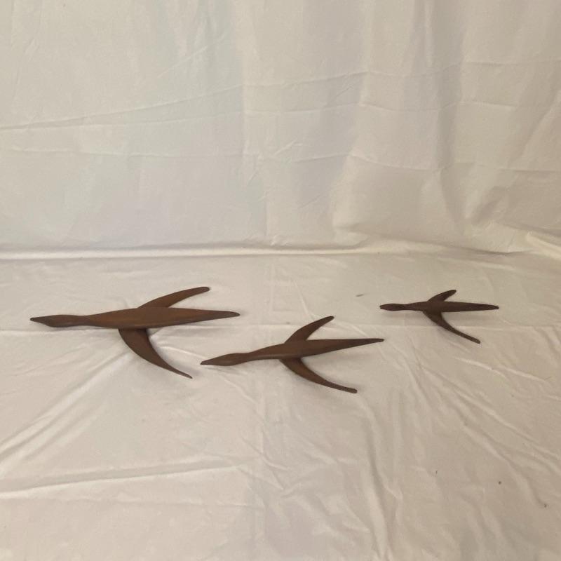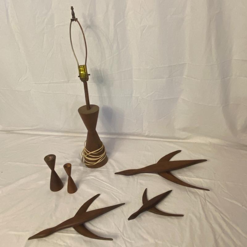 Adorable MCM decor! Lot includes set of three flying geese with a few chips around the beak and wings, see photos. Lamp and candle holders that all pair beautifully together. Shipping available.