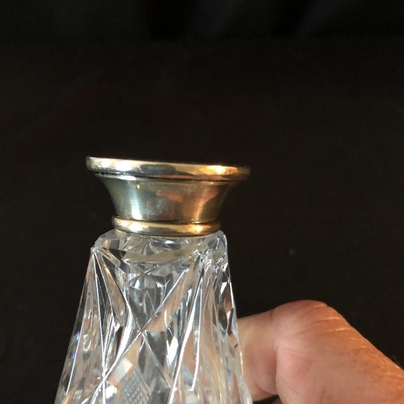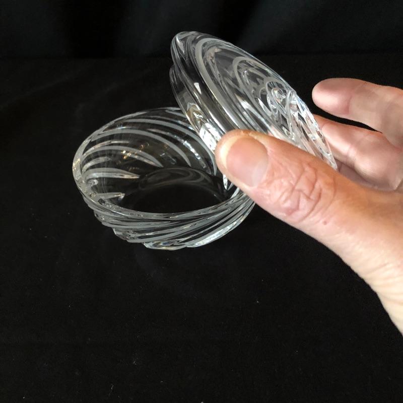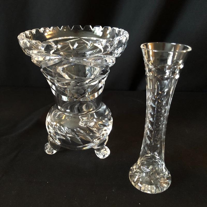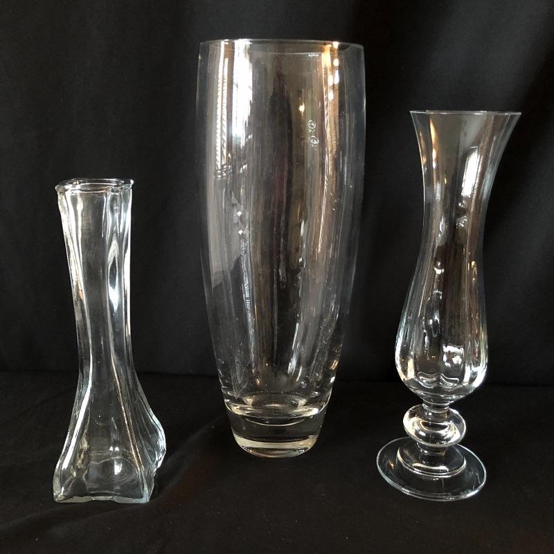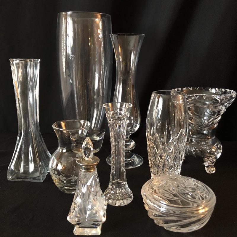 Seven vases in this lot altogether in a great range of sizes. Also included is a small lidded candy bowl and a perfume bottle. See images for measurements.