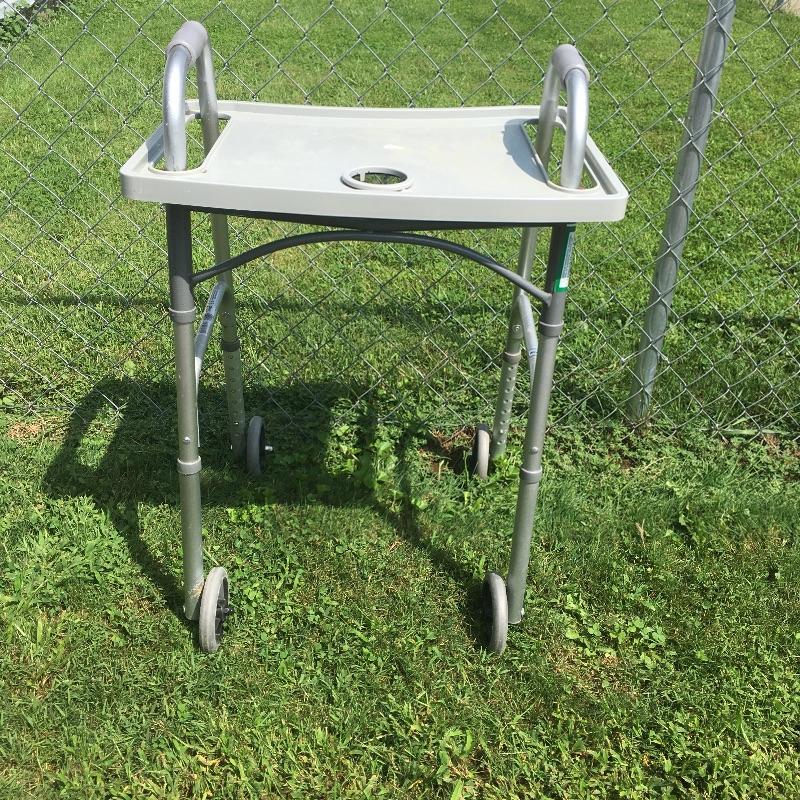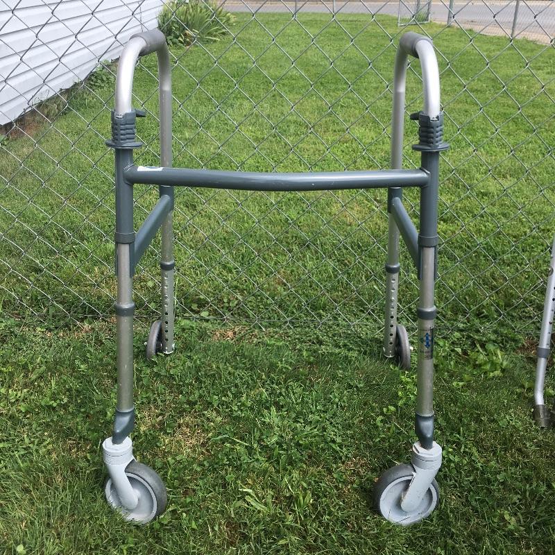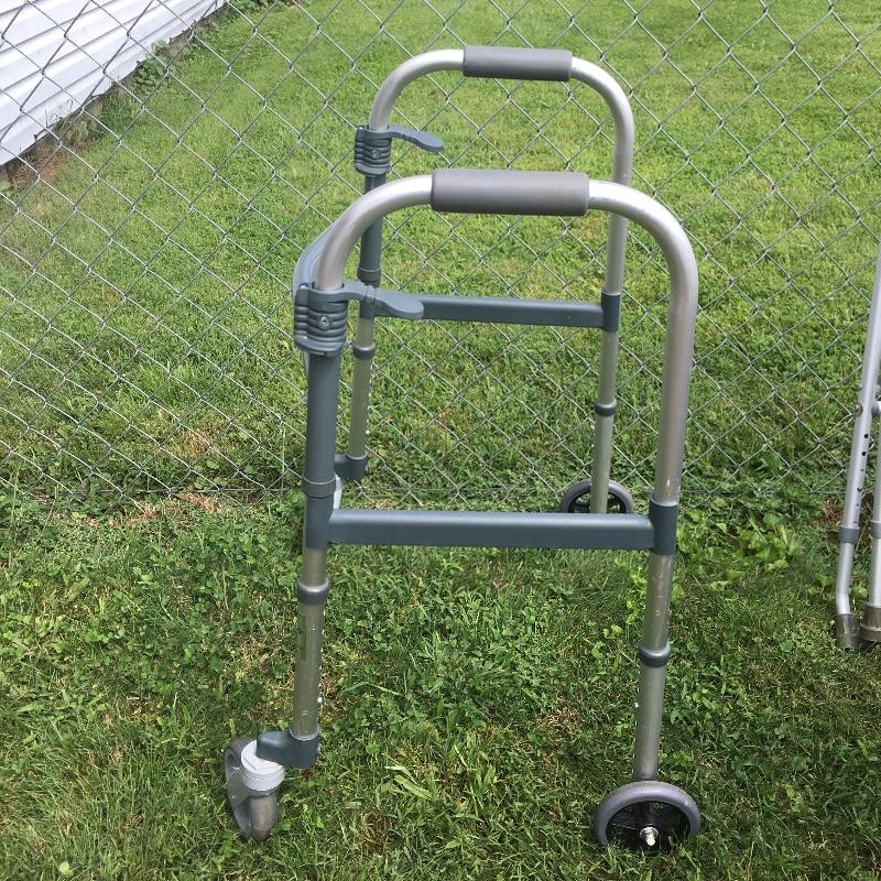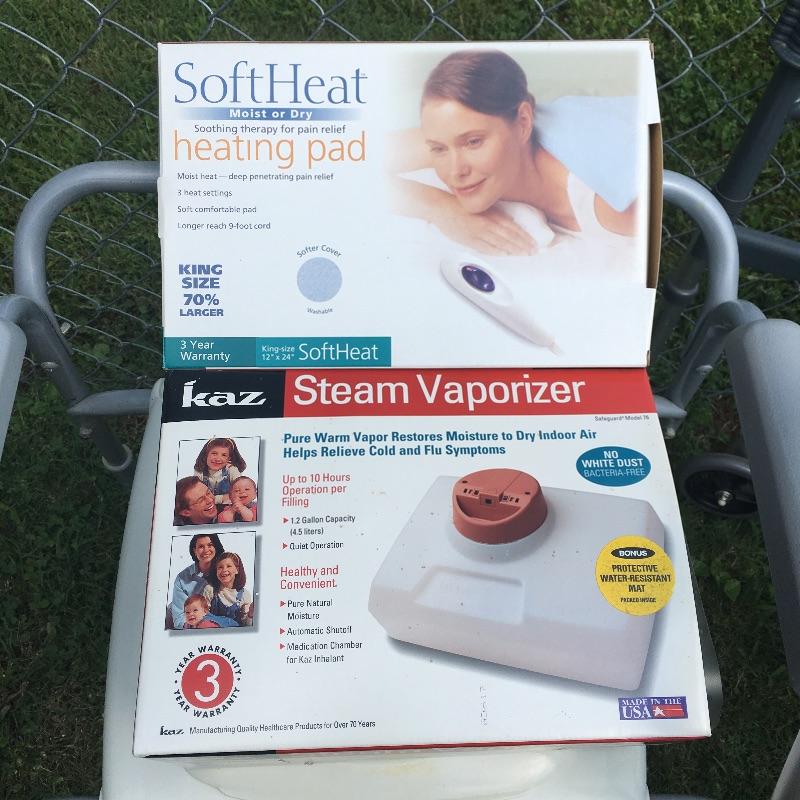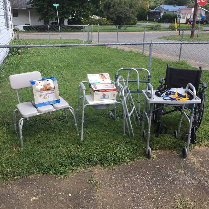 A great assortment of home health products that includes Drive wheelchair, heating pad, walker, walker with tray, portable toilet, four legged cane, shower chair, foot massager and chair. Steam vaporizer and foot massager were not tested. Heating pad worked when tested.