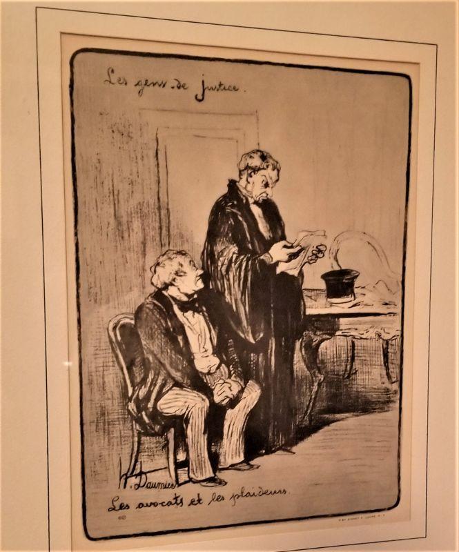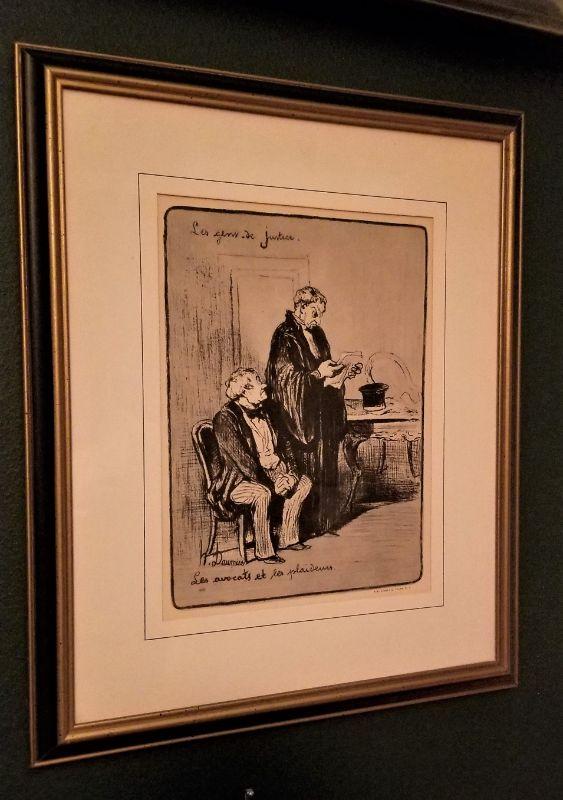 Perfect for a law office! Here is an interesting French print entitled "Les Gens de Justice" or the Men of Justice. An attorney argues this case for his client, the plaintiff. 19" long and 15 7/8 inches wide.