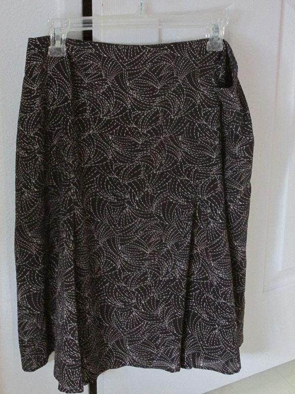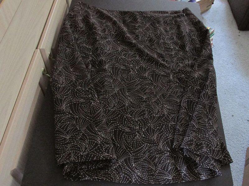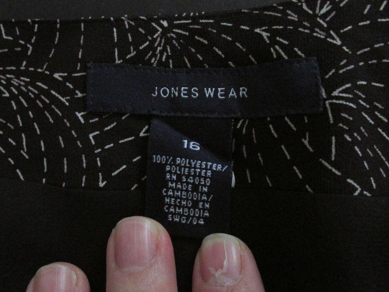 Black with white patterned design Jones Ware skirt. Size 16. 100% Polyester. No significant wear noticed.