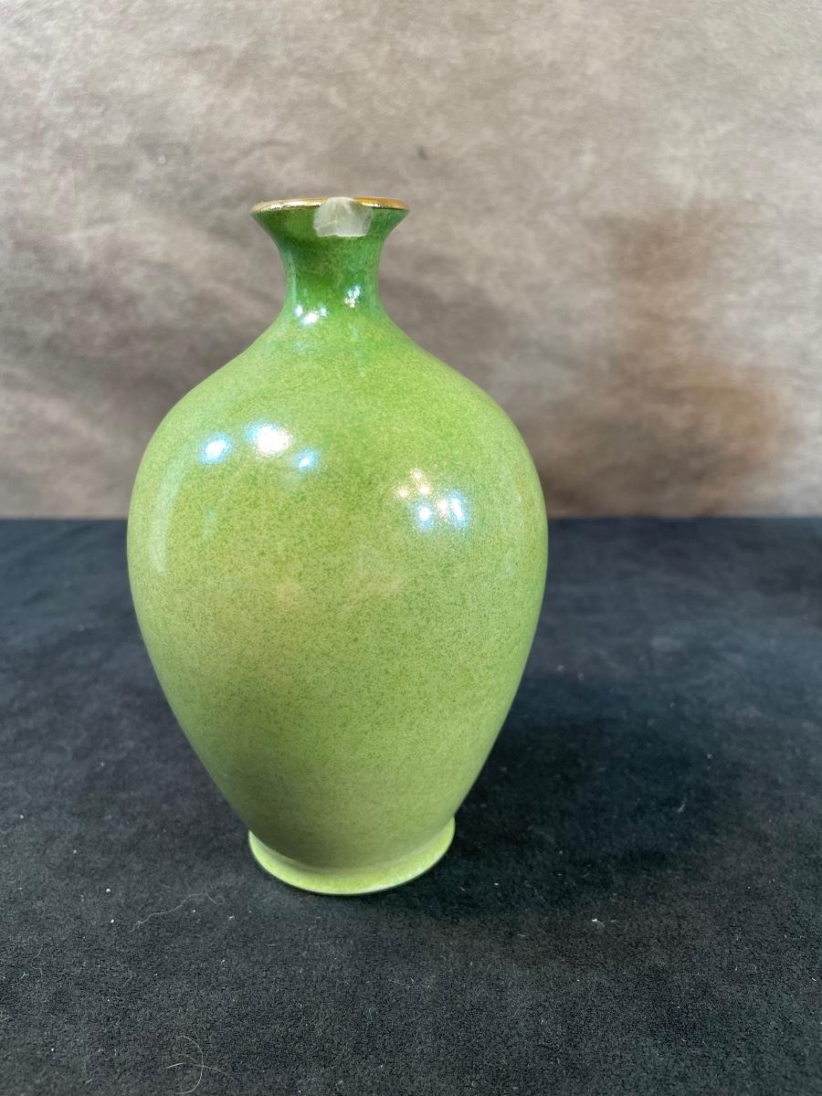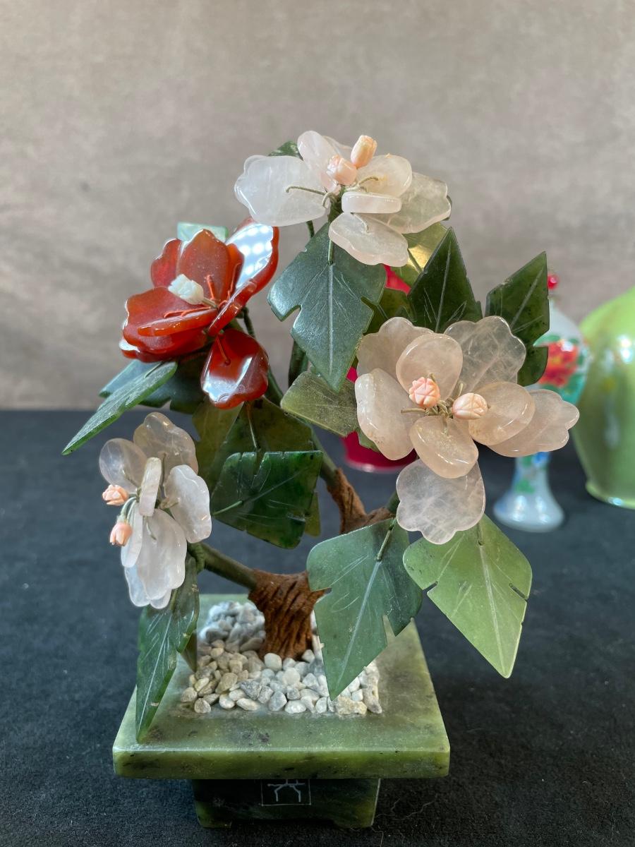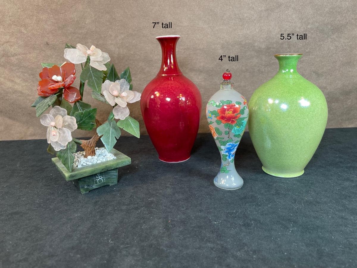 Hand-carved Jade and quartz flowers in a jade planter; tow ceramic vases by Leon Nigrosh (green one has a chip); a glass ornament