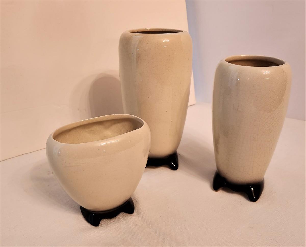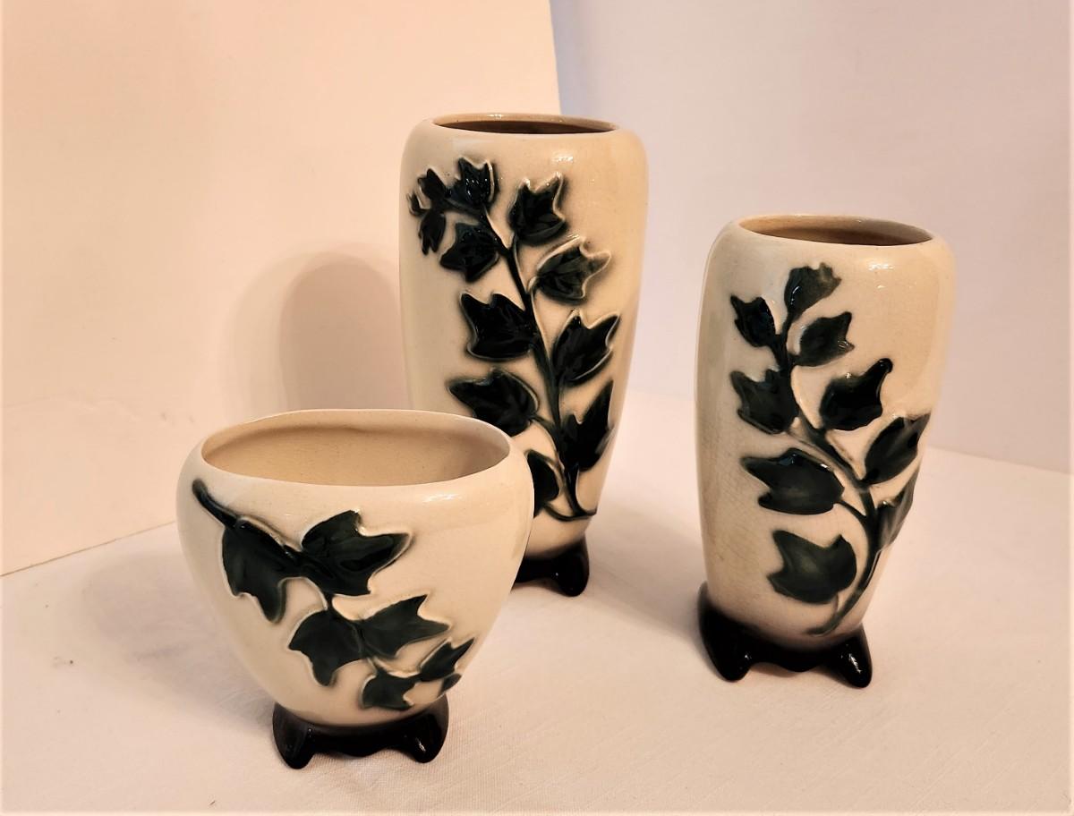 1940's Royal Copley pottery - set of 3 vases with an ivy motif. Great condition. Tallest is 8.25" tall, next is 7", smallest is 4.5". This lady had a collection of this pattern. There will be more later in the sale.