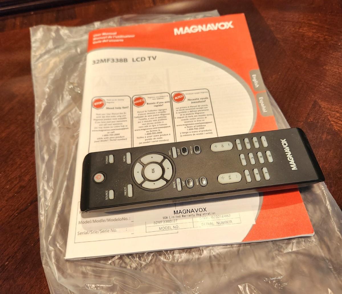Magnavox HDTV LCD 32" Flat Screen tv with book and remote. Working condition. No stand - has wall mount. No batteries in remote. Model #32MF338B.