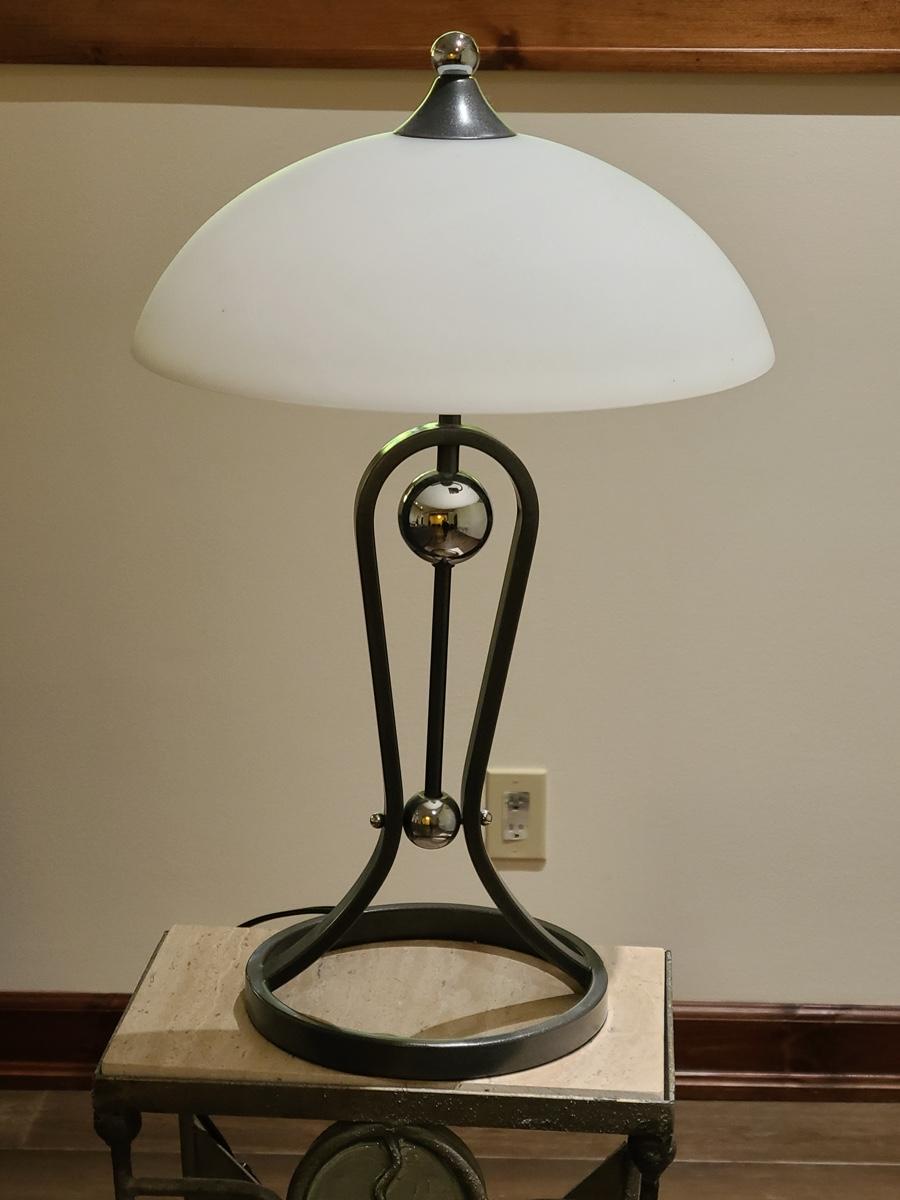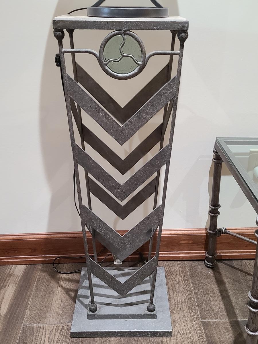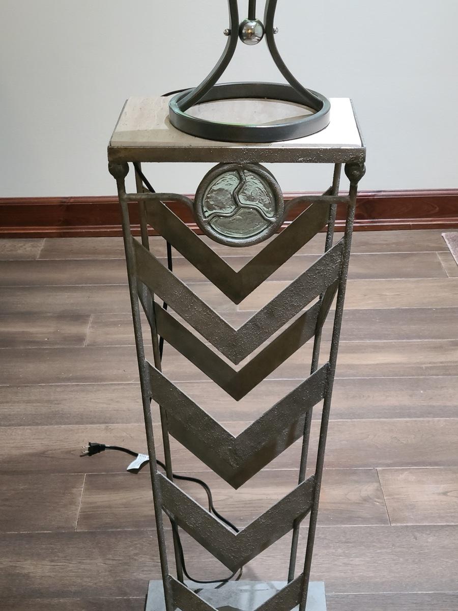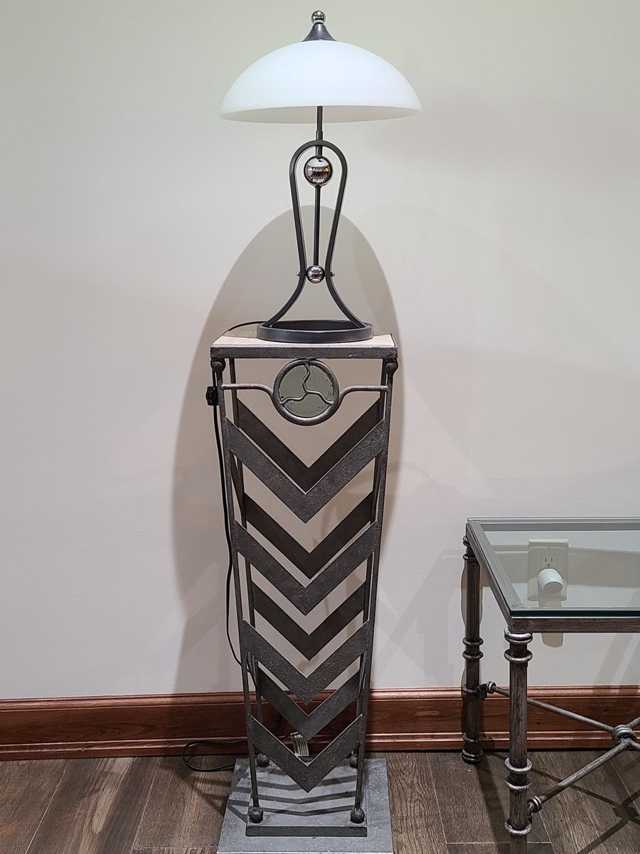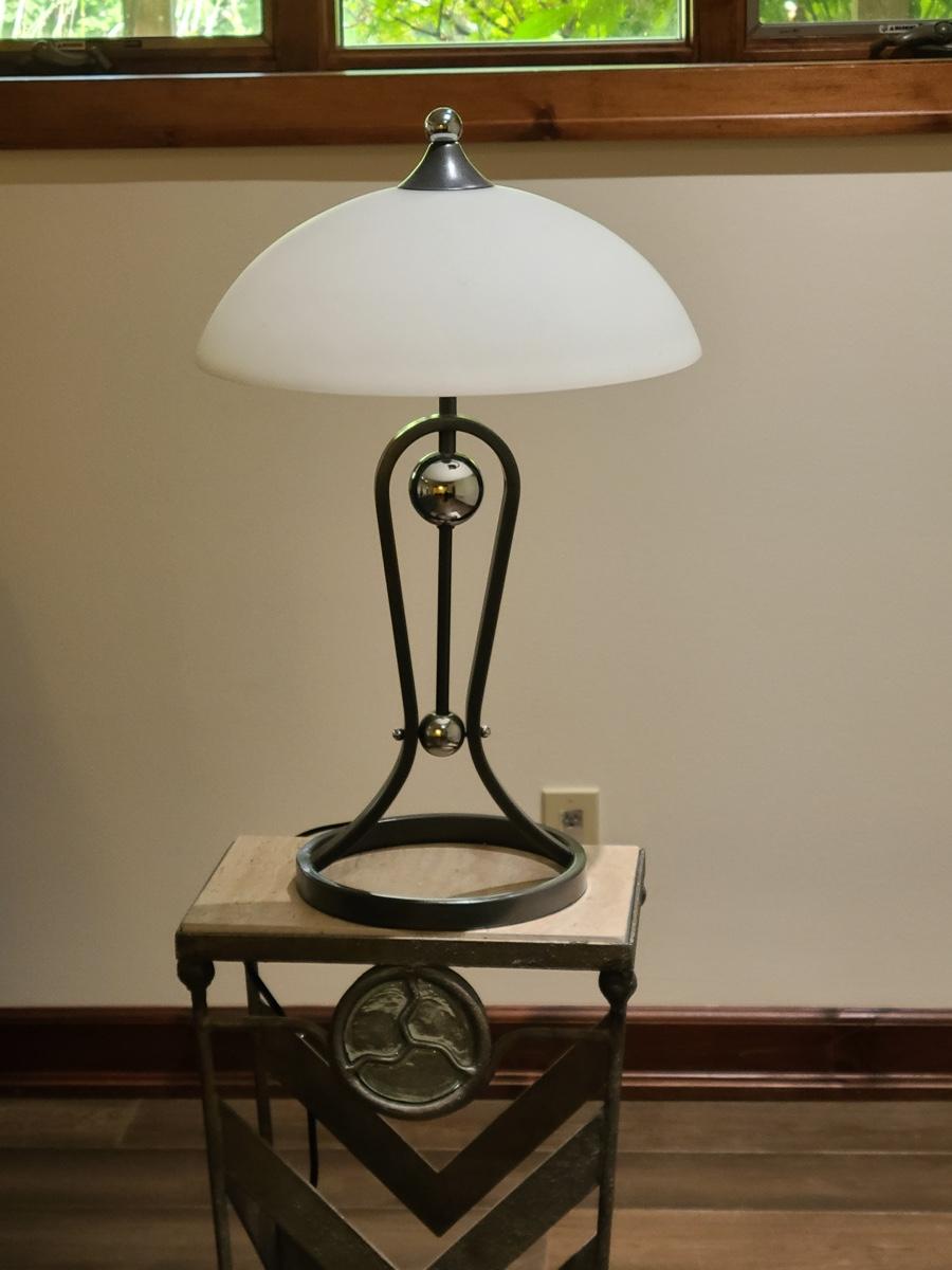 This table is made solid with heavy metal framework accented with glass embellishments on the front. Perfect for a plant stand or accent table. The top is marble and the lamp has silver accents such as chrome and brushed steel. It to is solid. These are on the lower level and will need to be brought upstairs to exit. Please see all pictures as they are the best representation of the items. The pictures show condition, measurements if taken, and what is included in the lot. Due to the large amount that we photograph and the time frame, we are not always able to take measurements. All items unless noted, are pre-owned and have been used. If you purchased furniture, you must bring help. We do not allow one person to carry large furniture out on their own. Bring help, tools and a truck for the safety of our clients homes, and your personal safety. Company policy. Thank you.